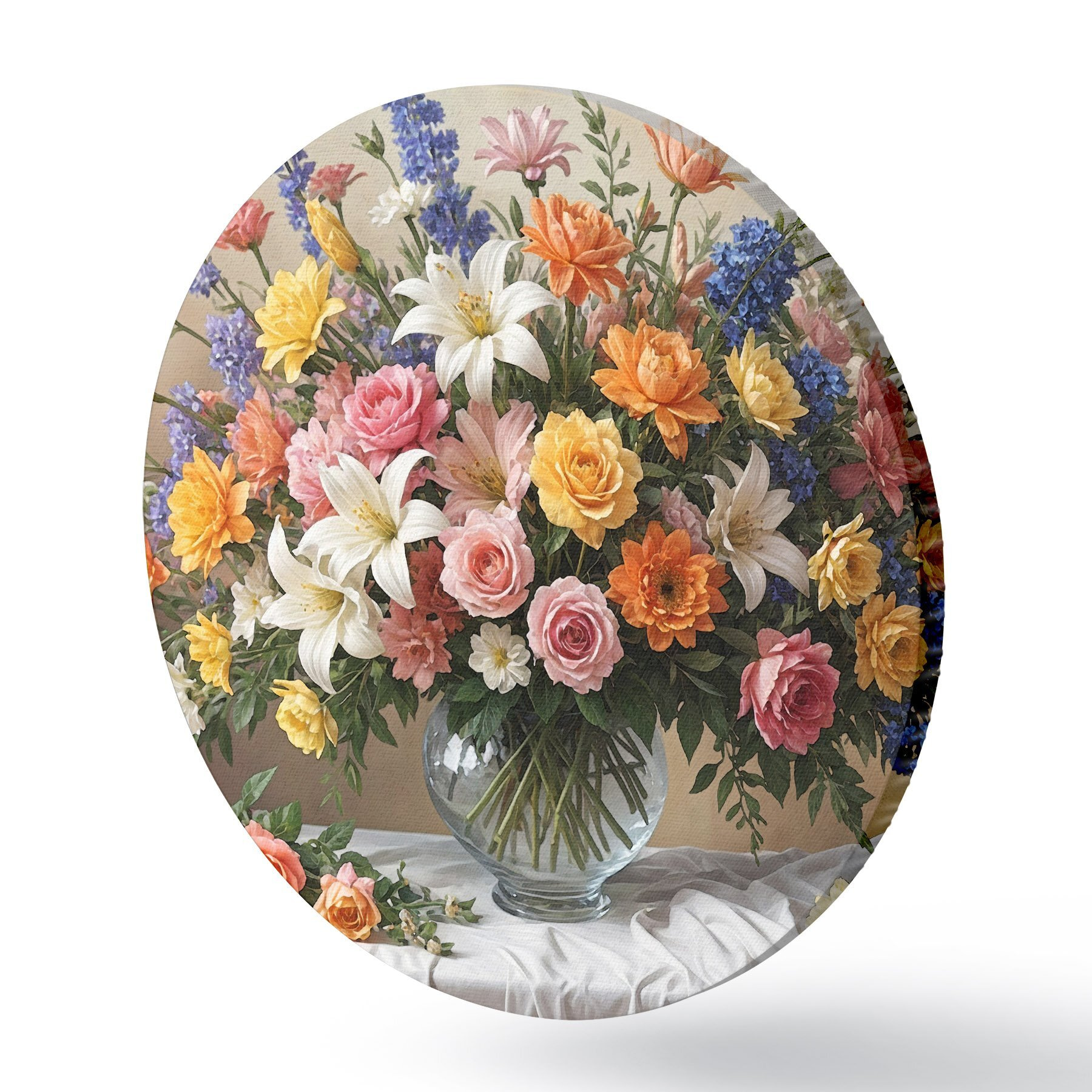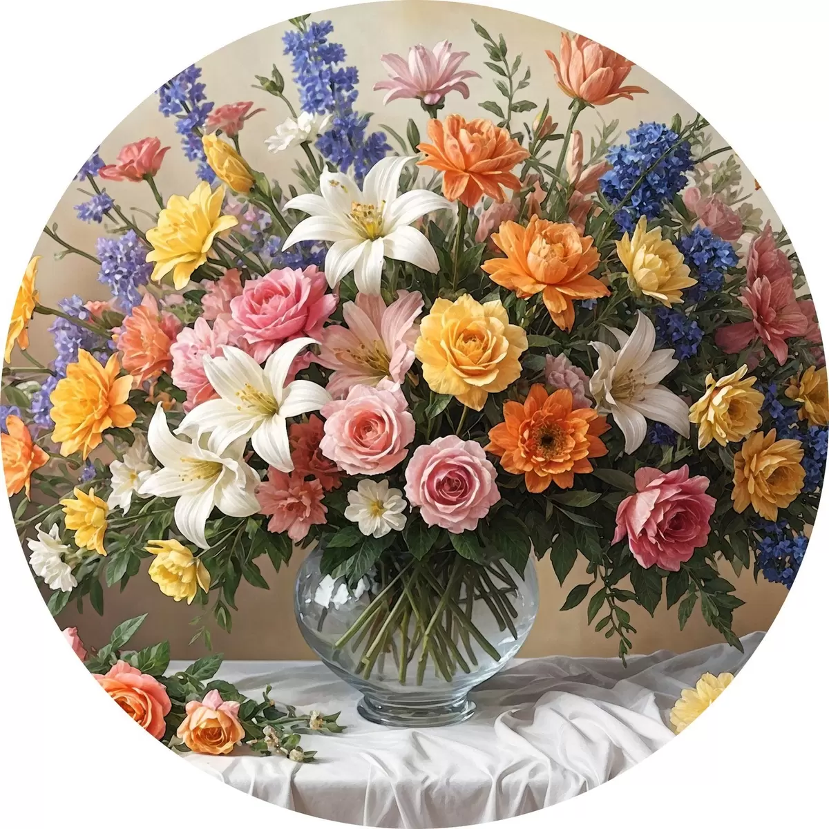 Ronde schilderijen Een levendig boeket van verschillende kleurrijke bloemen in een glazen vaas op een wit tafelkleed, kunstschilderij vintage r38825