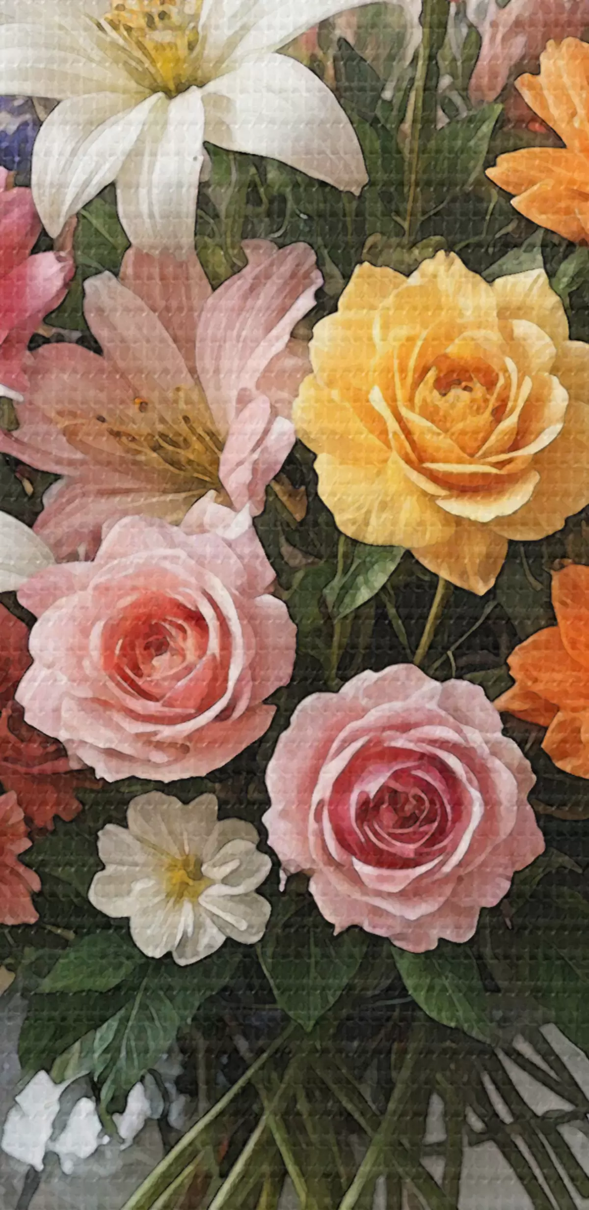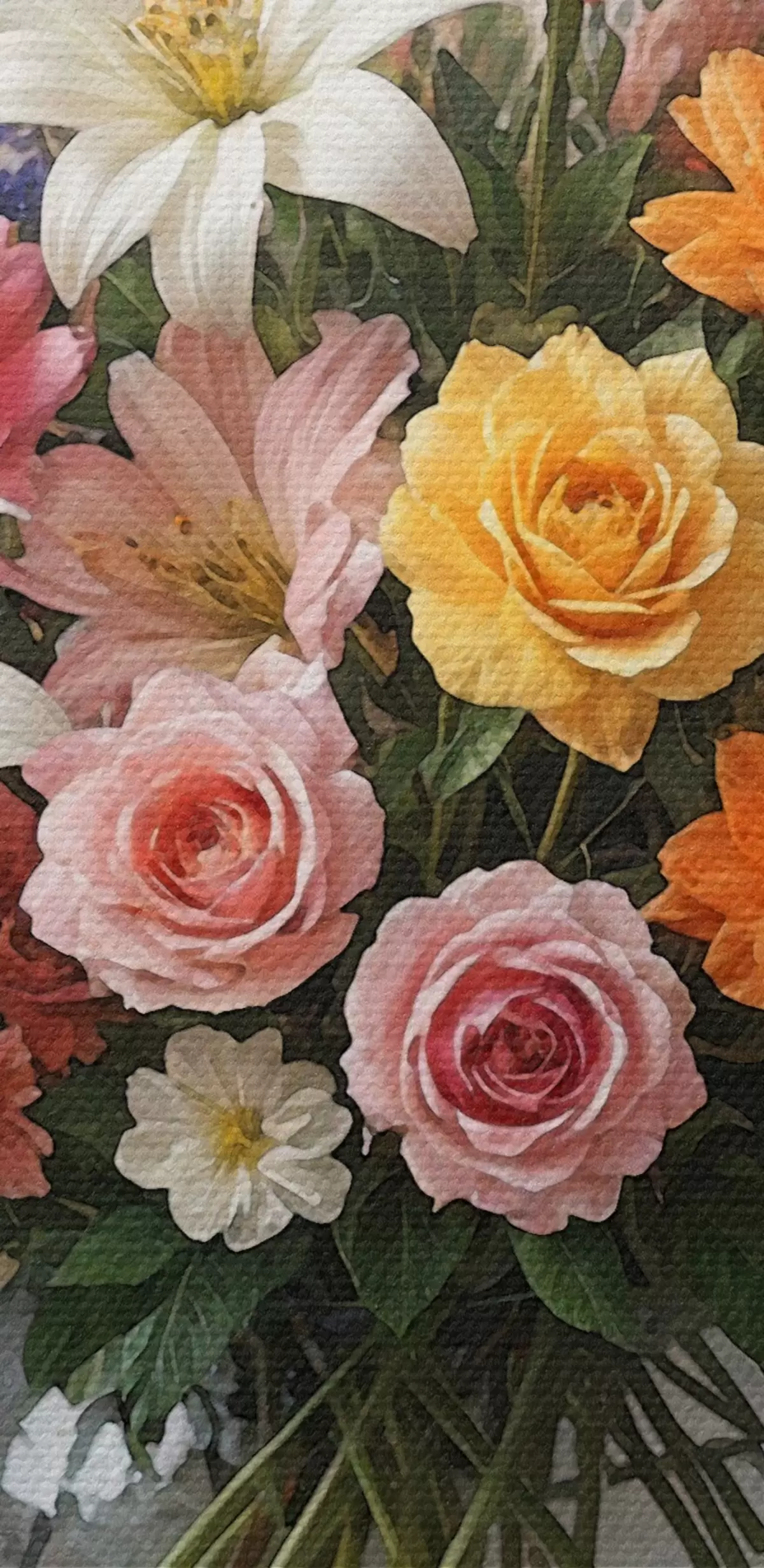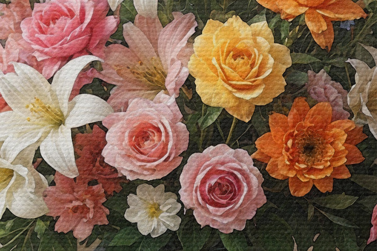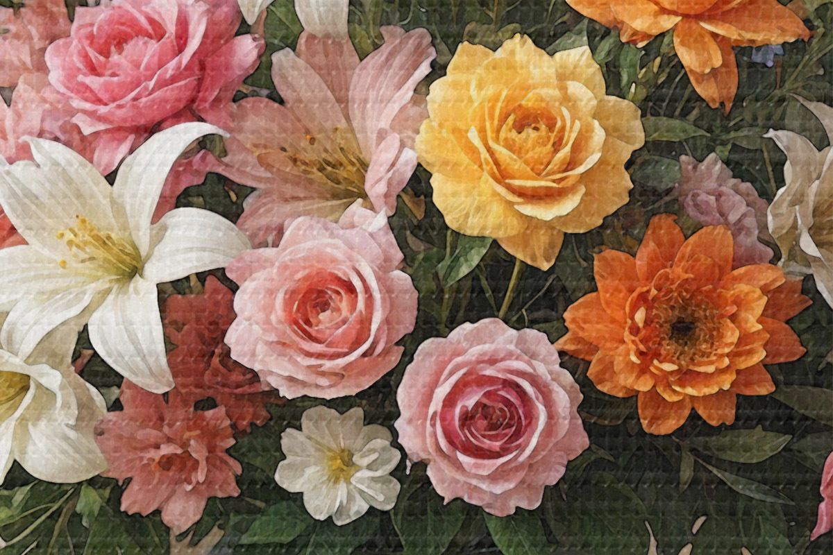 Afbeelding Een levendig boeket van verschillende kleurrijke bloemen in een glazen vaas op een wit tafelkleed, kunstschilderij vintage Nr r38825