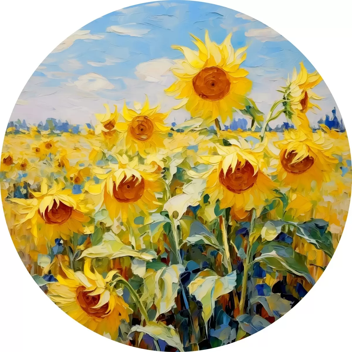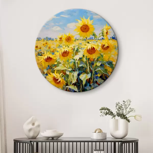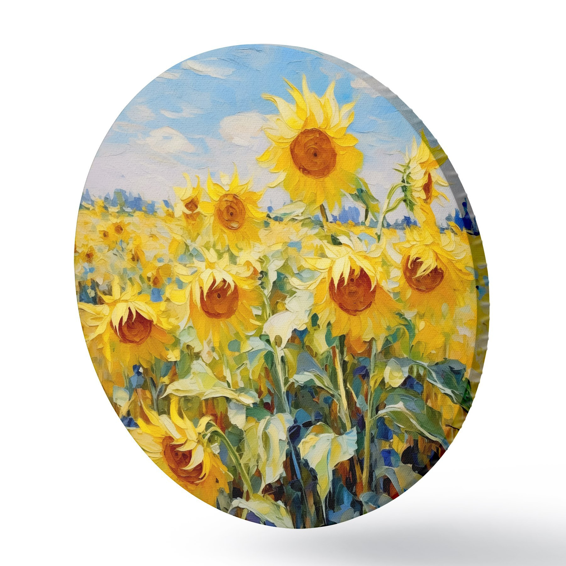 Ronde schilderijen Veld met zonnebloemen olieverfschilderij, gele en blauwe kleur r38953