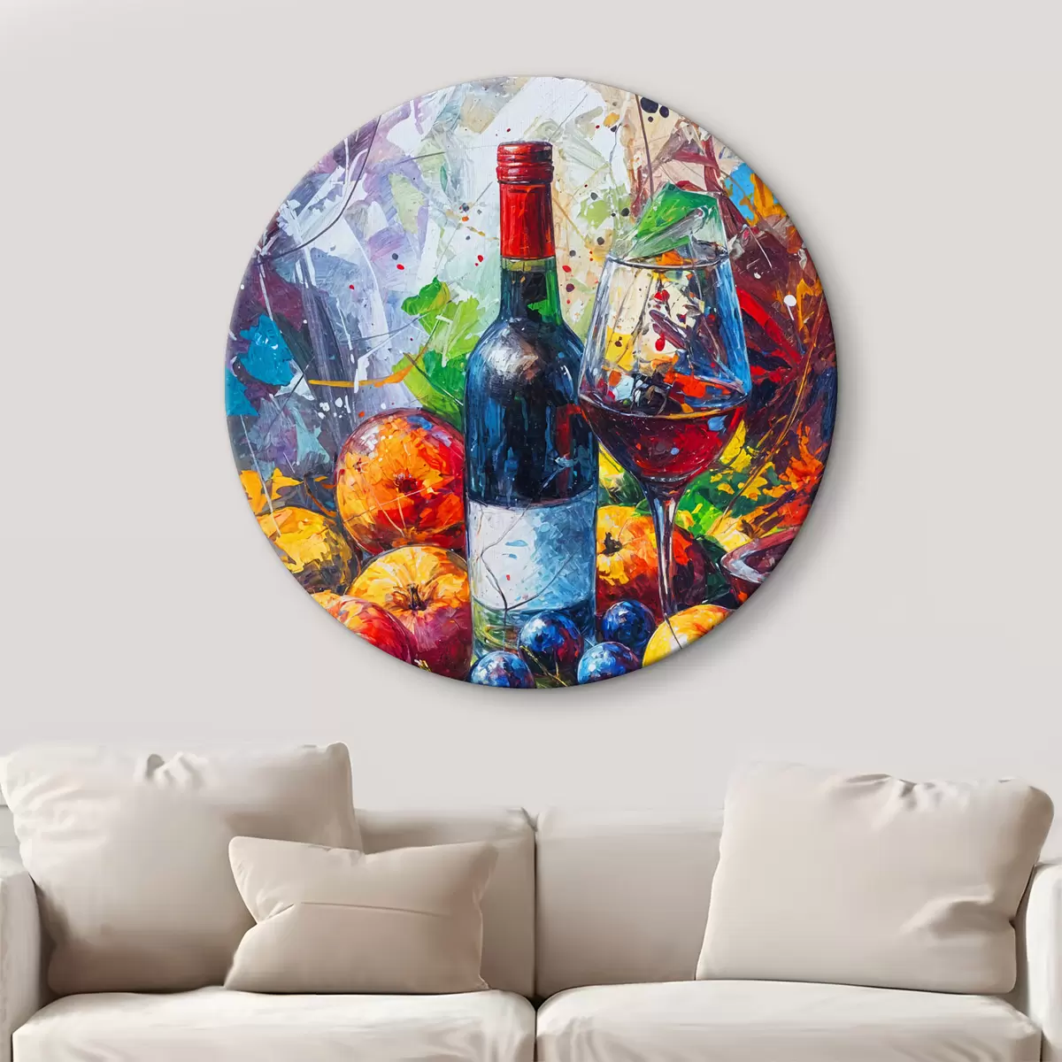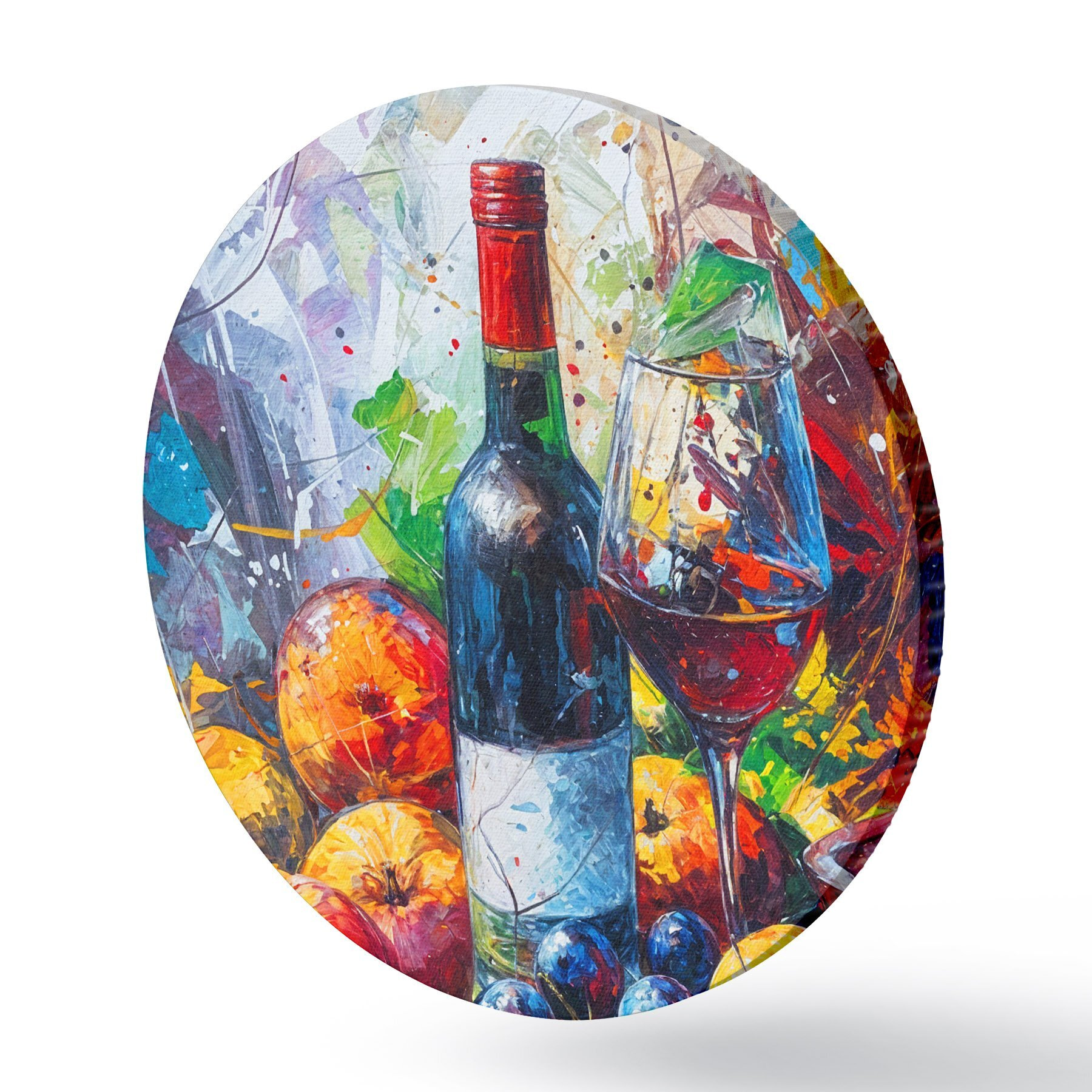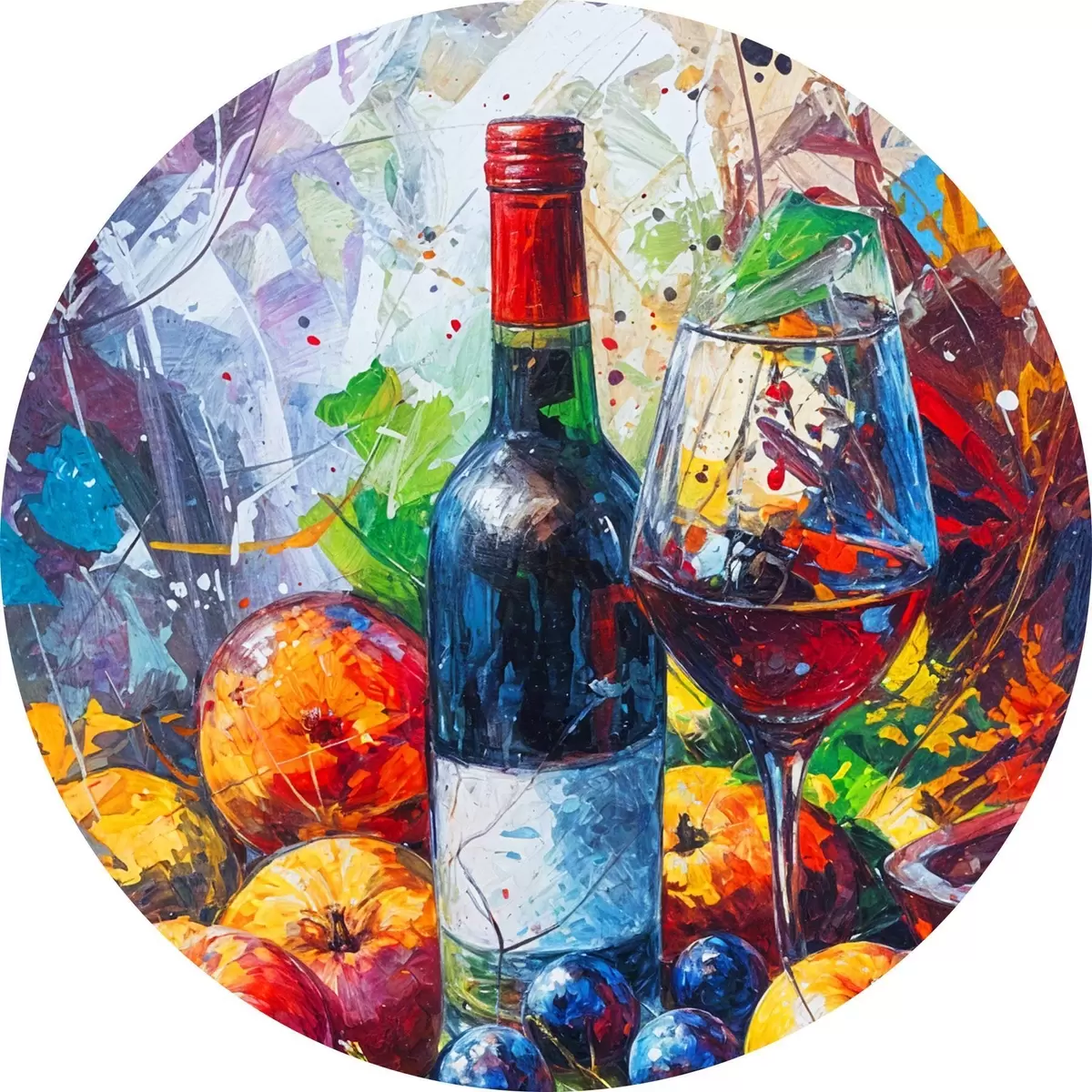Ronde schilderijen Abstract stilleven van een fles wijn, een glas wijn en kleurrijk fruit met spatten van verschillende kleuren r38958