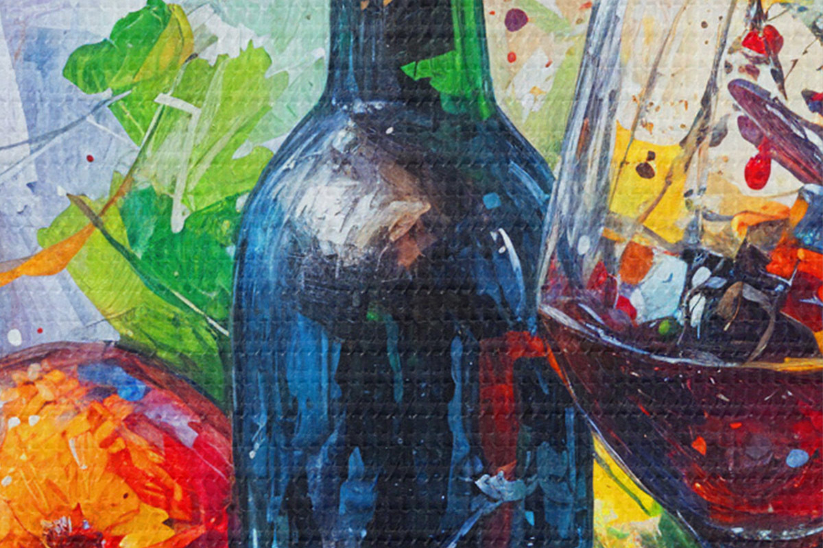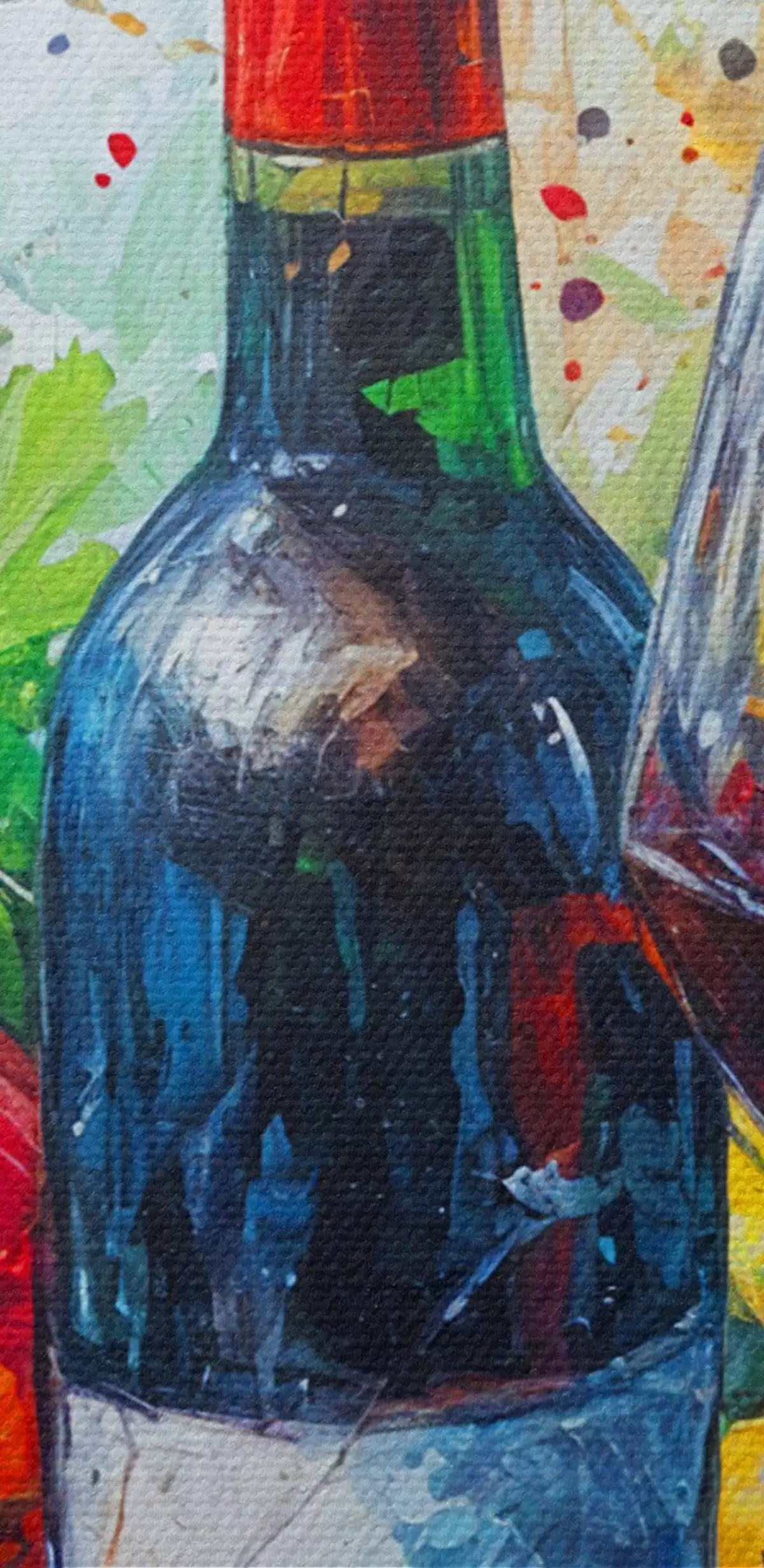 Afbeelding Abstract stilleven van een fles wijn, een glas wijn en kleurrijk fruit met spatten van verschillende kleuren Nr r38958
