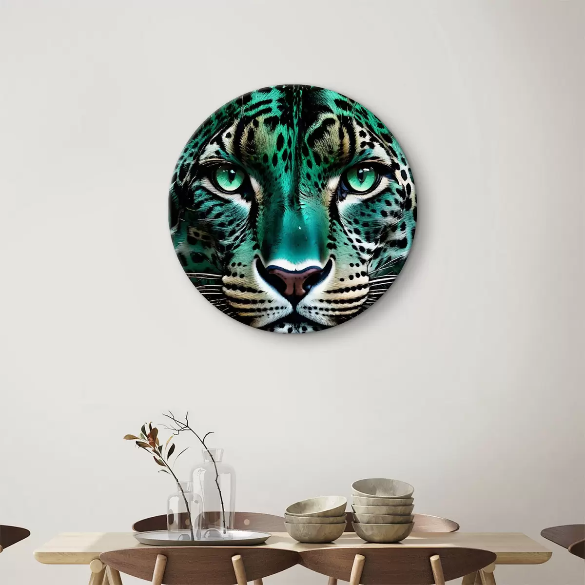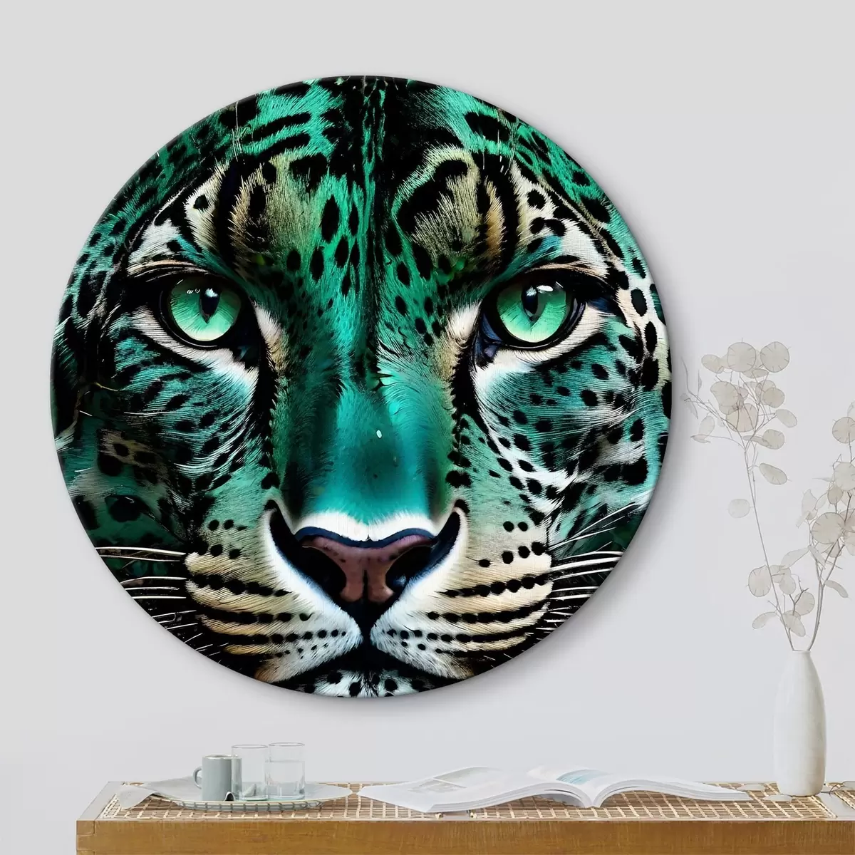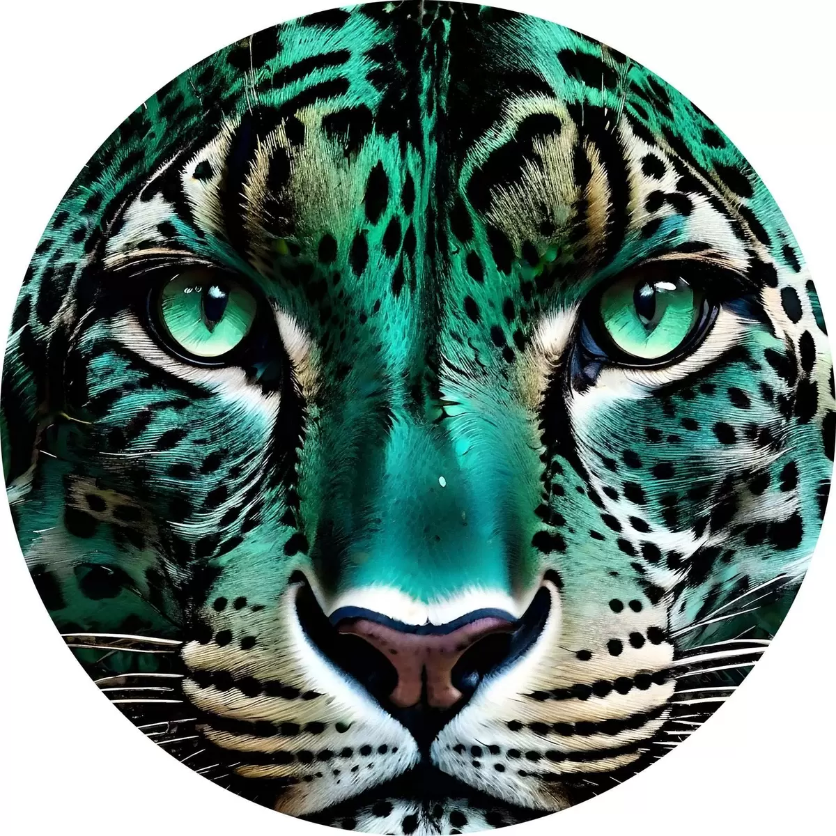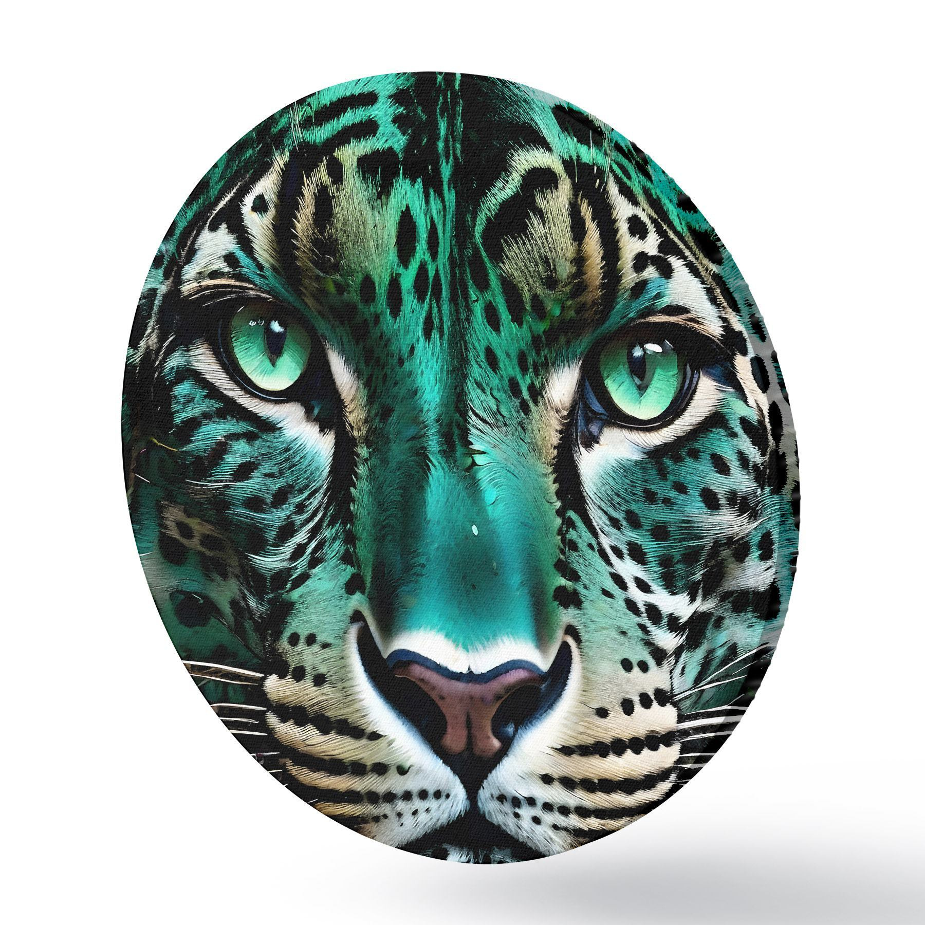 Ronde schilderijen Een close-upportret van een fel groenogig luipaard met levendige turkoois en zwart gevlekte vacht r38979