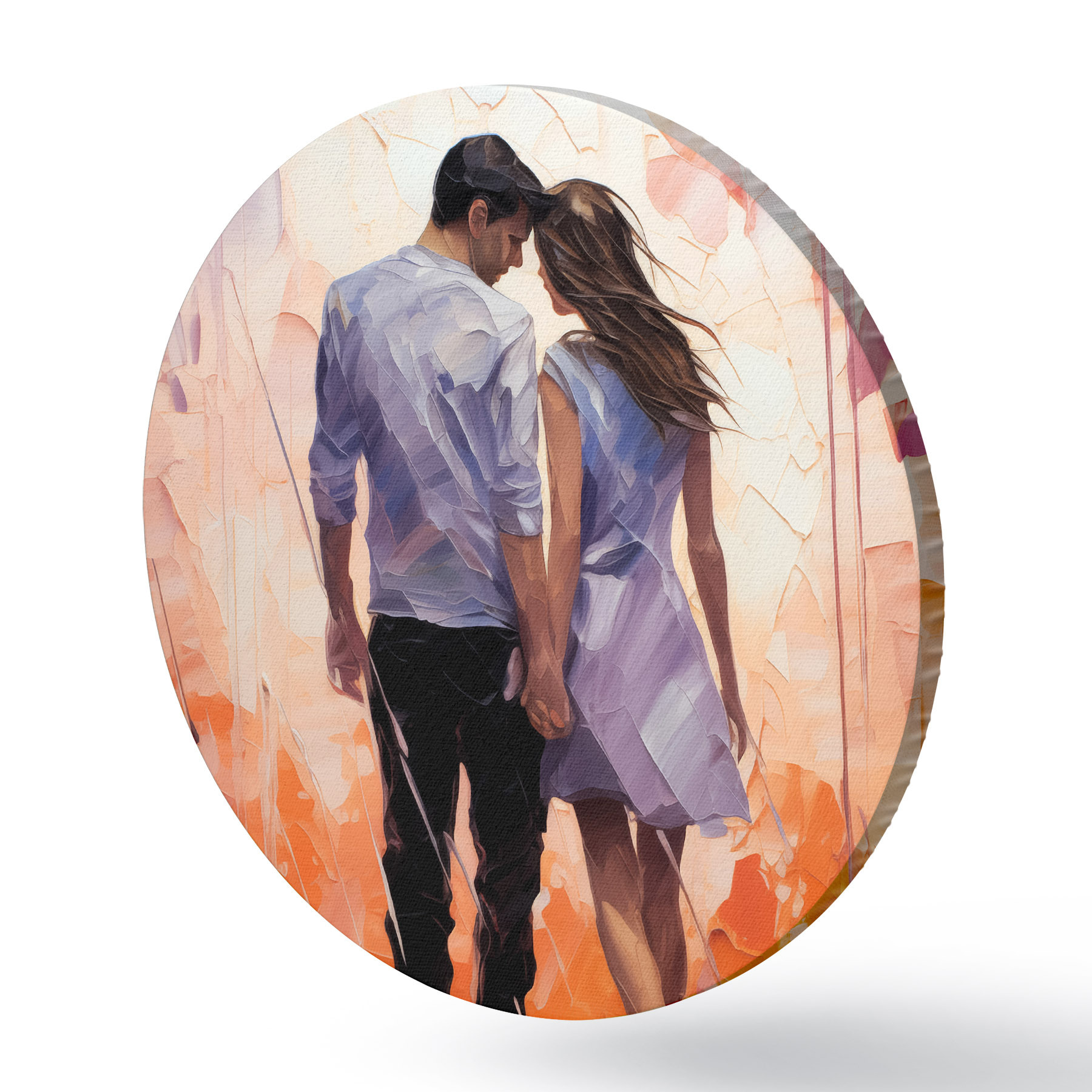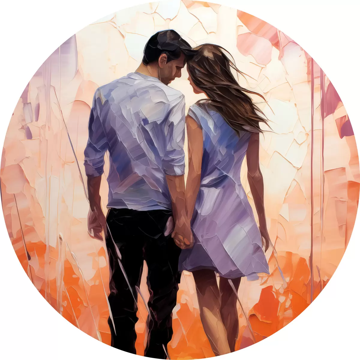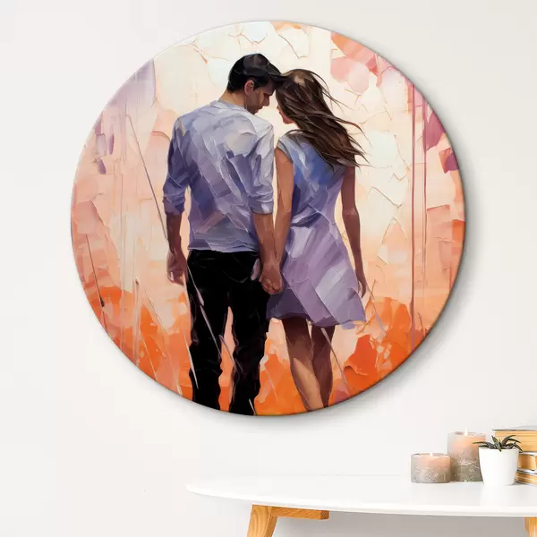 Ronde schilderijen Silhouet van een verliefd stel abstract schilderij, meisje en jongen, roze, oranje, paarse, zwarte kleur r39124