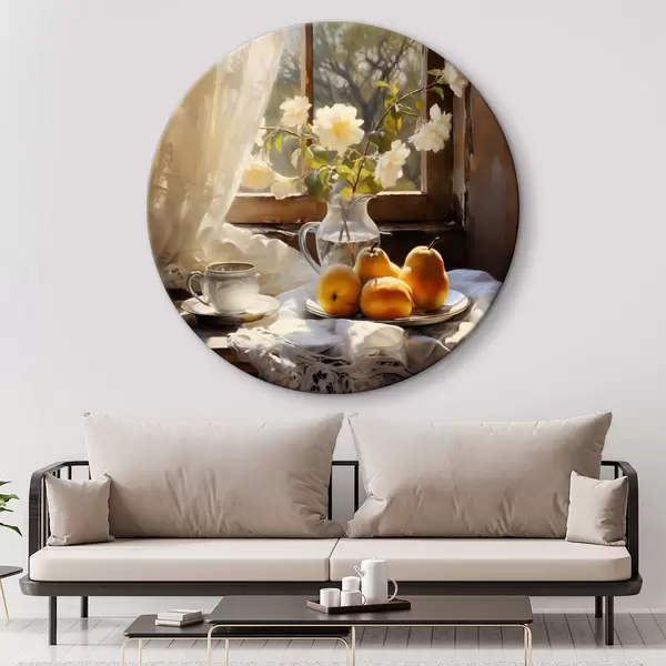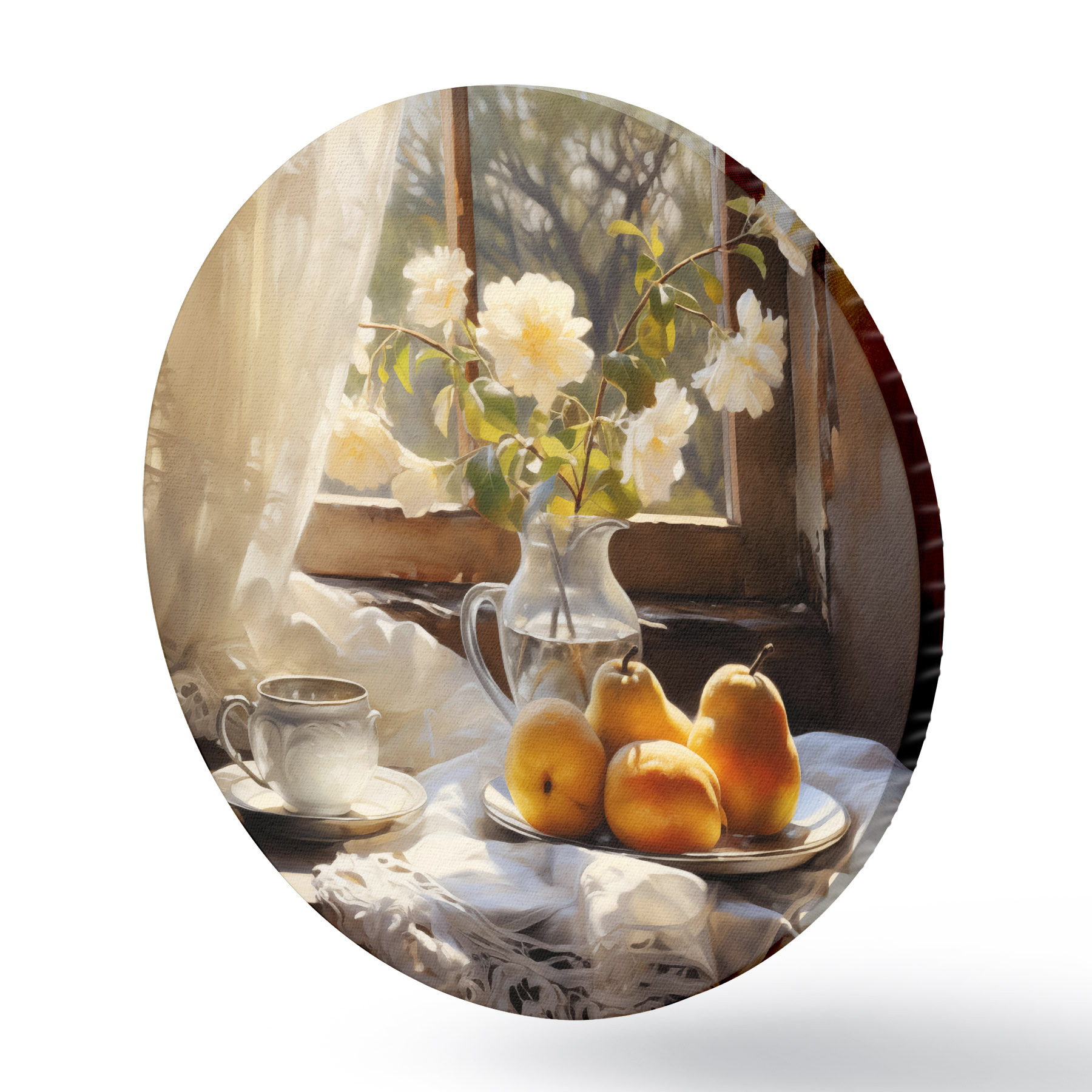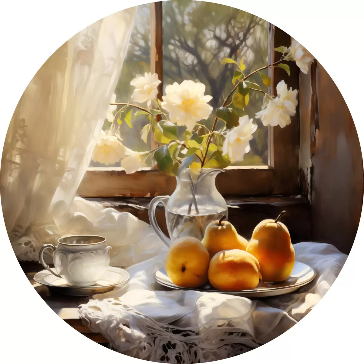 Ronde schilderijen Rustiek stilleven van gele rijpe peren op een bord op een tafel bij het raam, witte rozen in een glazen kan, witte kanten gordijnen r39129