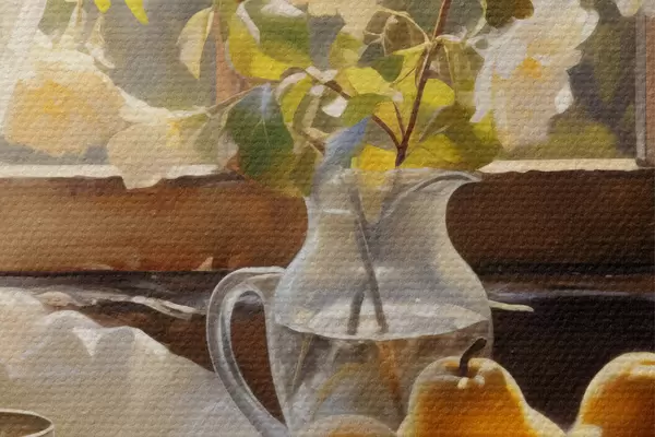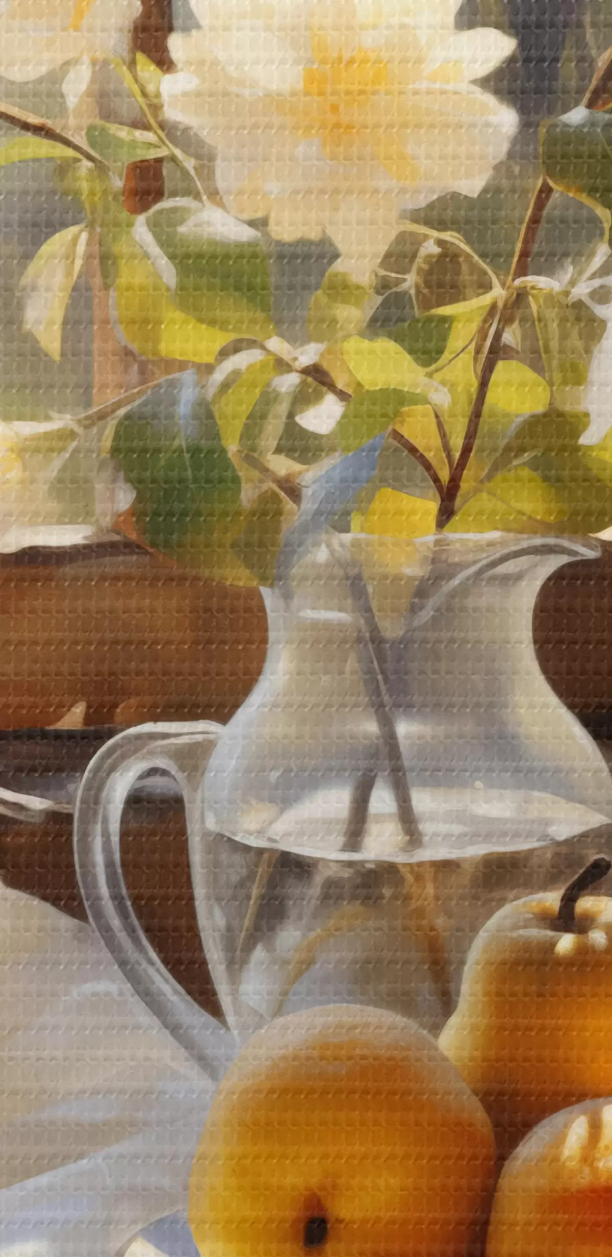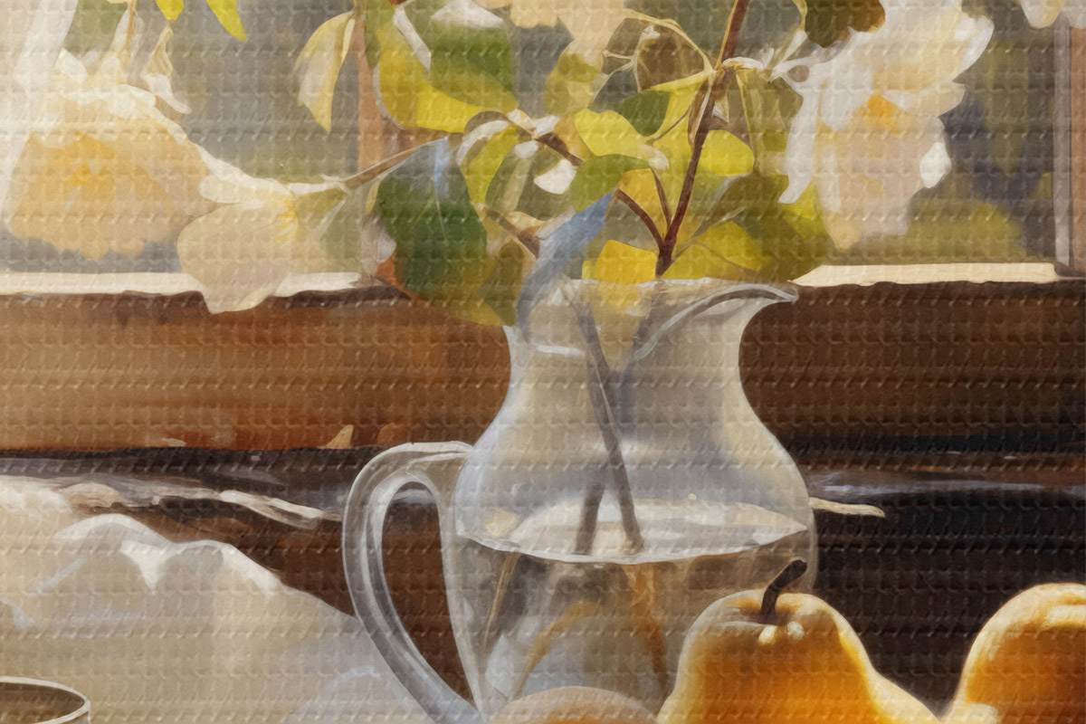 Afbeelding Rustiek stilleven van gele rijpe peren op een bord op een tafel bij het raam, witte rozen in een glazen kan, witte kanten gordijnen Nr r39129