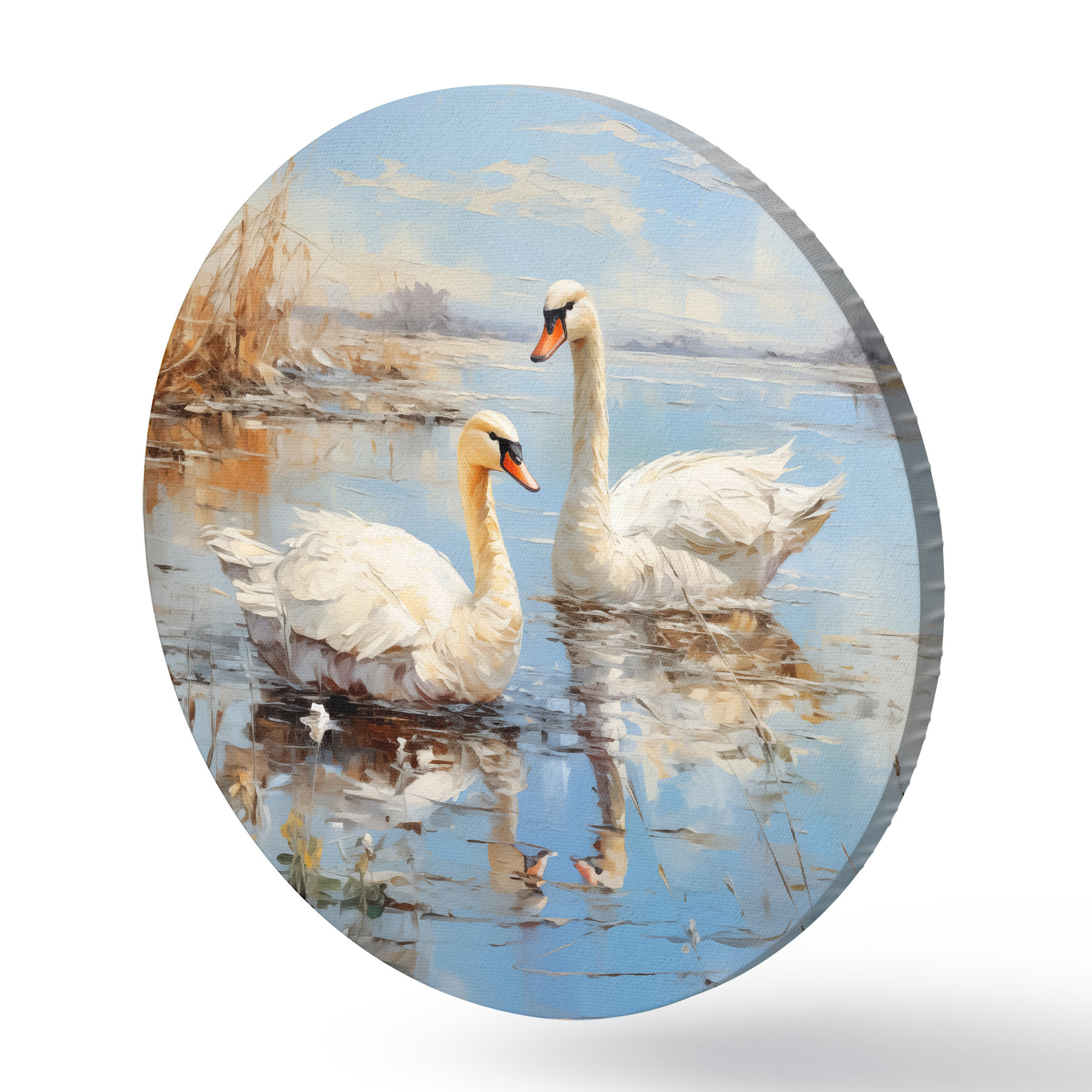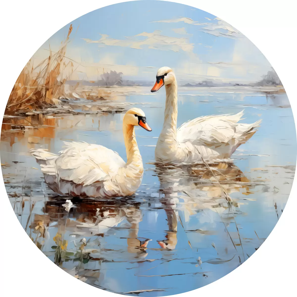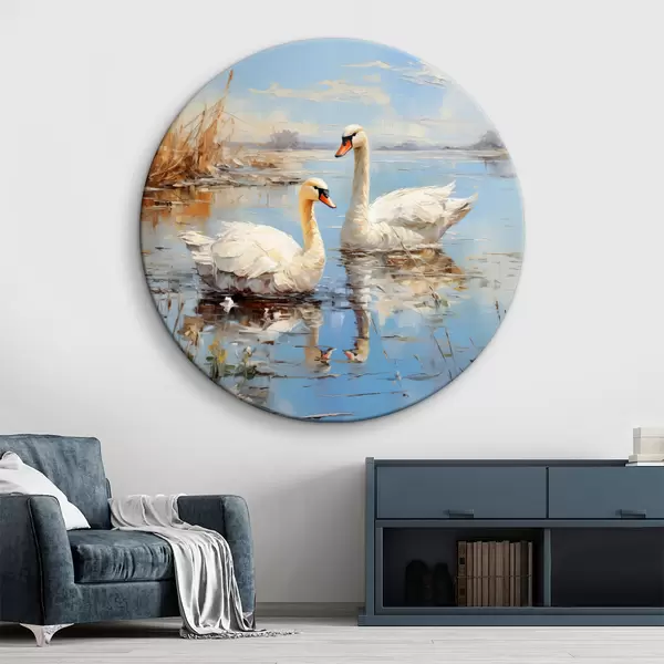 Ronde schilderijen Witte ganzen zwemmen langs de rivier tussen het riet, blauw, wit, beige van kleur r39130