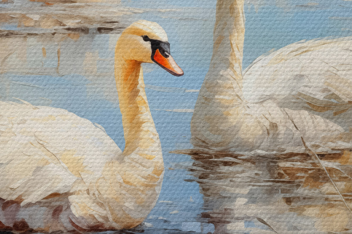 Afbeelding Witte ganzen zwemmen langs de rivier tussen het riet, blauw, wit, beige van kleur Nr r39130