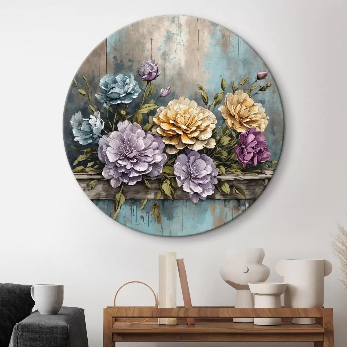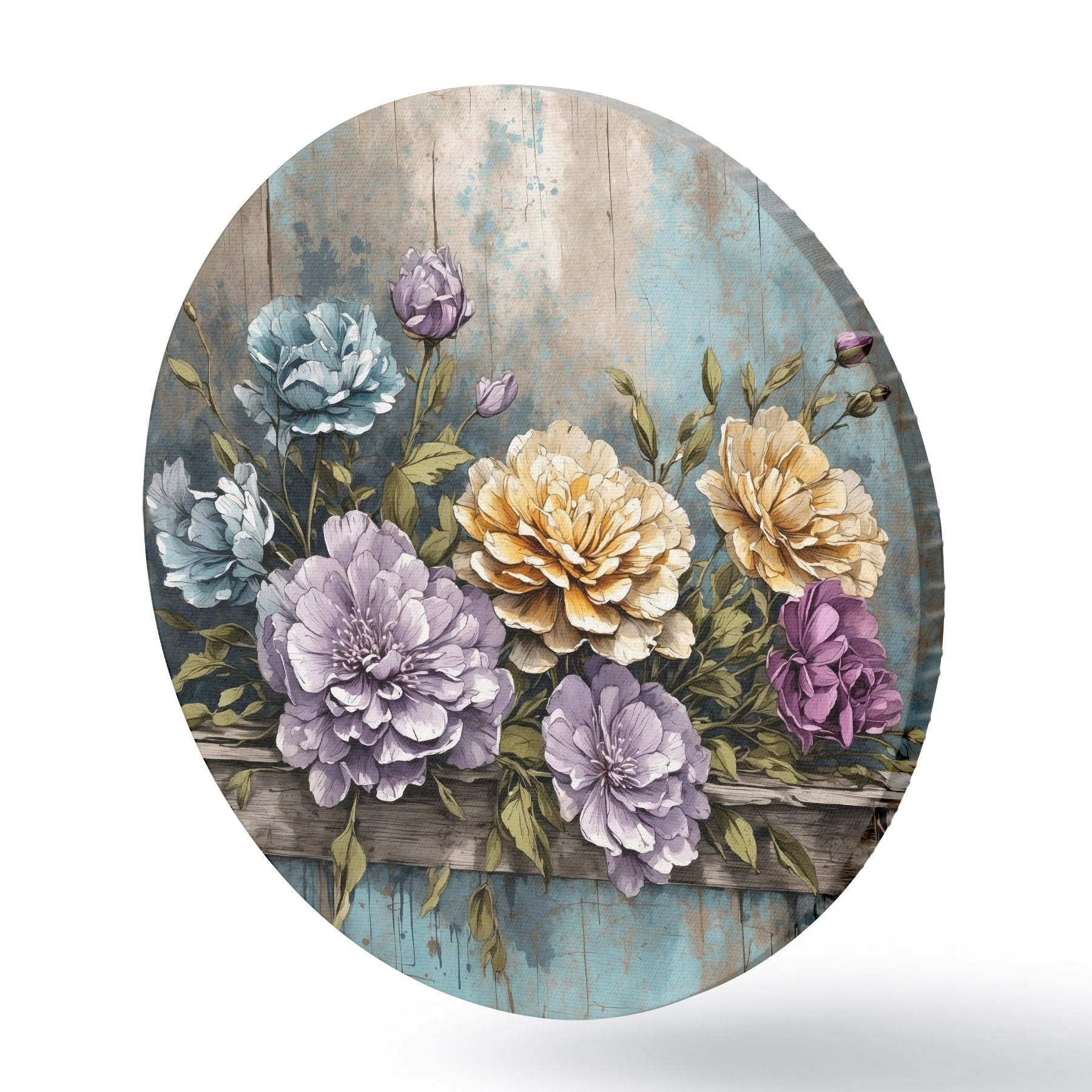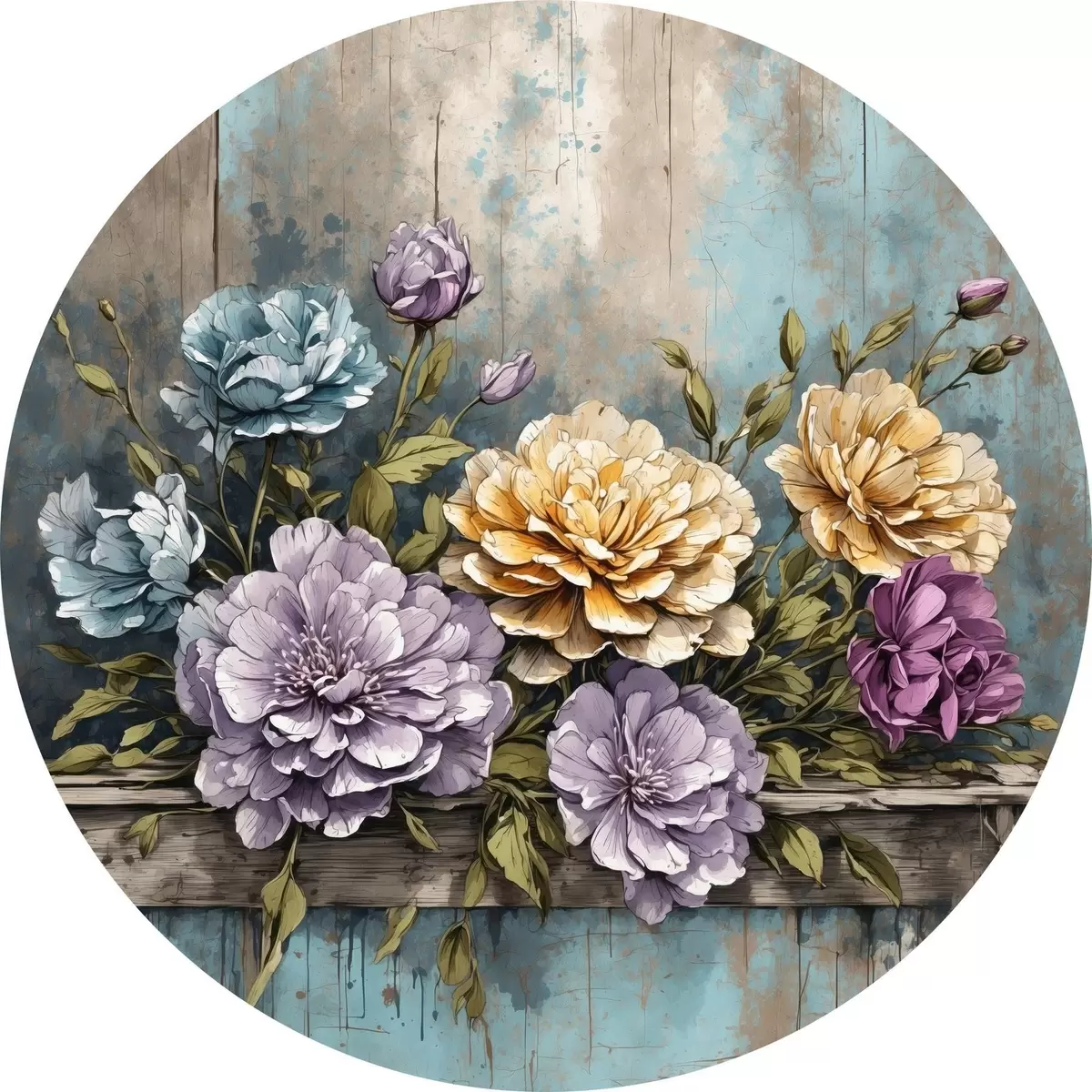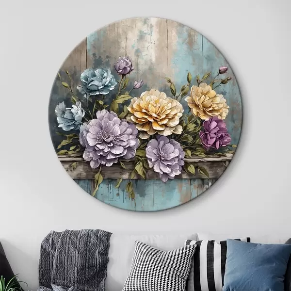 Ronde schilderijen Bloemen en bladeren op oude houten plank r39169