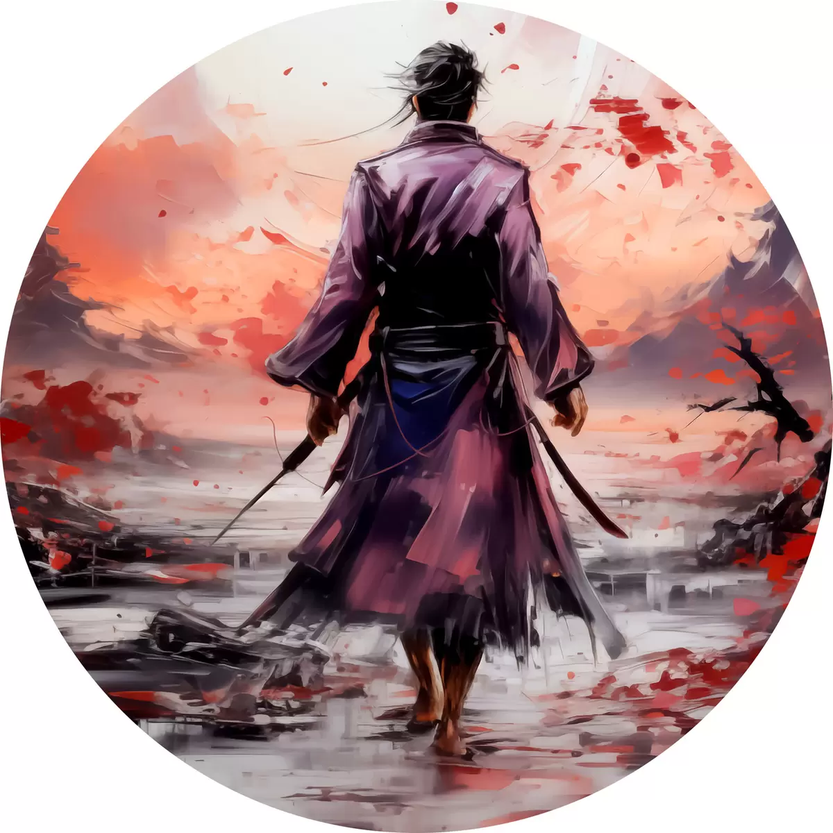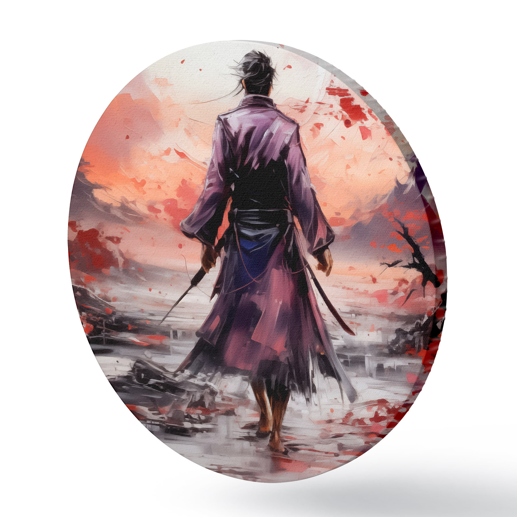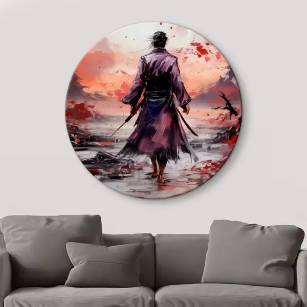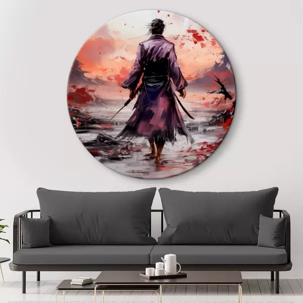 Ronde schilderijen Een samurai met een zwaard in een paarse mantel loopt richting het abstracte kunstschilderij van de bergen r39194