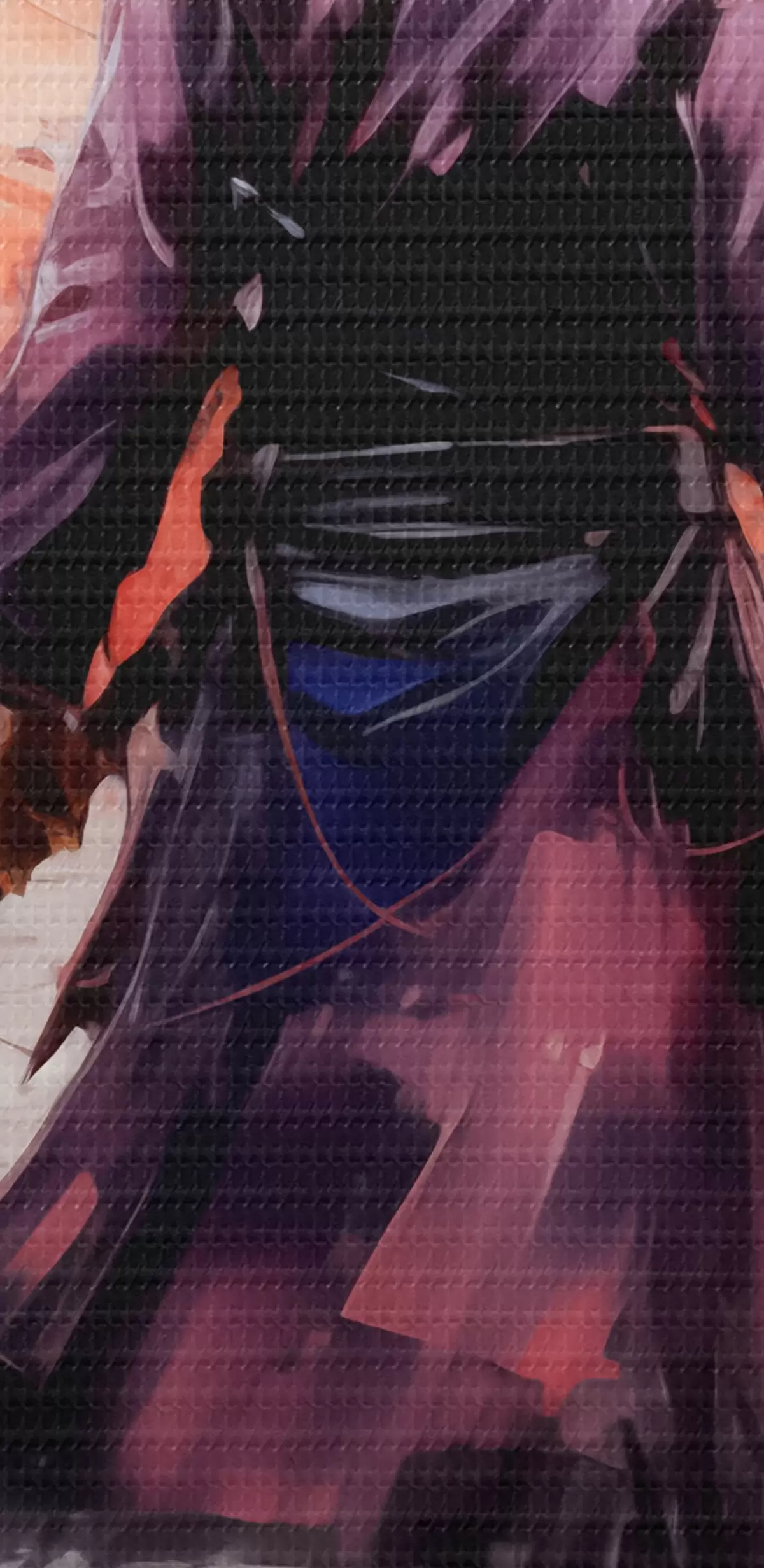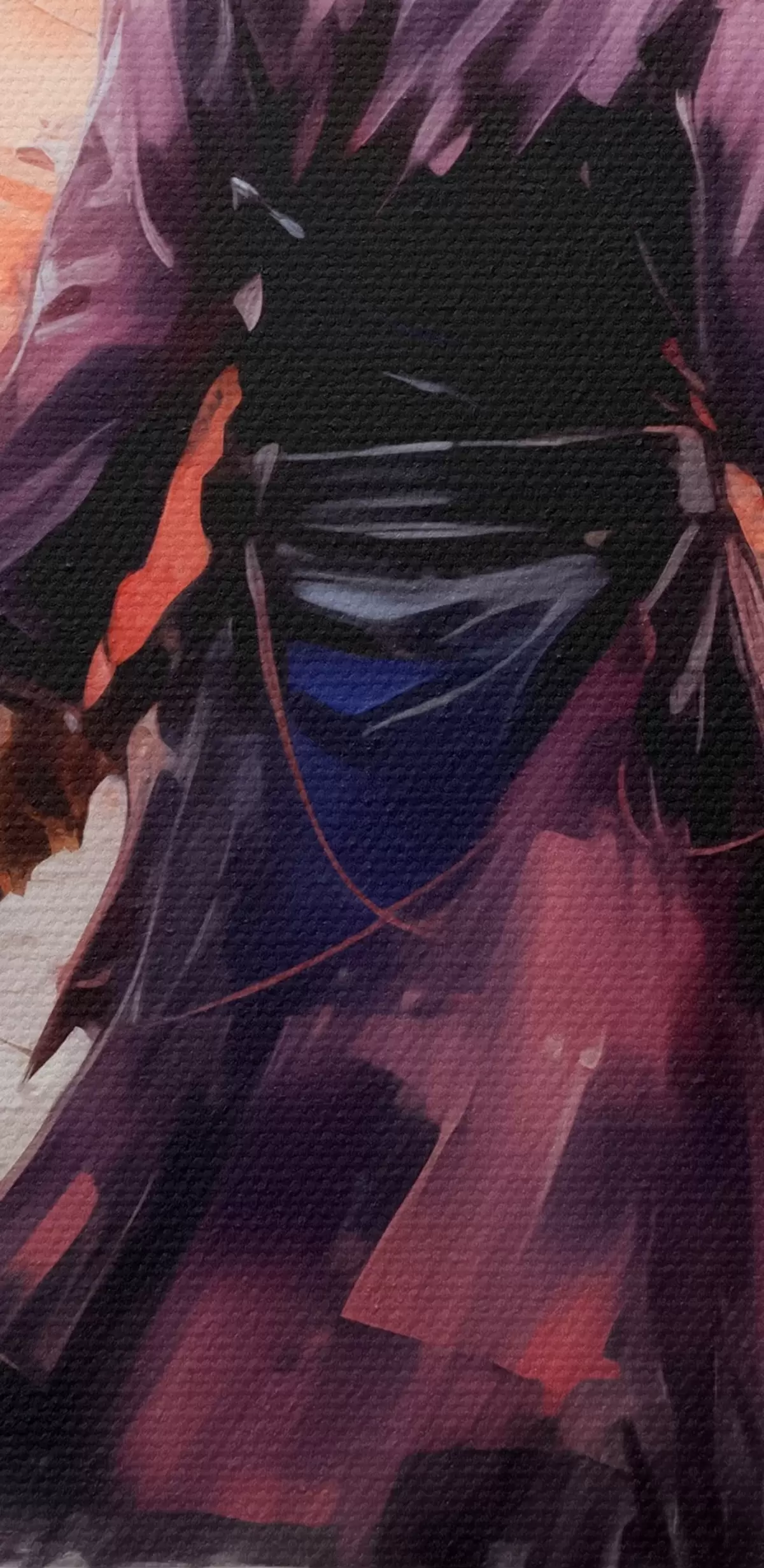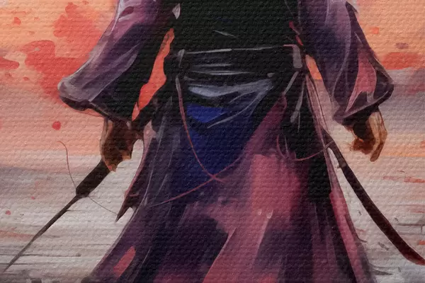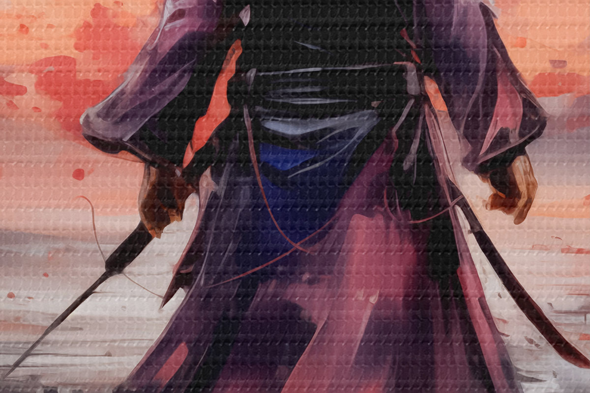 Afbeelding Een samurai met een zwaard in een paarse mantel loopt richting het abstracte kunstschilderij van de bergen Nr r39194