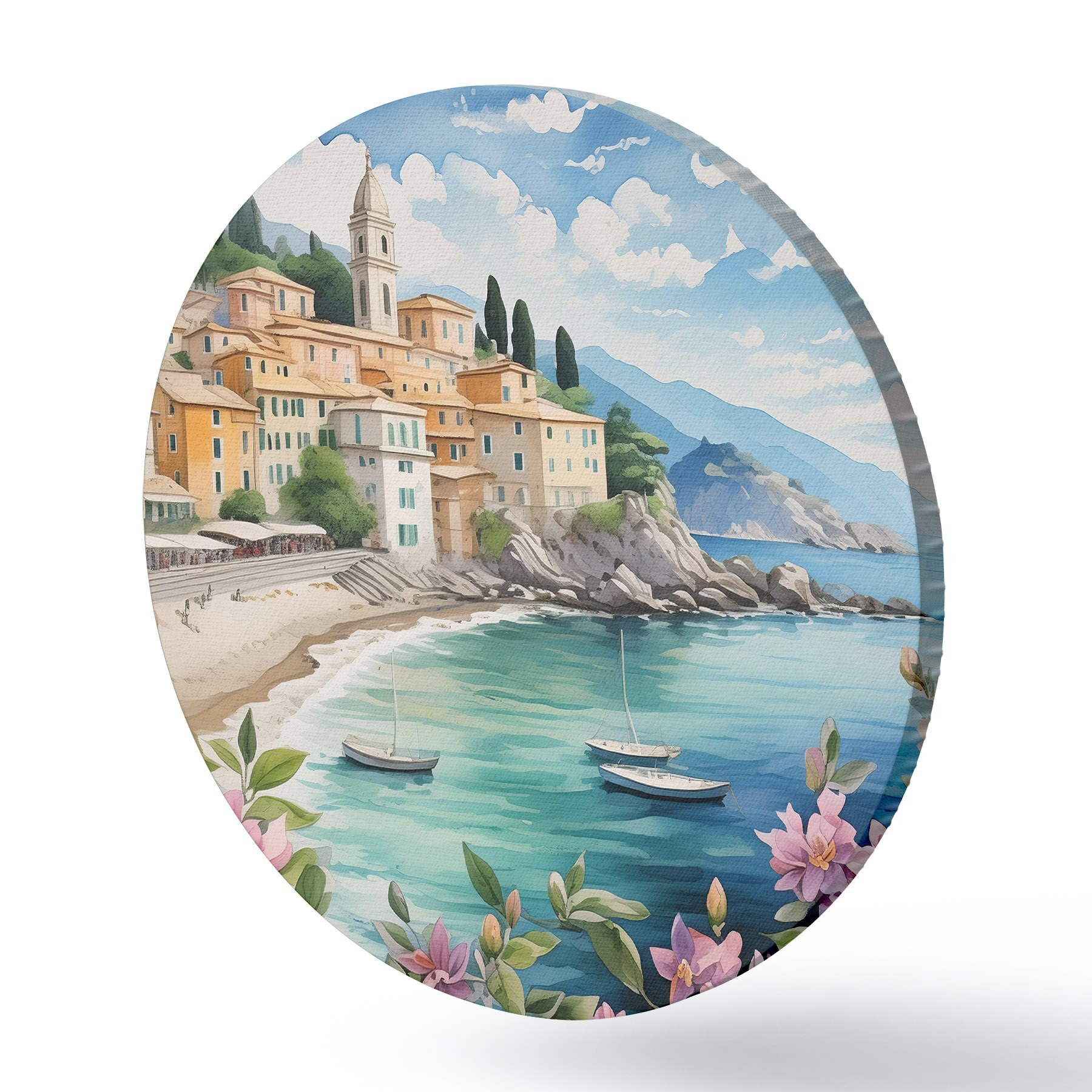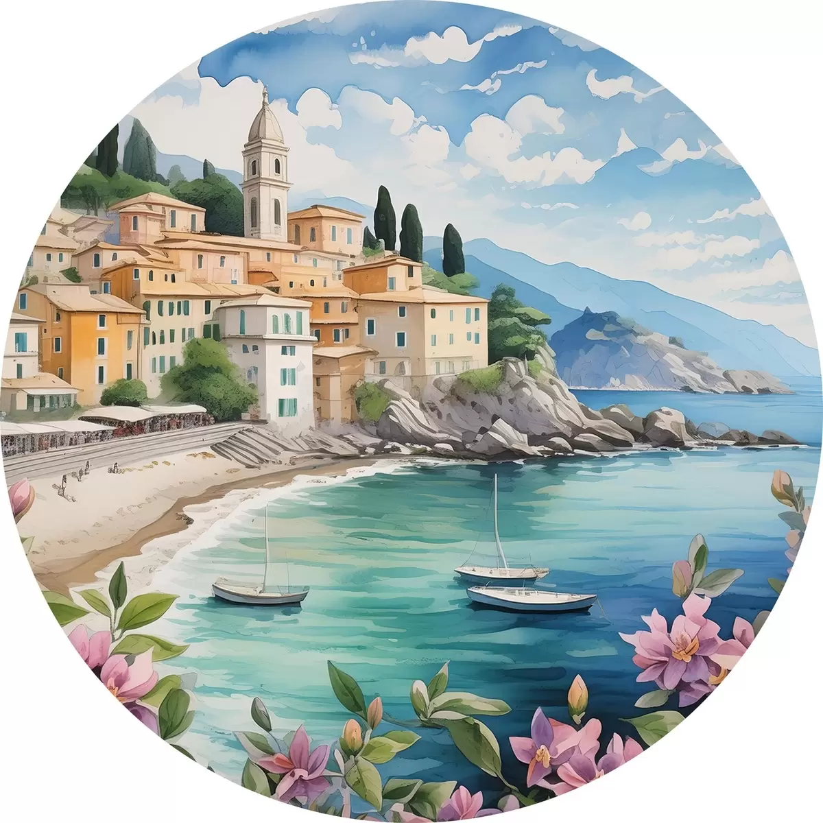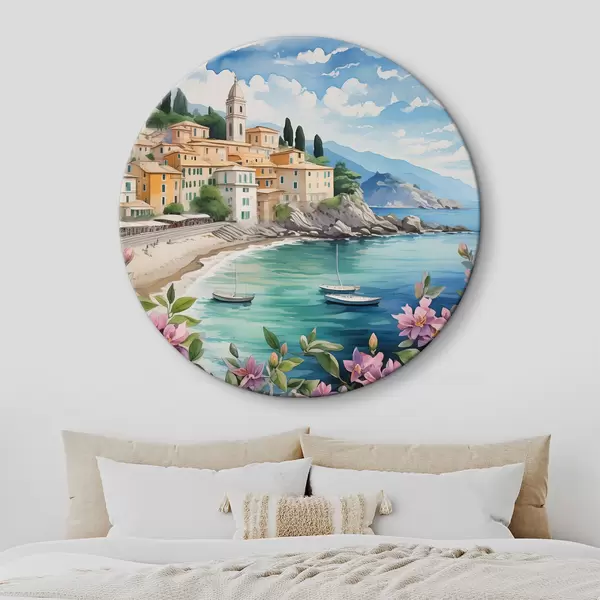 Ronde schilderijen een stad aan zee in de zomer r39299