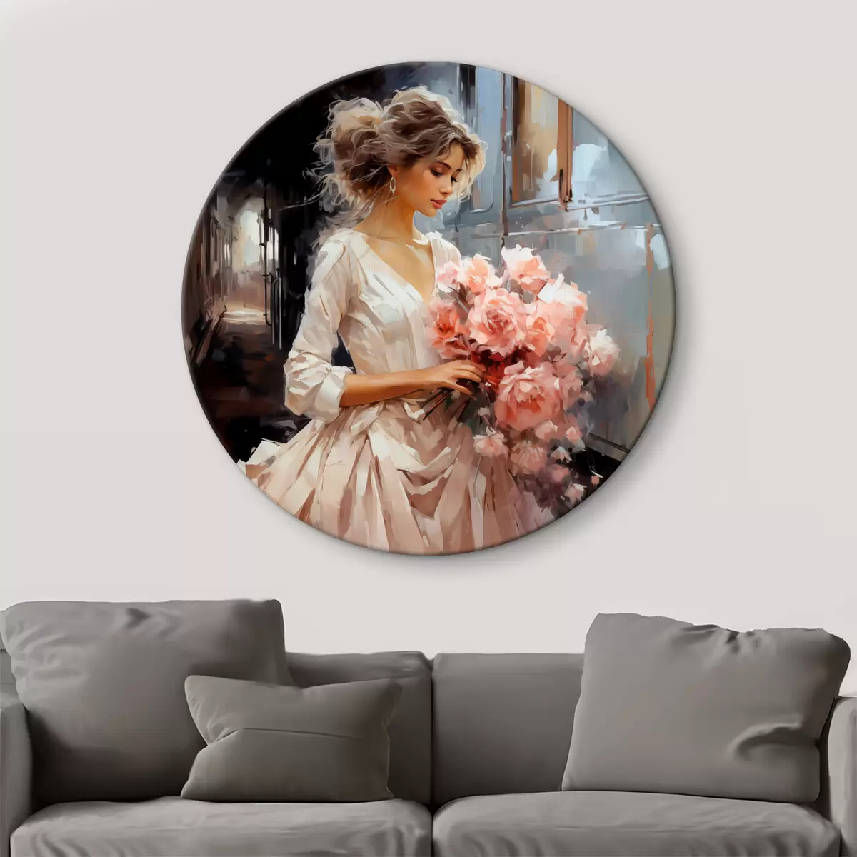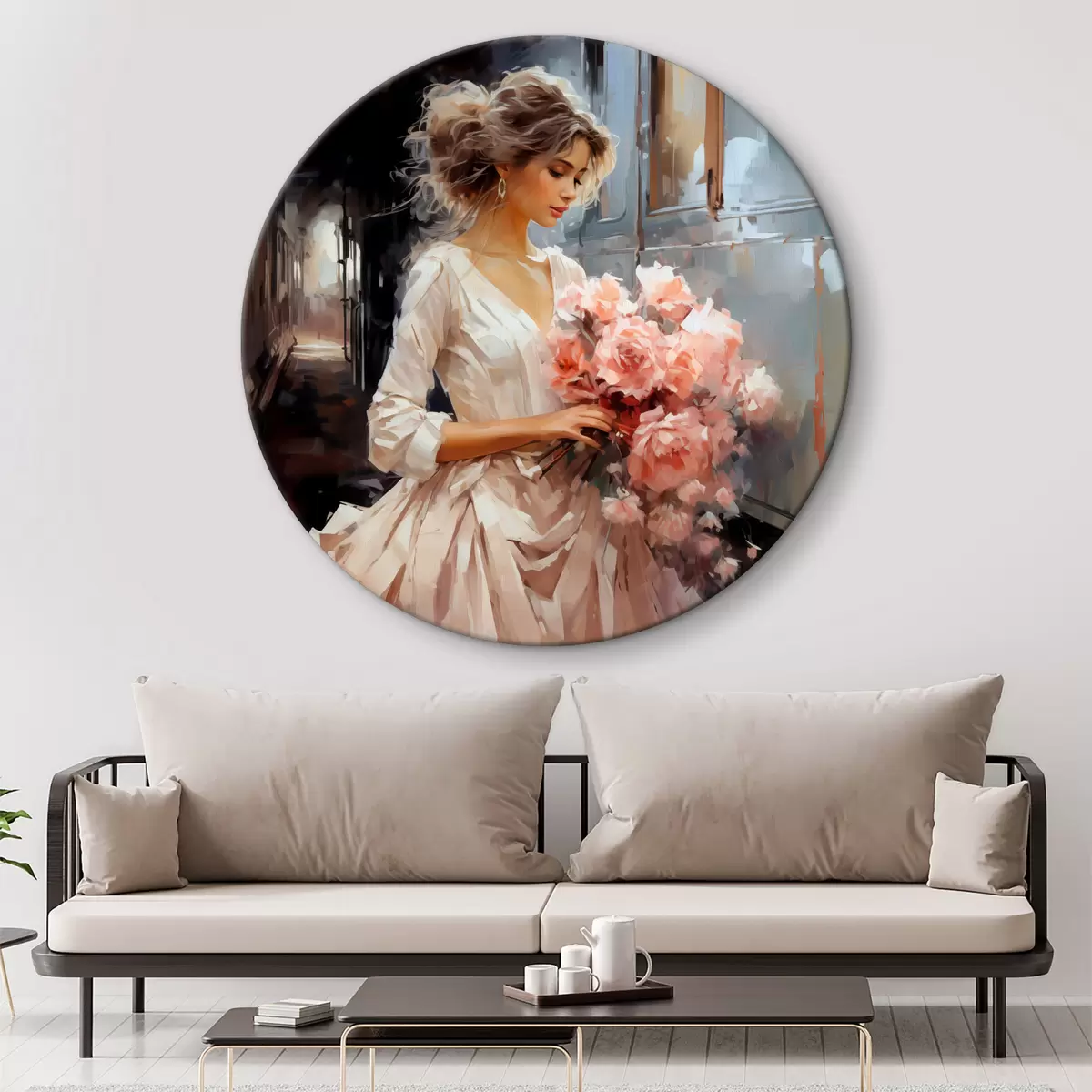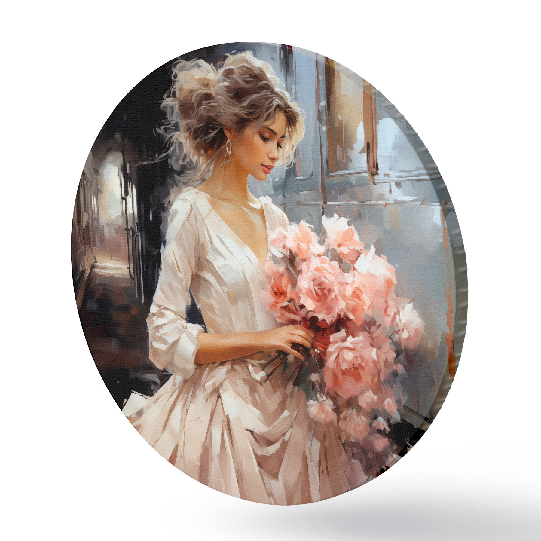 Ronde schilderijen Een meisje in een witte jurk op het station houdt een boeket roze rozen in haar handen olieverfschilderij r39438