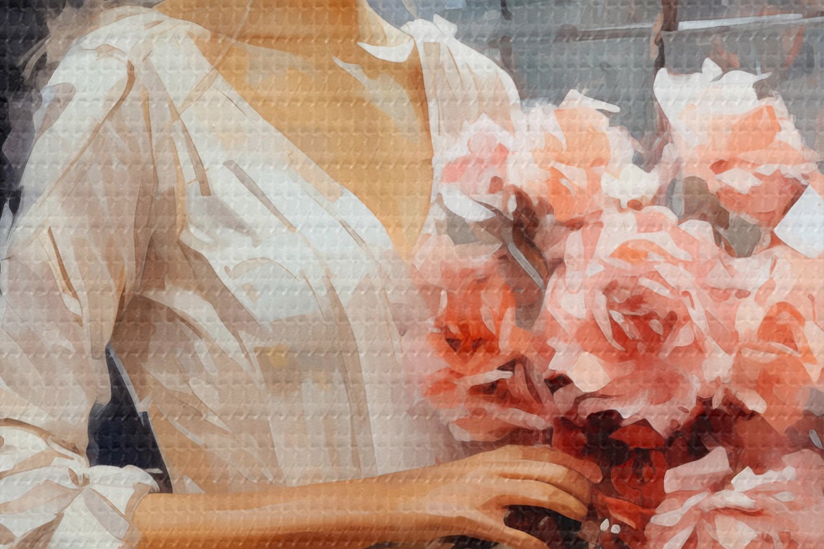 Afbeelding Een meisje in een witte jurk op het station houdt een boeket roze rozen in haar handen olieverfschilderij Nr r39438
