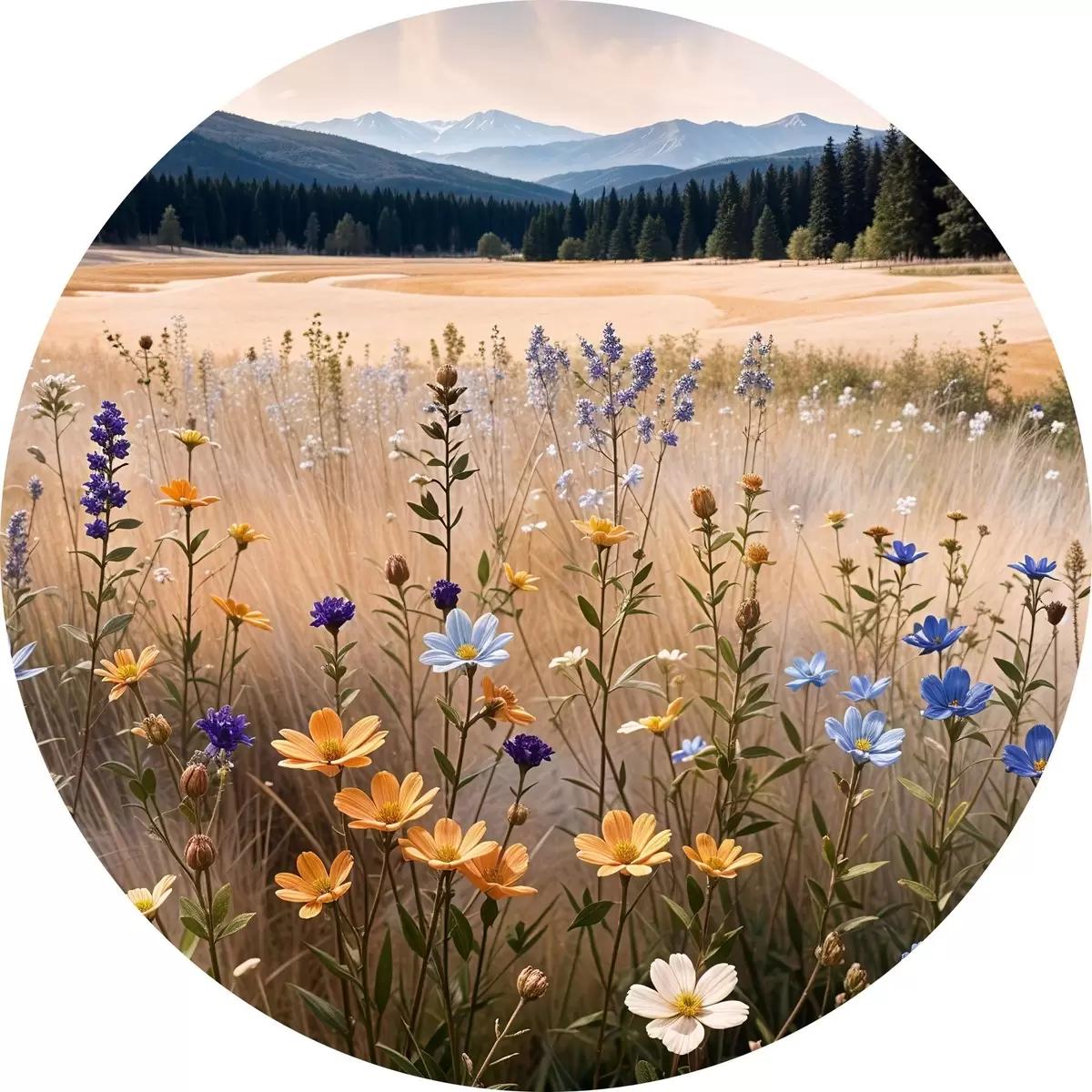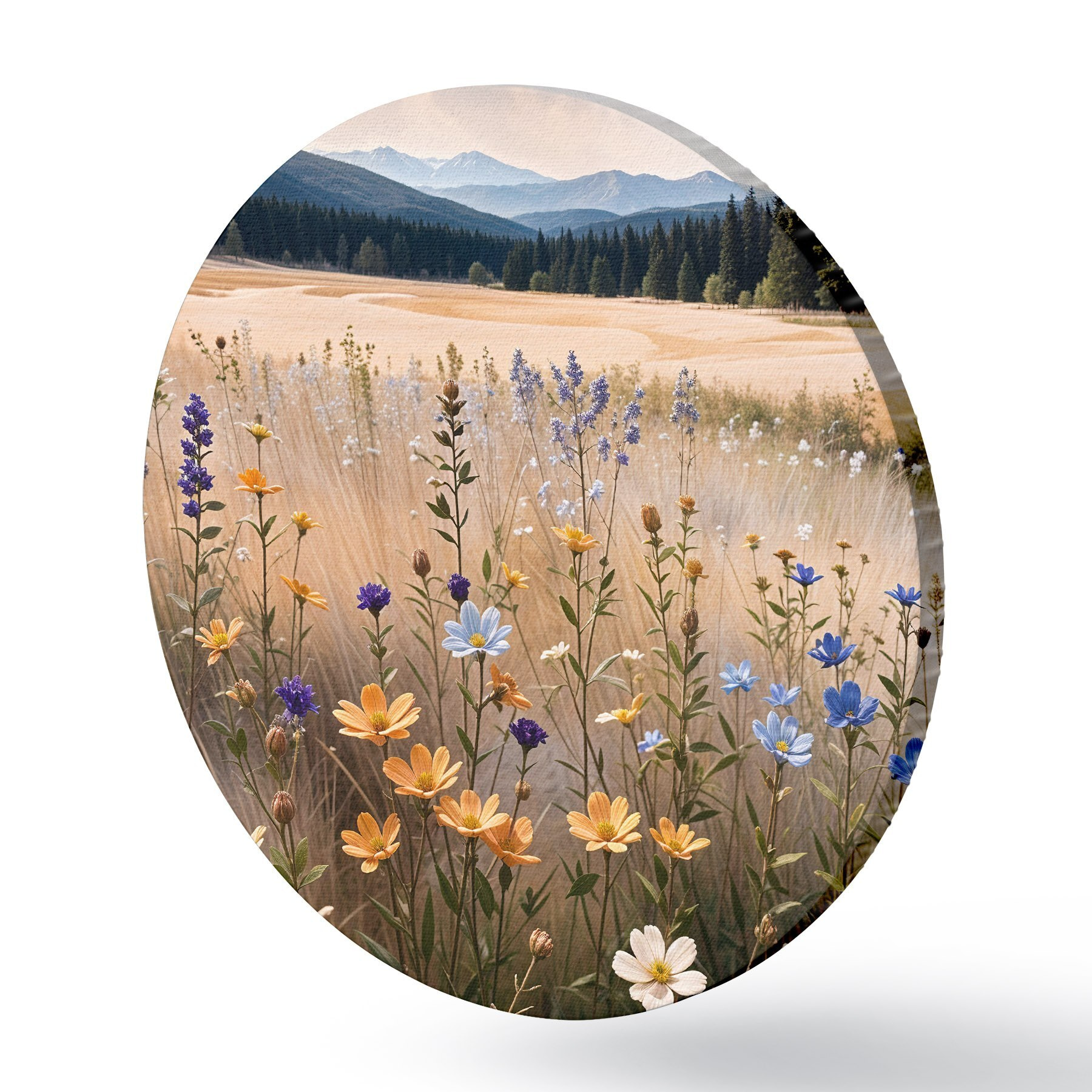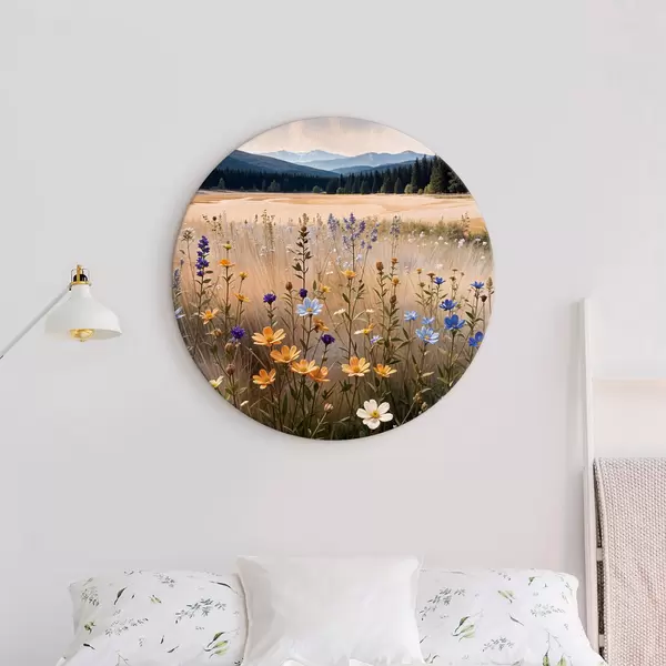 Ronde schilderijen Een veld met kleurrijke wilde bloemen op de voorgrond, met een meer en bergen op de achtergrond r39502