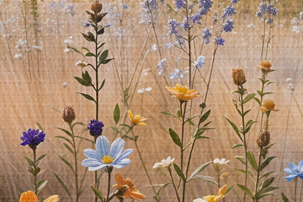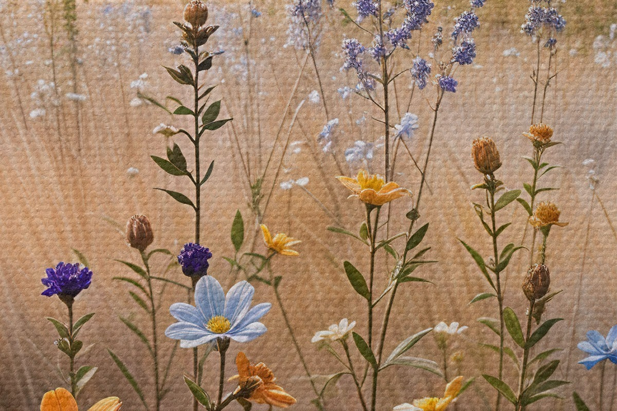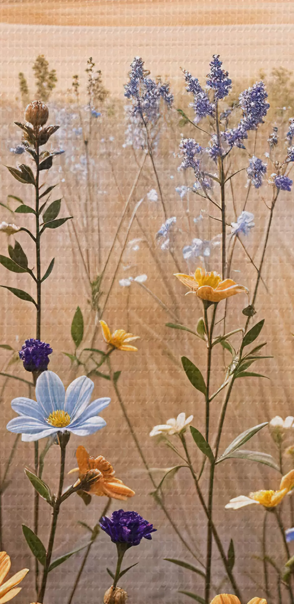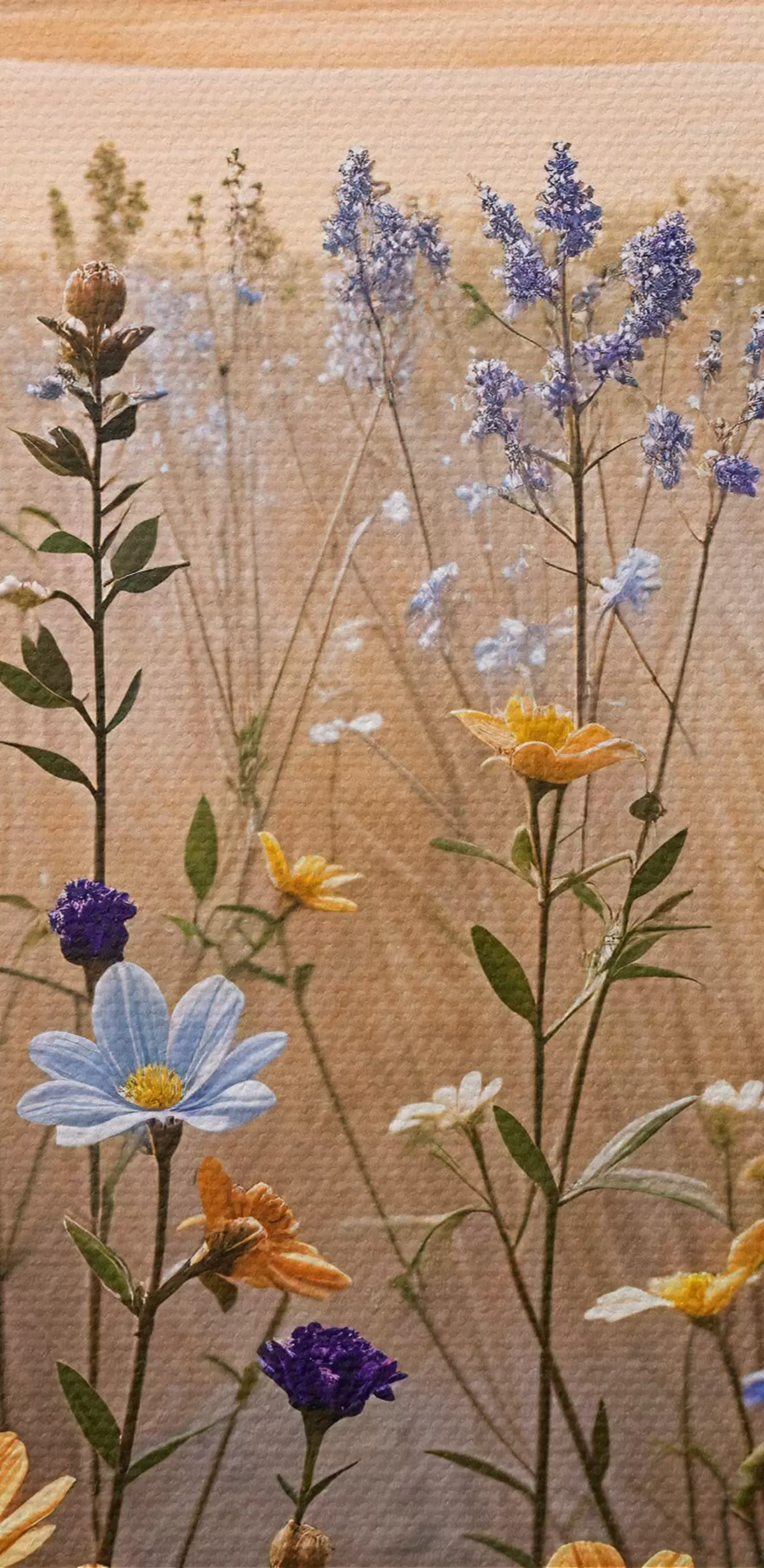 Afbeelding Een veld met kleurrijke wilde bloemen op de voorgrond, met een meer en bergen op de achtergrond Nr r39502
