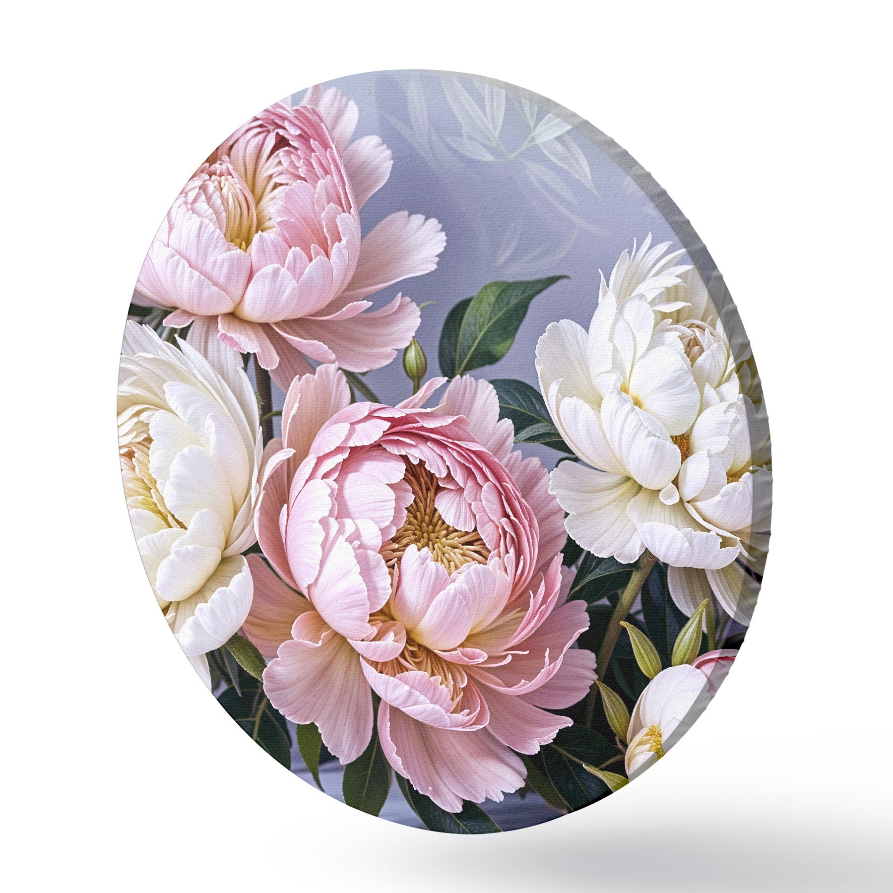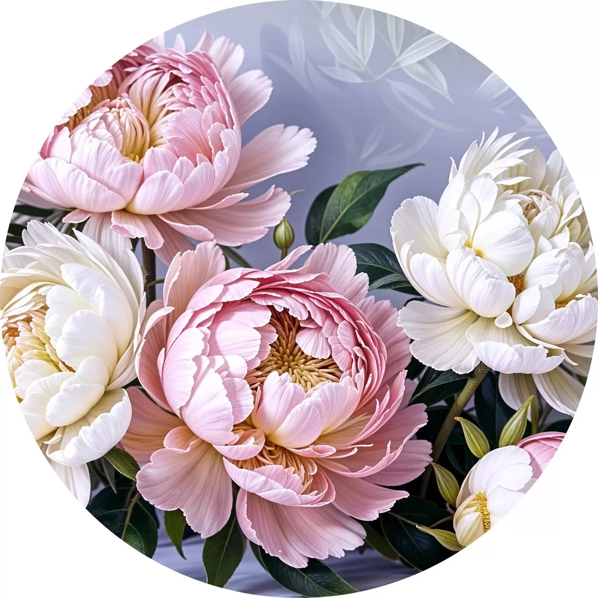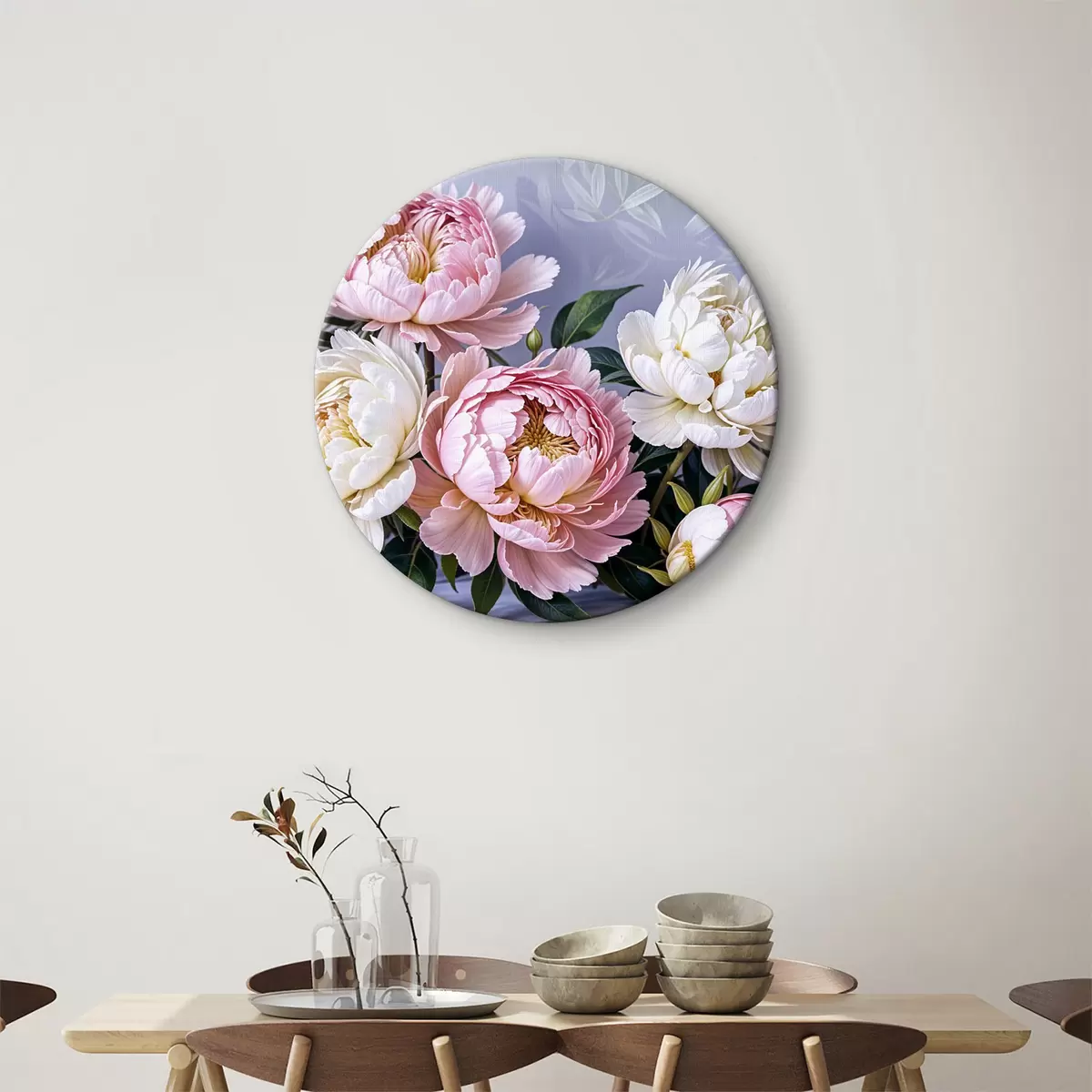 Ronde schilderijen Een boeket van grote, weelderige roze en witte pioenrozen met groene bladeren tegen een zachte, onscherpe achtergrond r39514