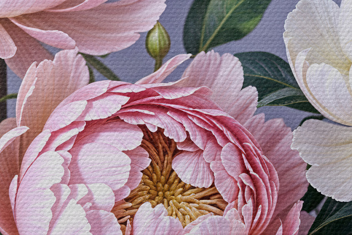 Afbeelding Een boeket van grote, weelderige roze en witte pioenrozen met groene bladeren tegen een zachte, onscherpe achtergrond Nr r39514