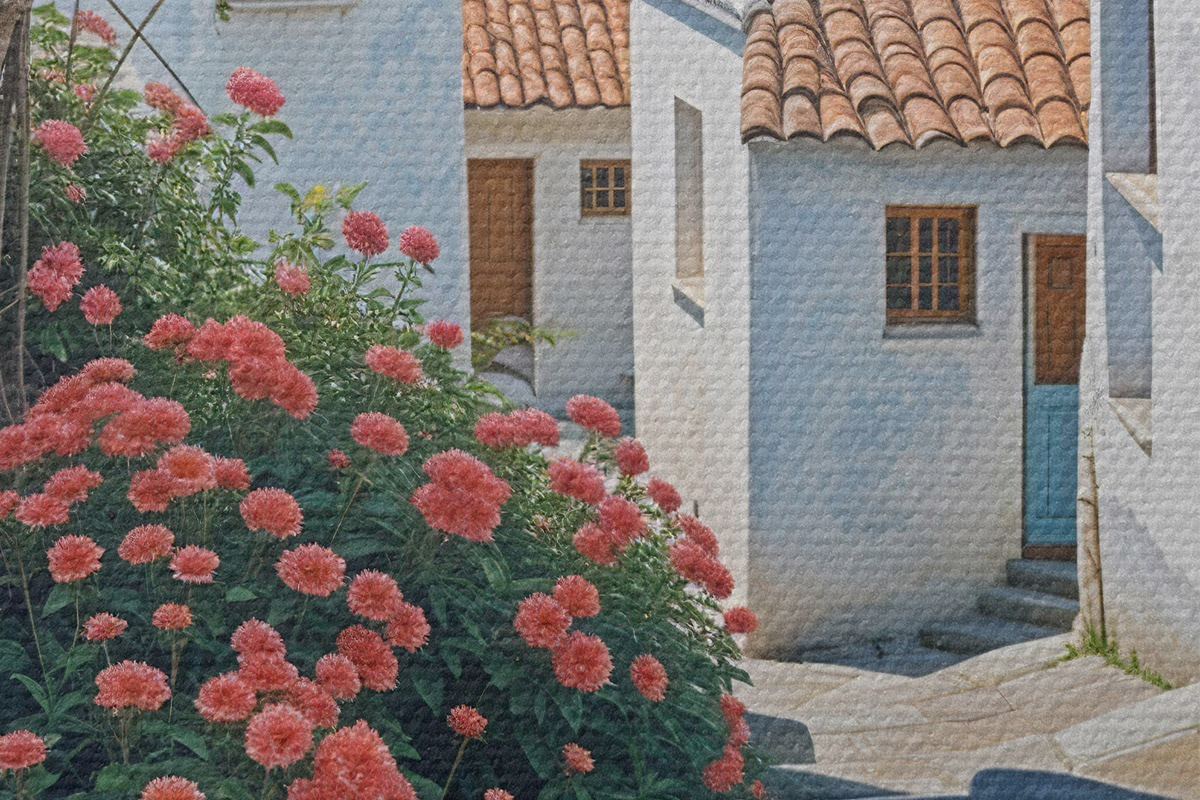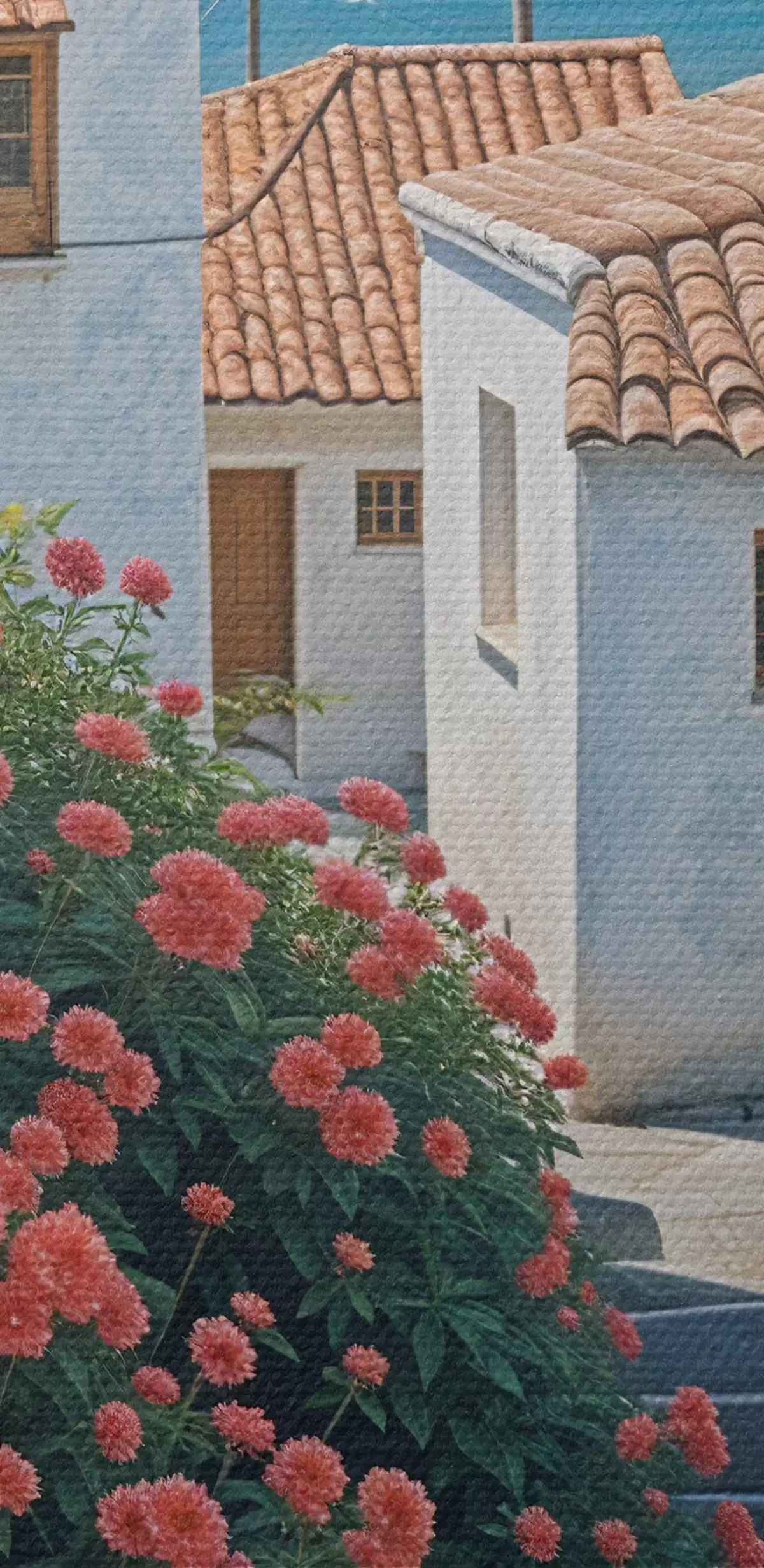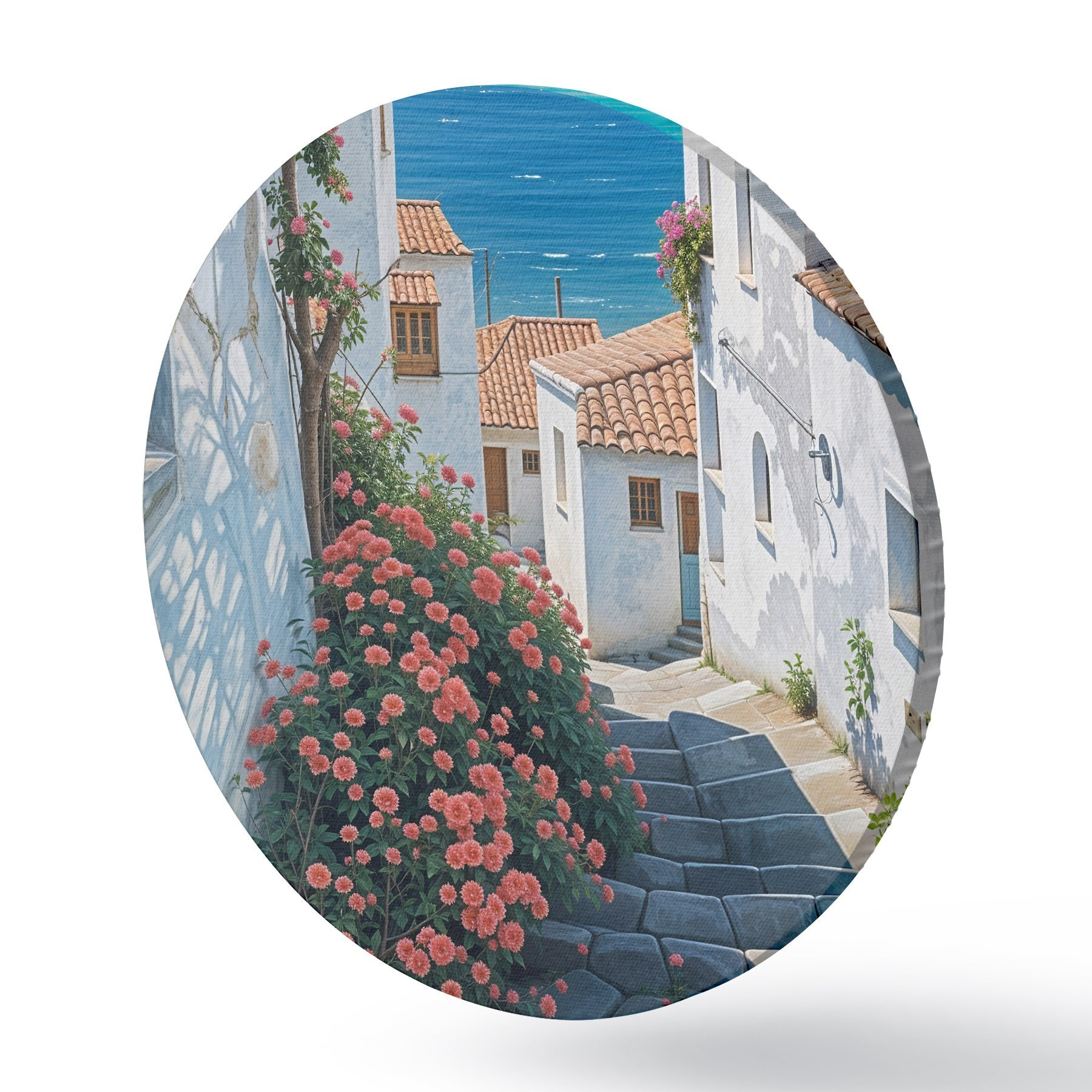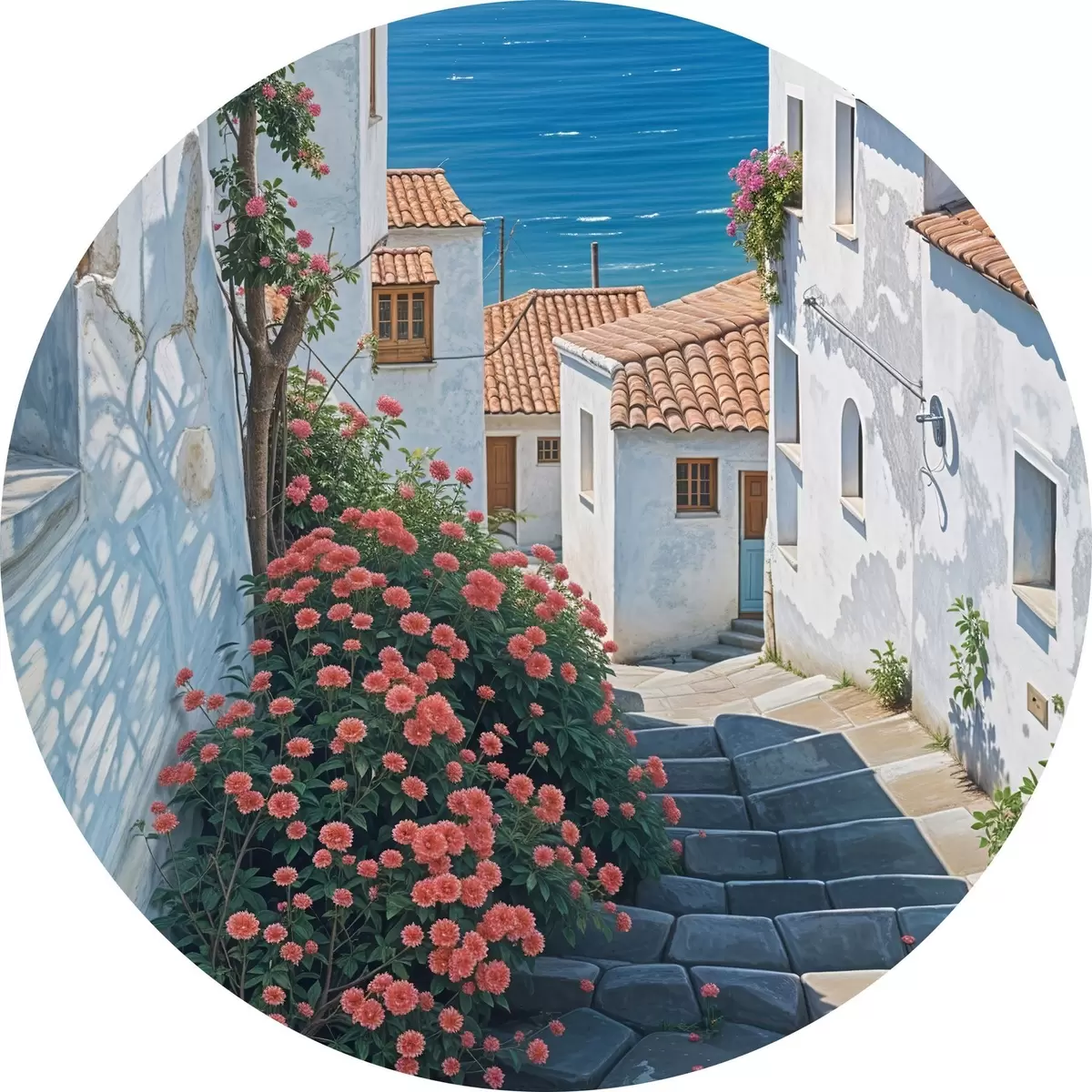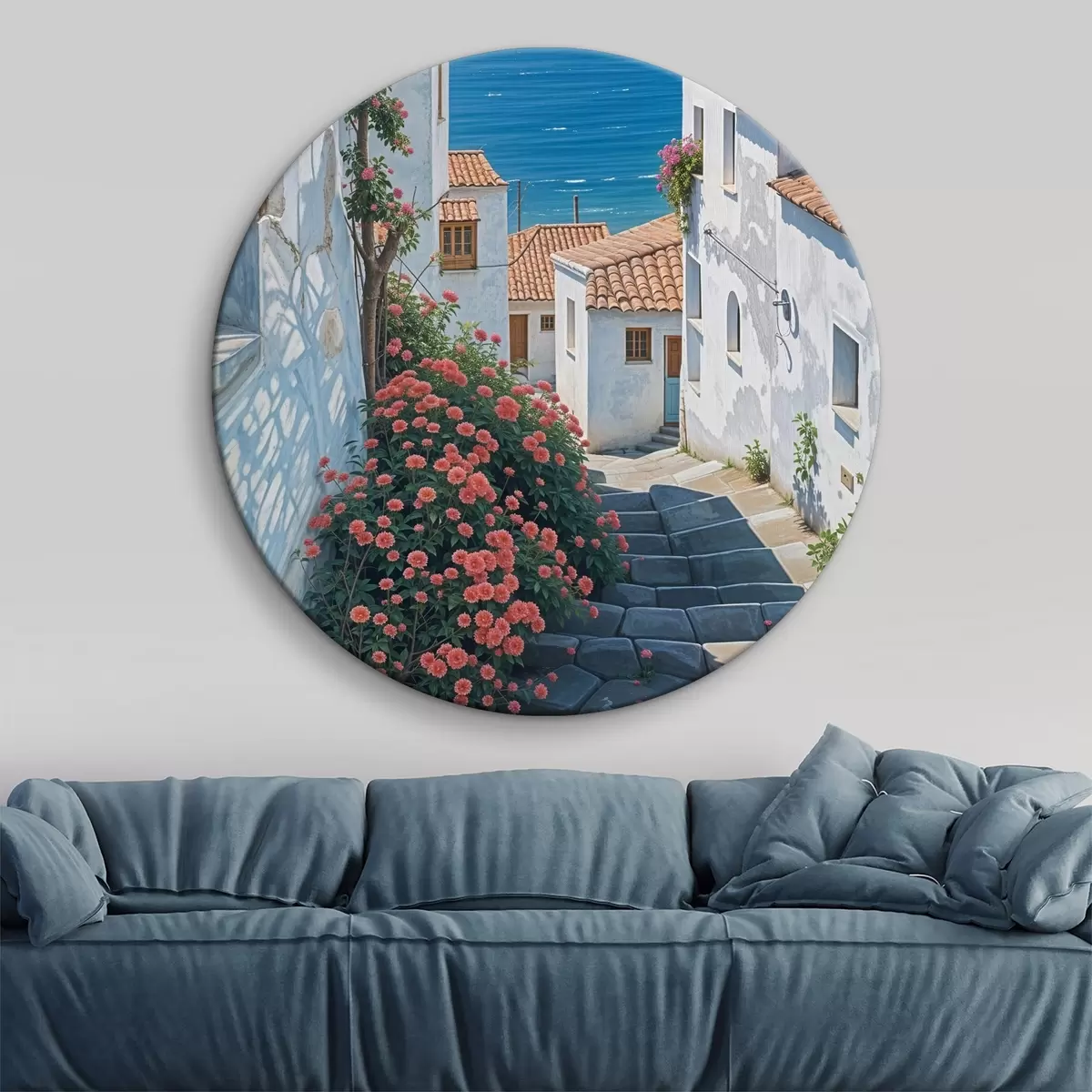 Ronde schilderijen Een smal straatje in een kustplaats, met witte gebouwen, rode pannendaken en levendige roze bloemen r39532