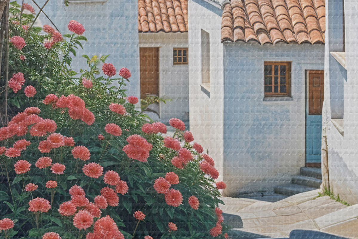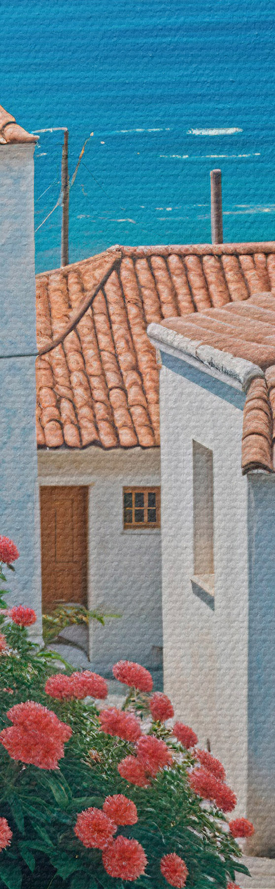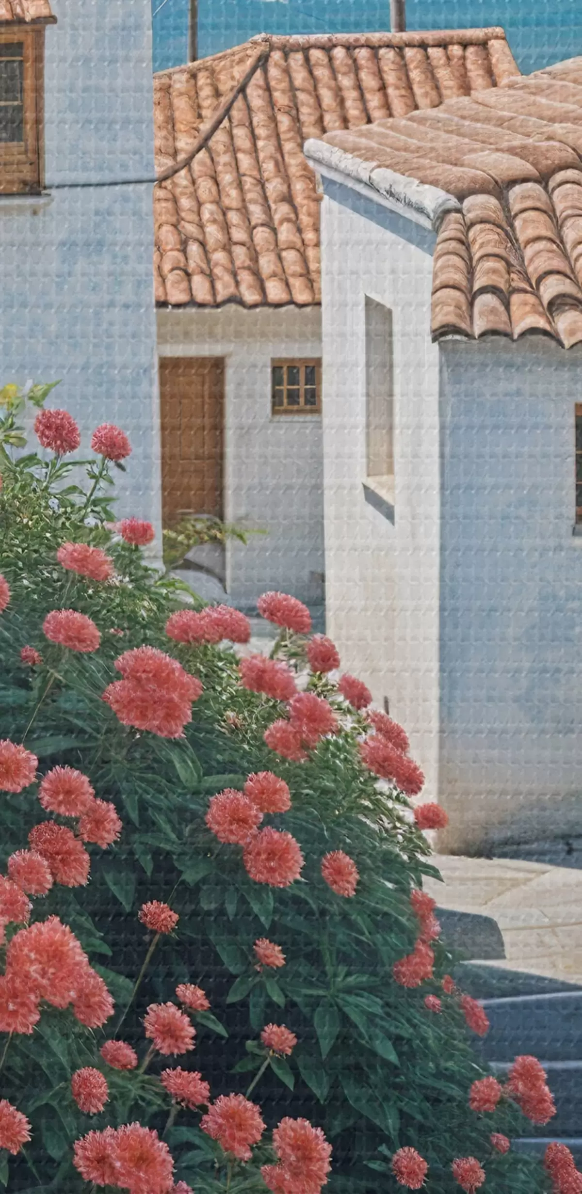 Afbeelding Een smal straatje in een kustplaats, met witte gebouwen, rode pannendaken en levendige roze bloemen Nr r39532