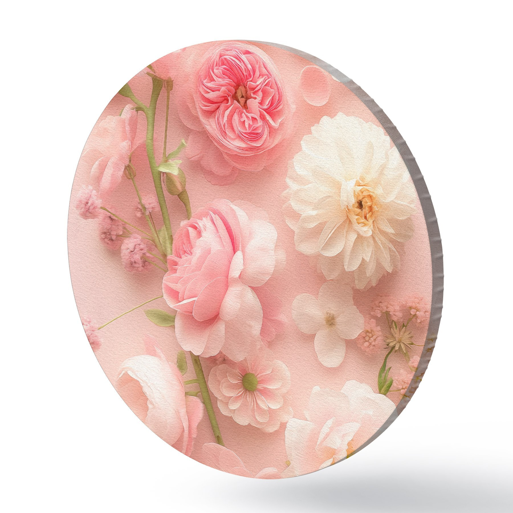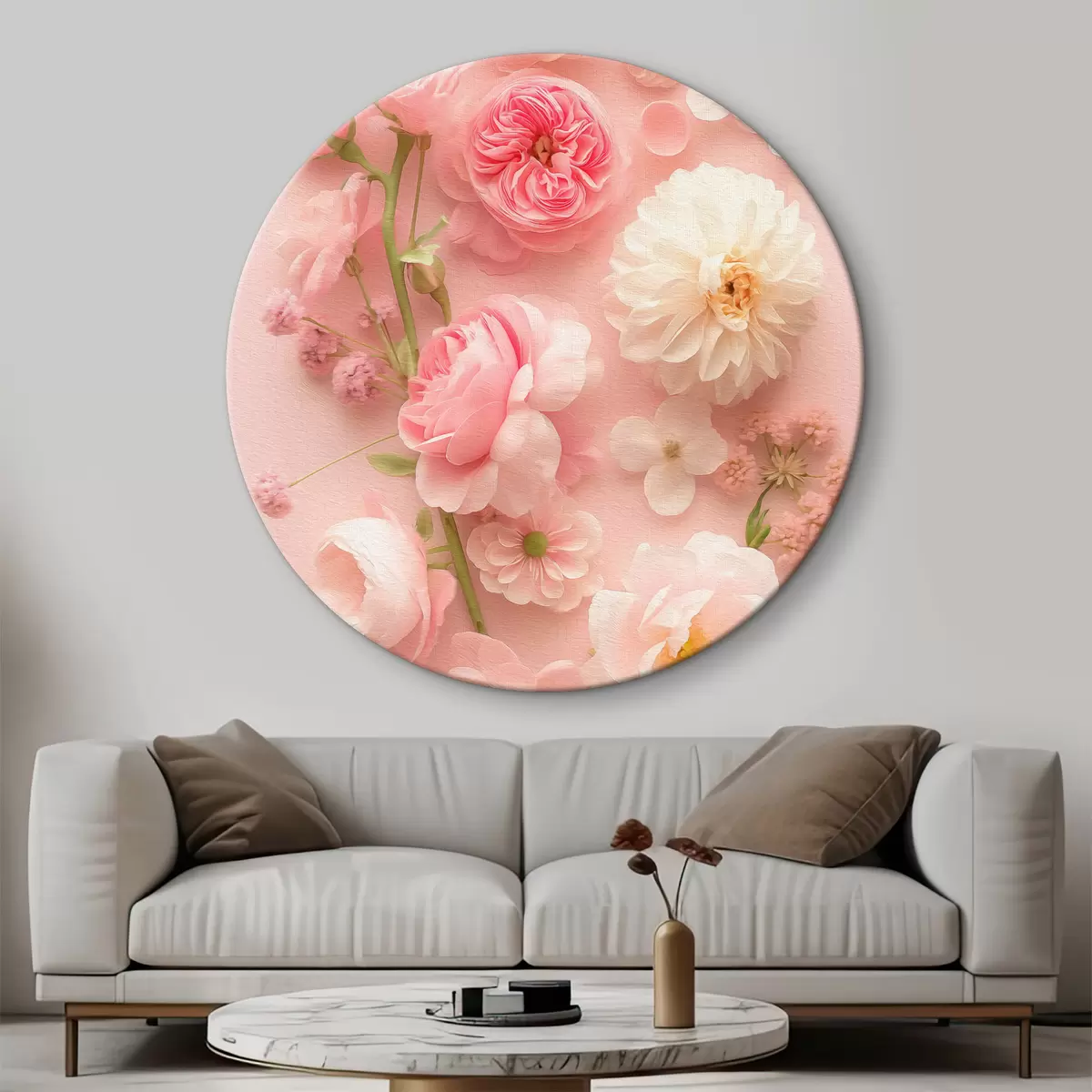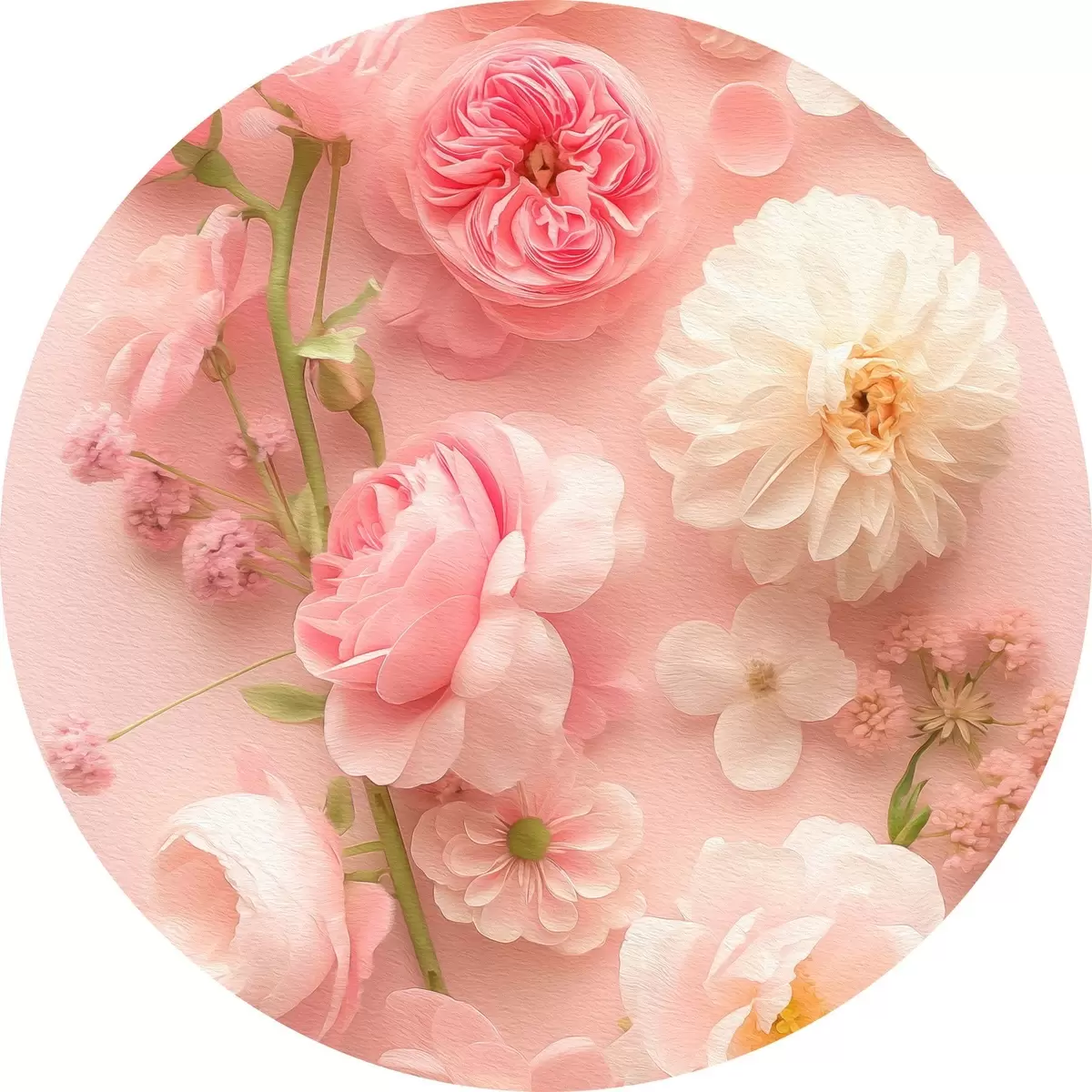 Ronde schilderijen Weelderige bloemen op een roze achtergrond r39576