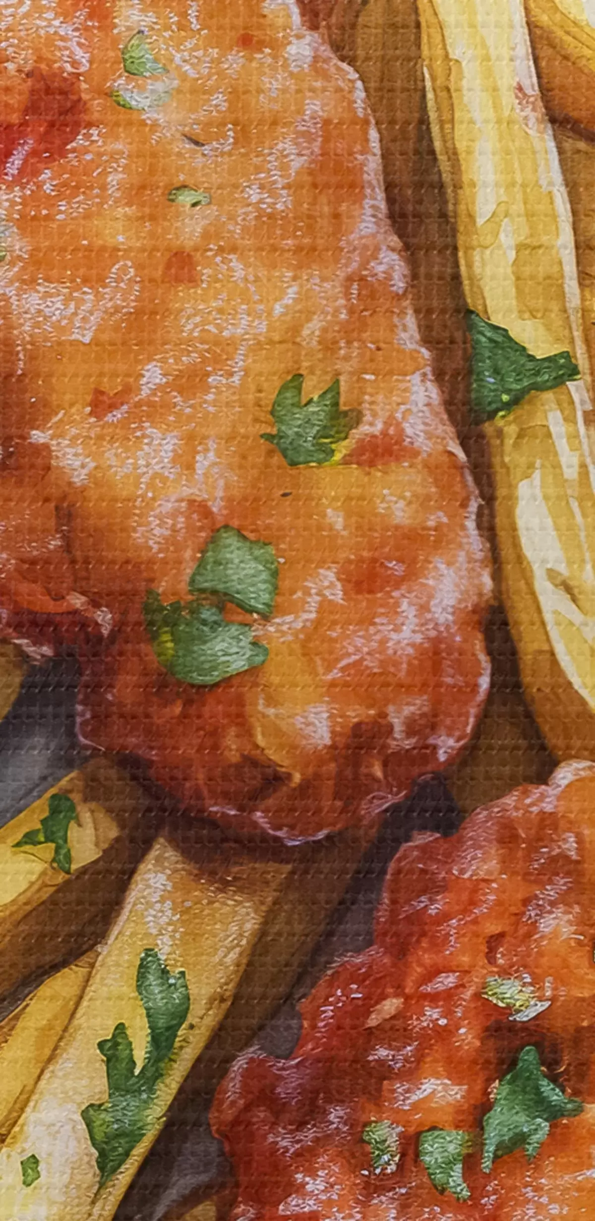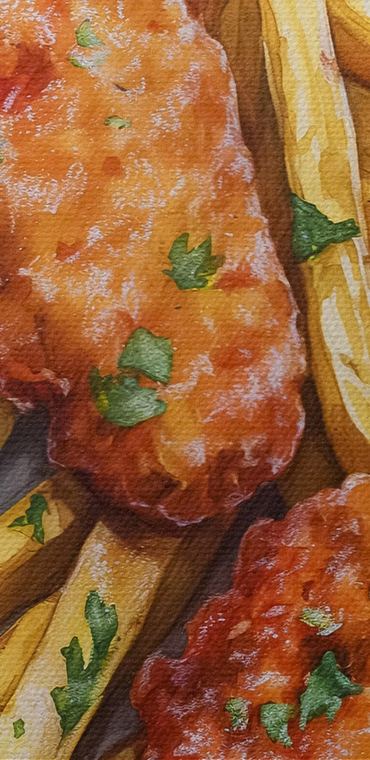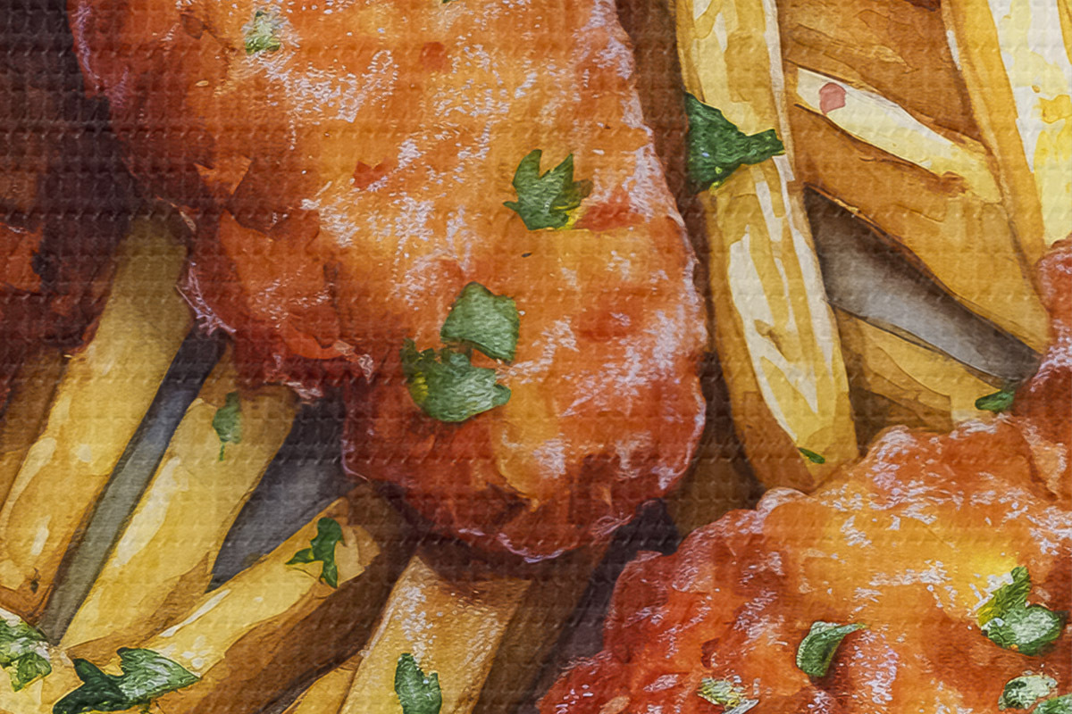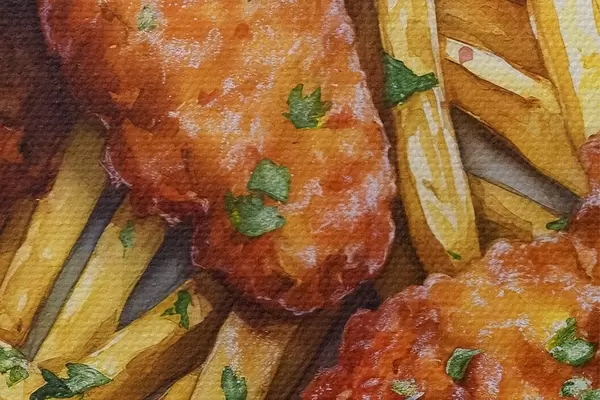 Afbeelding Waterverfvoedselkunst, frietjes met geroosterde kip, heerlijk Nr r39708