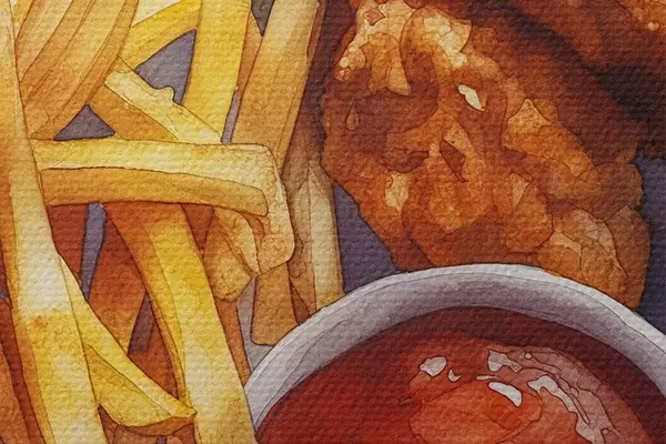 Afbeelding Waterverfstraatvoedsel, frietjes met geroosterde kip, heerlijk Nr r39709