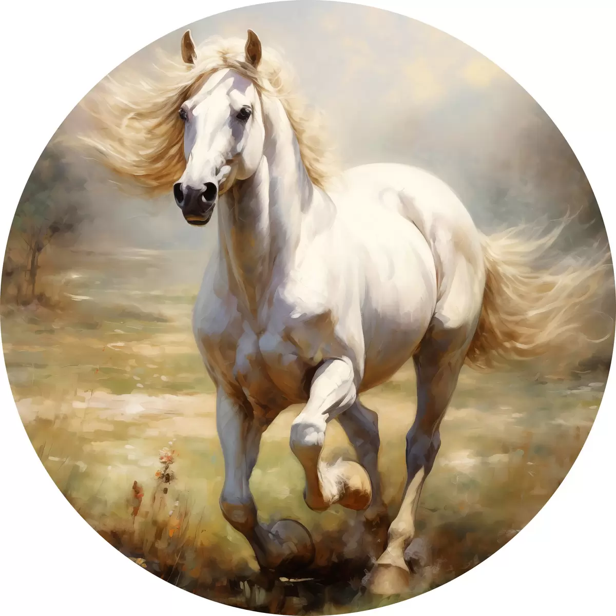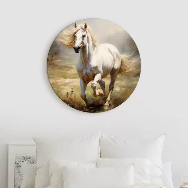 Ronde schilderijen Wit paard dat over het olieverfschilderij van de weide galoppeert r39818