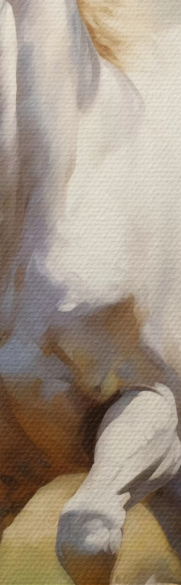 Het schilderij kan voorzichtig worden schoongeveegd met een droge zachte doek of spons; het wordt niet aanbevolen om natte producten te gebruiken. Het gebruik van een vochtige spons is alleen toegestaan als het schilderij gevernist is.
