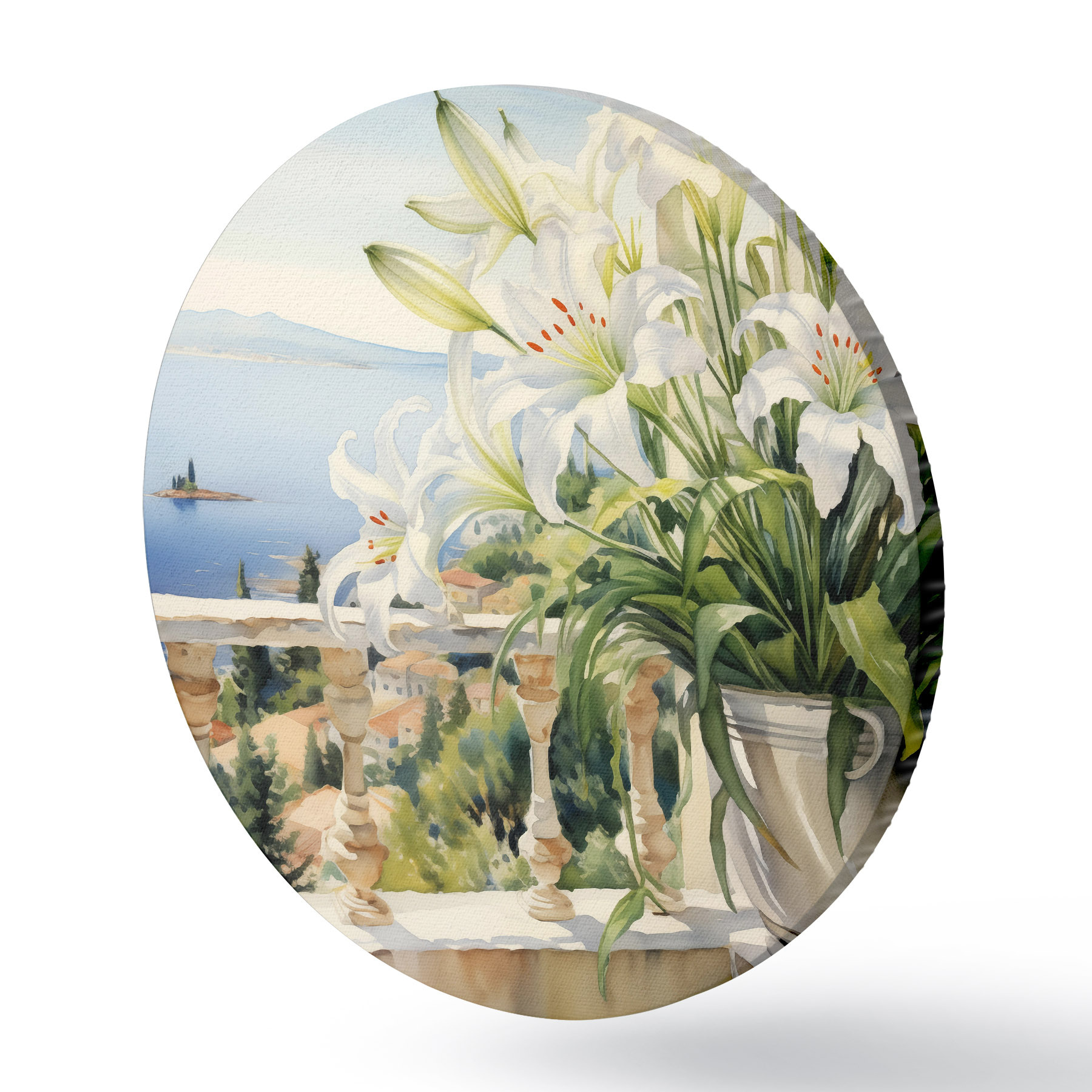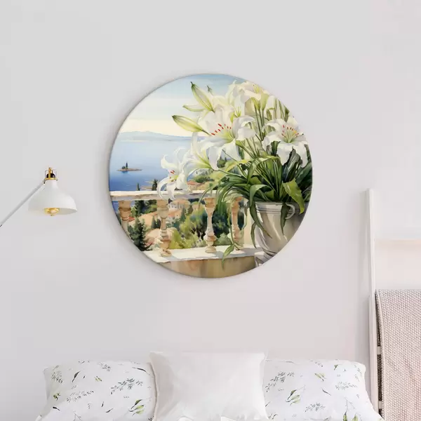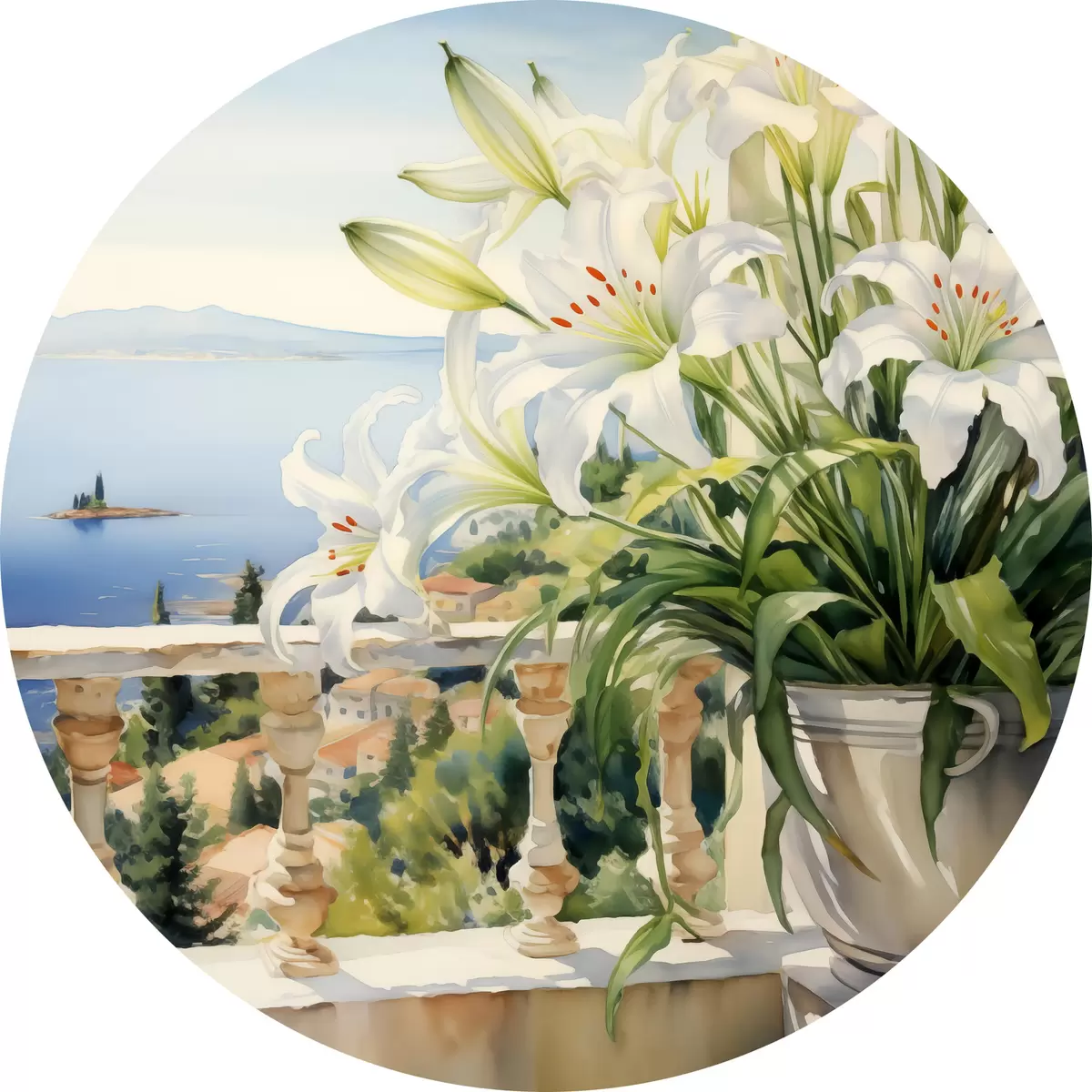 Ronde schilderijen Witte lelies in een pot op een balkon tegen de achtergrond van de baai aquarel r39932