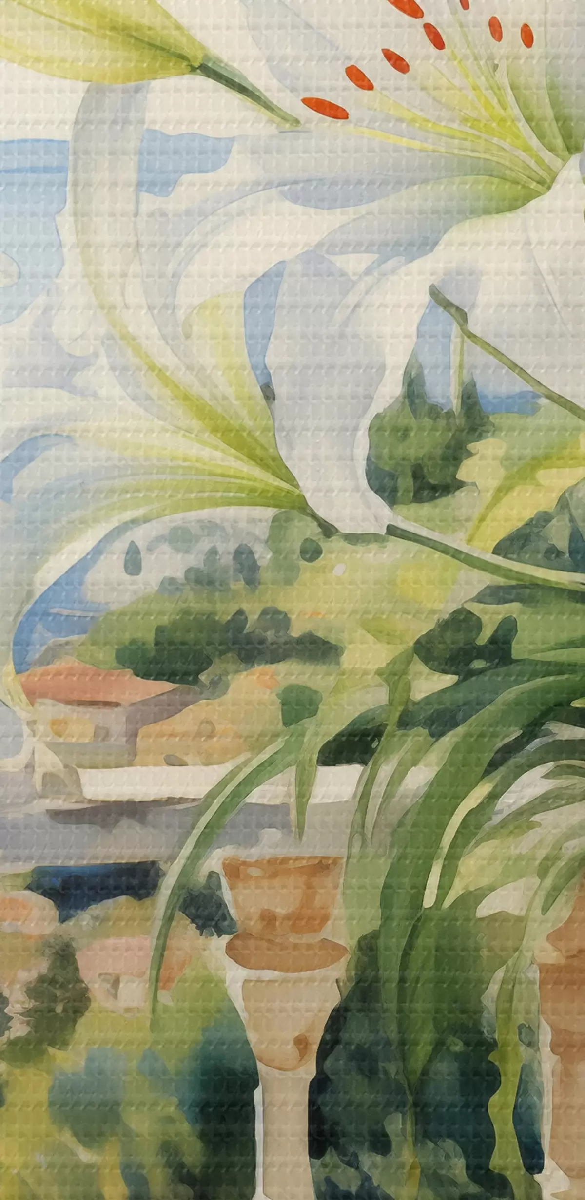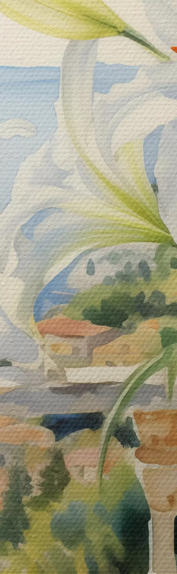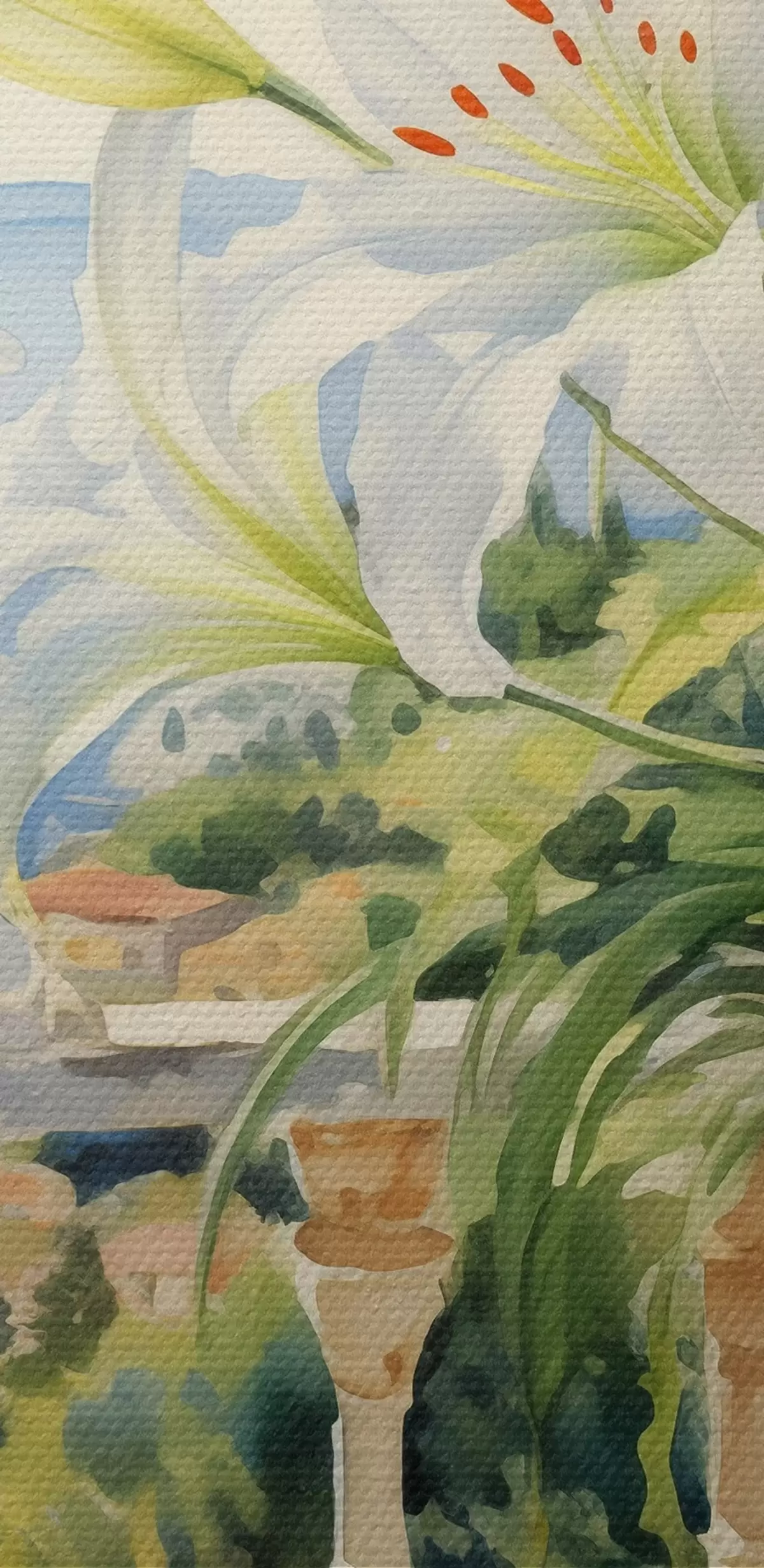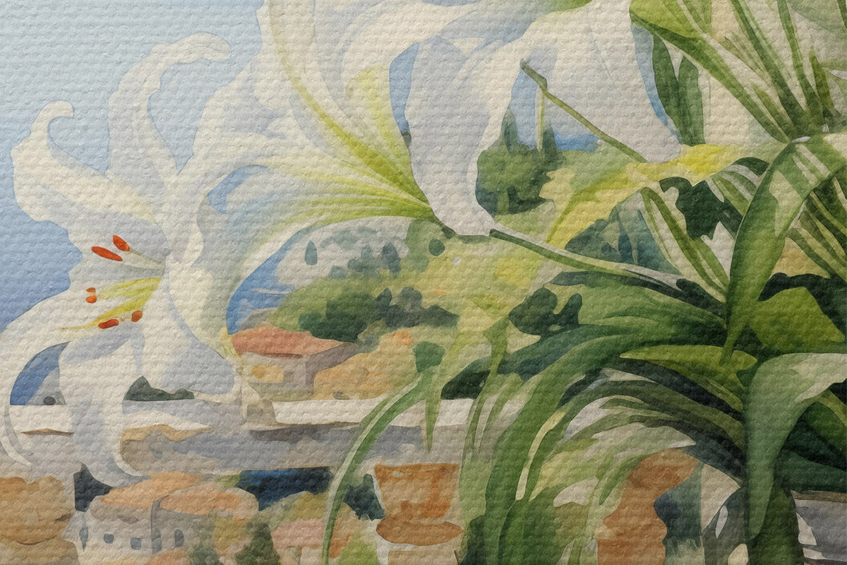 Afbeelding Witte lelies in een pot op een balkon tegen de achtergrond van de baai aquarel Nr r39932