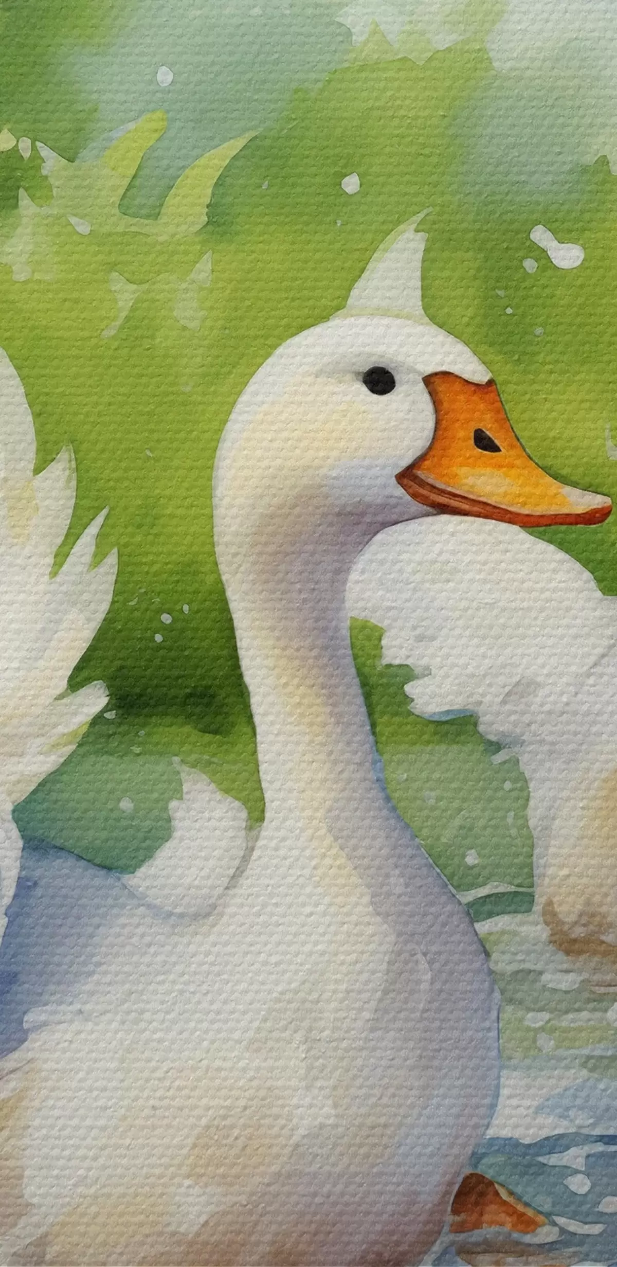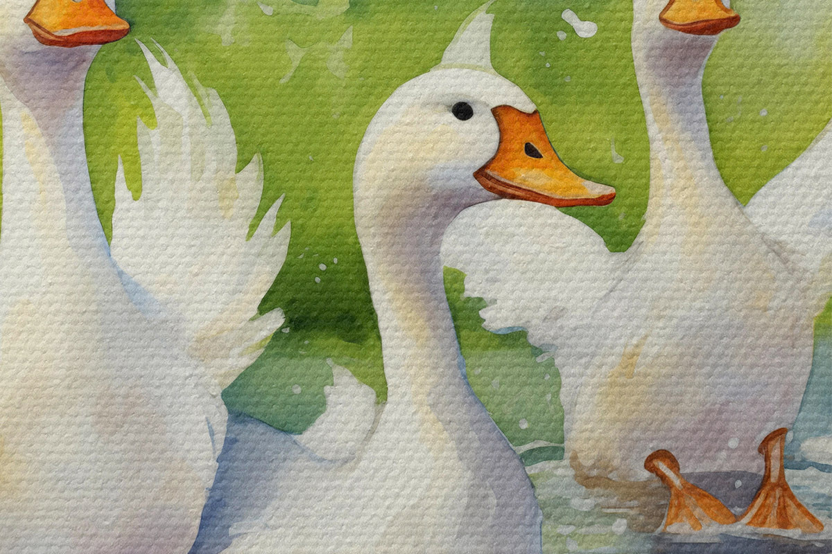 Afbeelding Witte ganzen badend in een vijver aquarel schilderij Nr r39939
