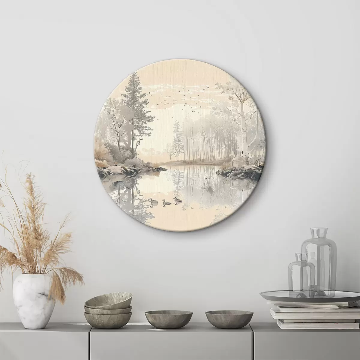 Ronde schilderijen Prachtig natuurlandschap, vijver en bomen, wilde dieren, zachte pastelkleuren r39980