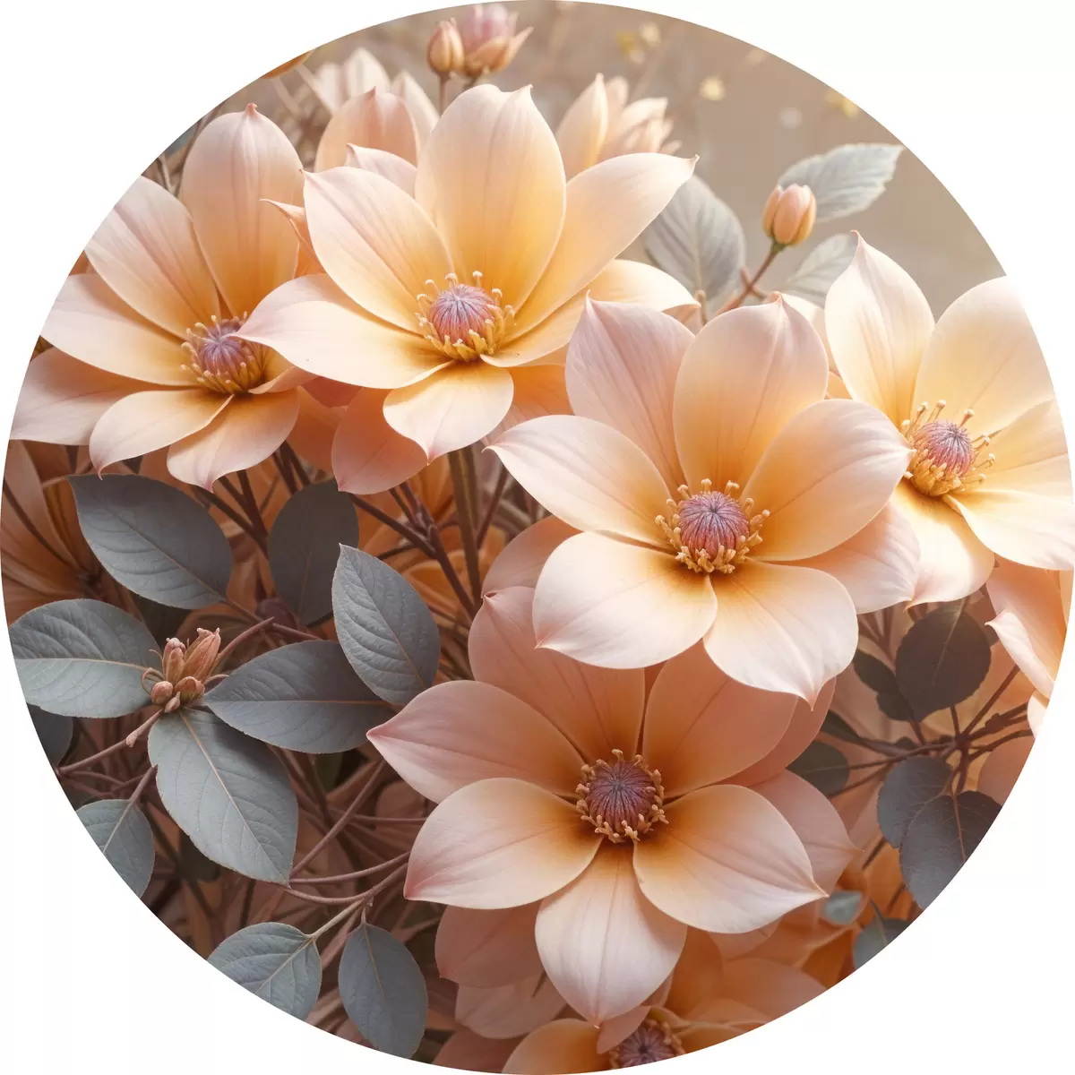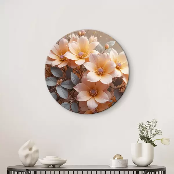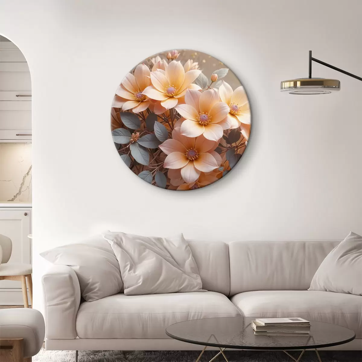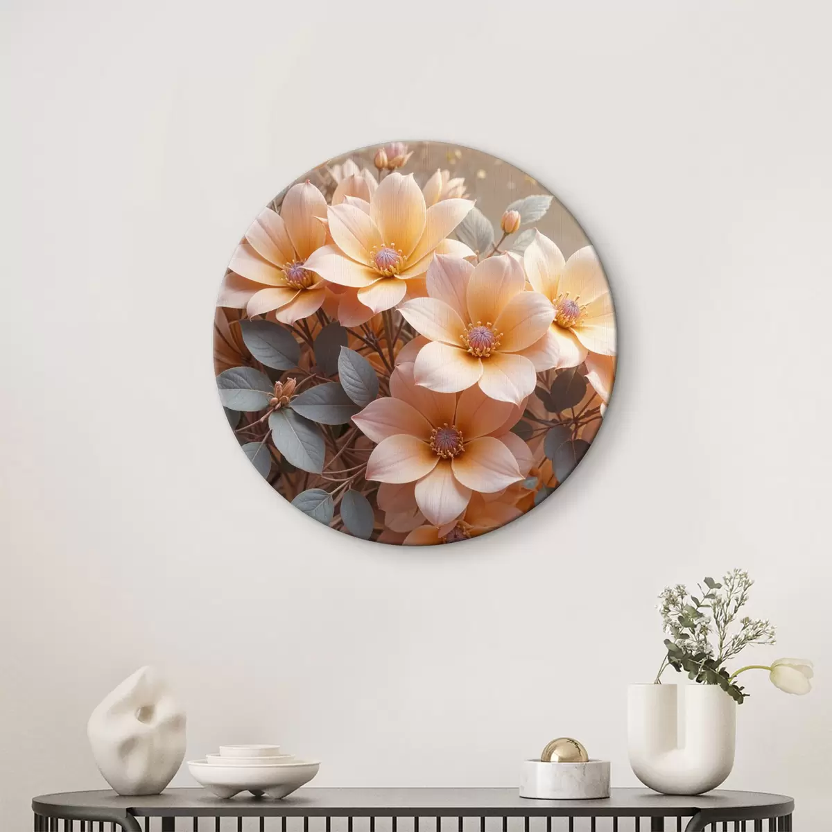 Ronde schilderijen Tedere perzikkleurige dahliabloemen in volle bloei, met zachte bloemblaadjes tegen een wazige achtergrond r40024