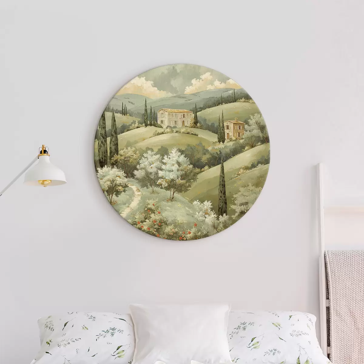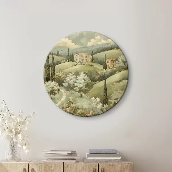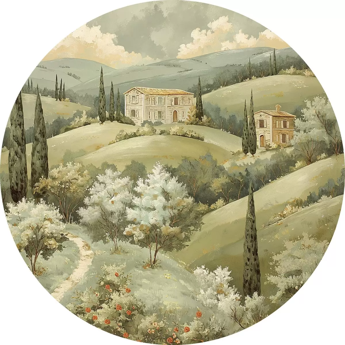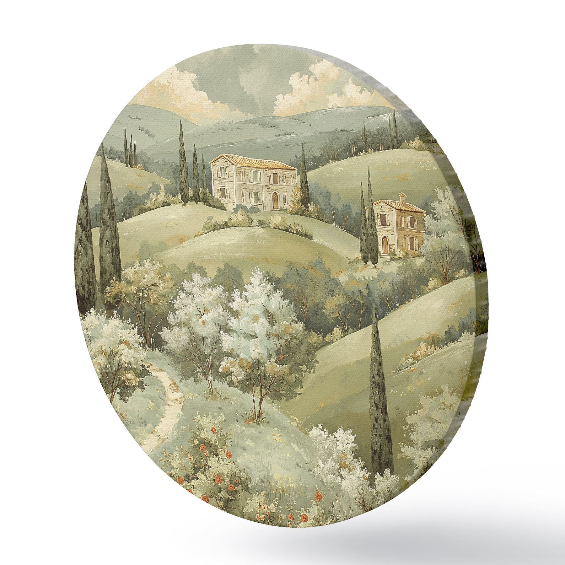 Ronde schilderijen Landschap met vintage huizen, pastelgroene kleuren, acryltekening, zomer r40078