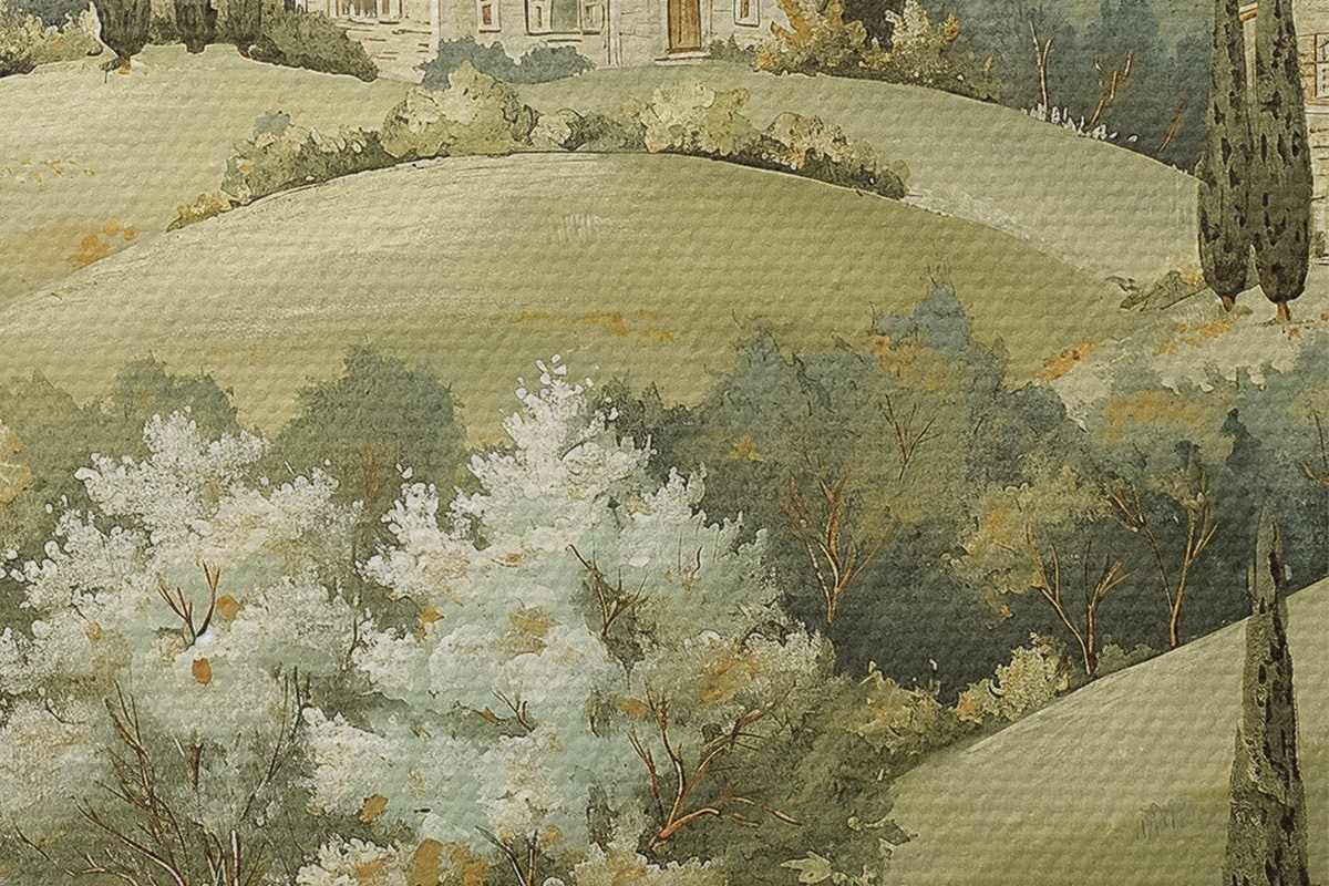Afbeelding Landschap met vintage huizen, pastelgroene kleuren, acryltekening, zomer Nr r40078