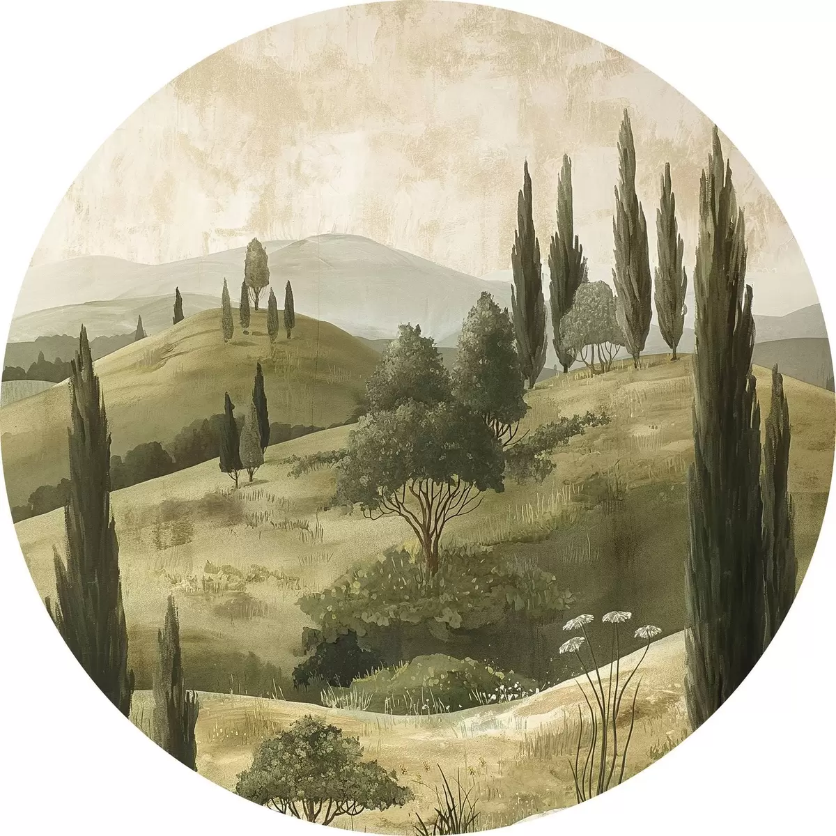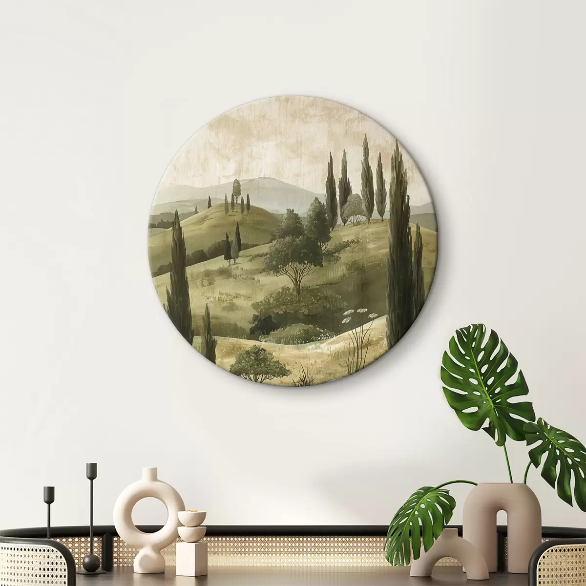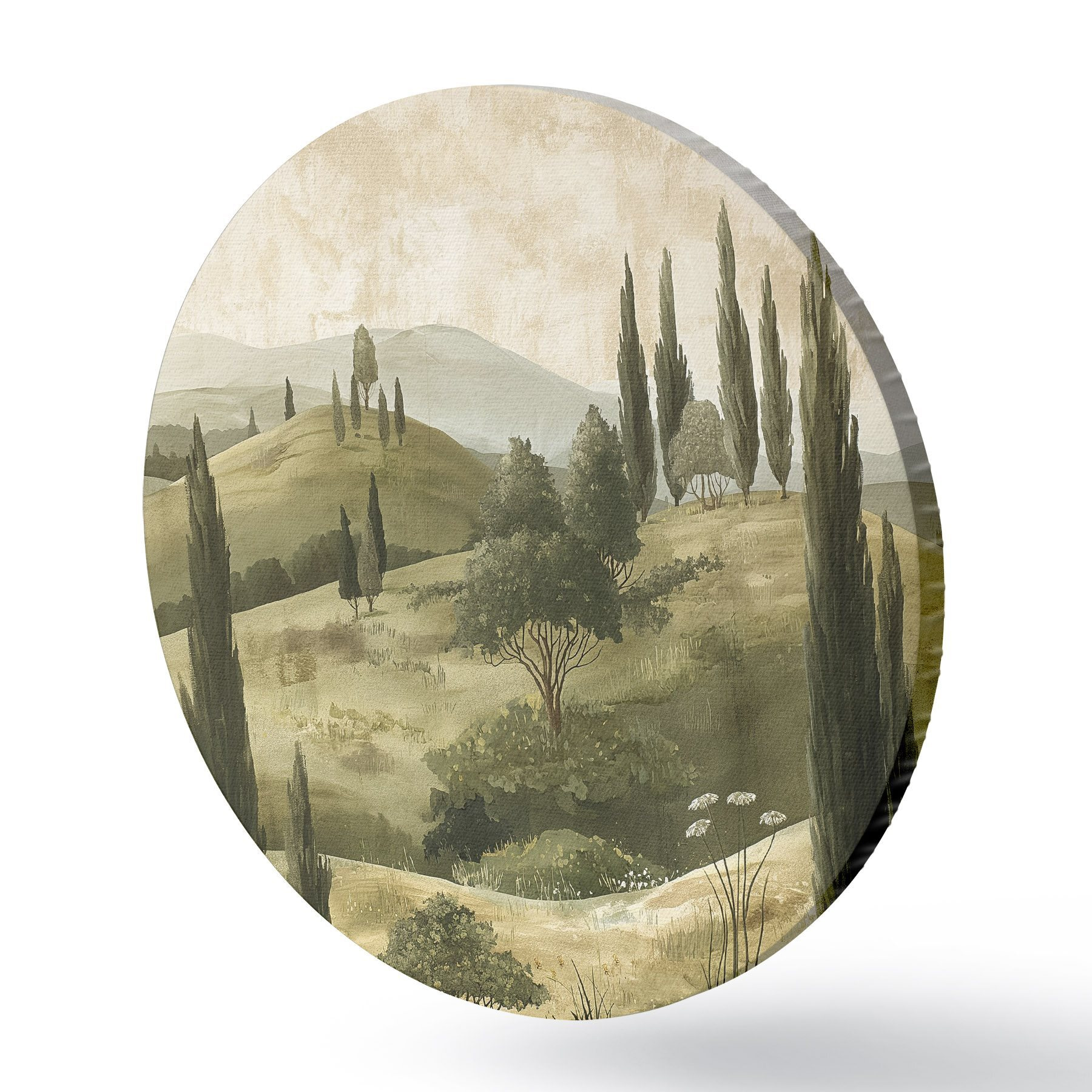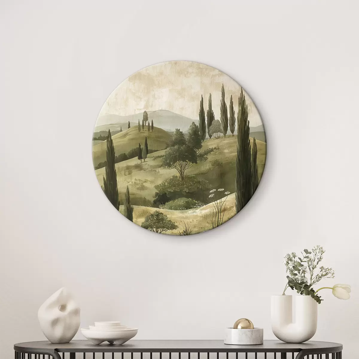 Ronde schilderijen Vintage landschap, rustieke stijl, pastelkleuren, weide met bloemen en bomen r40081