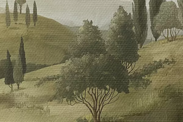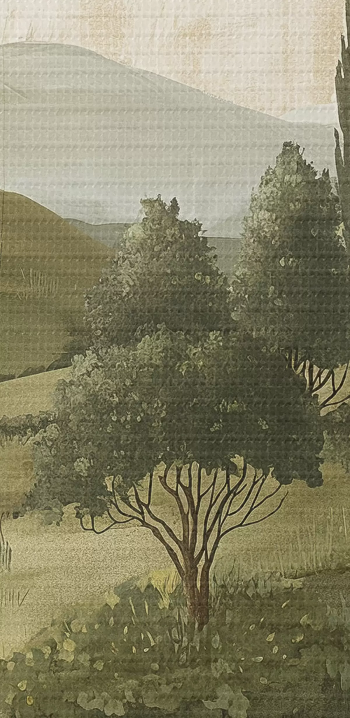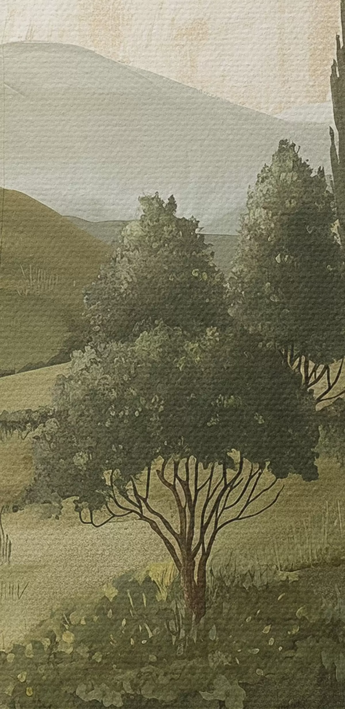 Afbeelding Vintage landschap, rustieke stijl, pastelkleuren, weide met bloemen en bomen Nr r40081