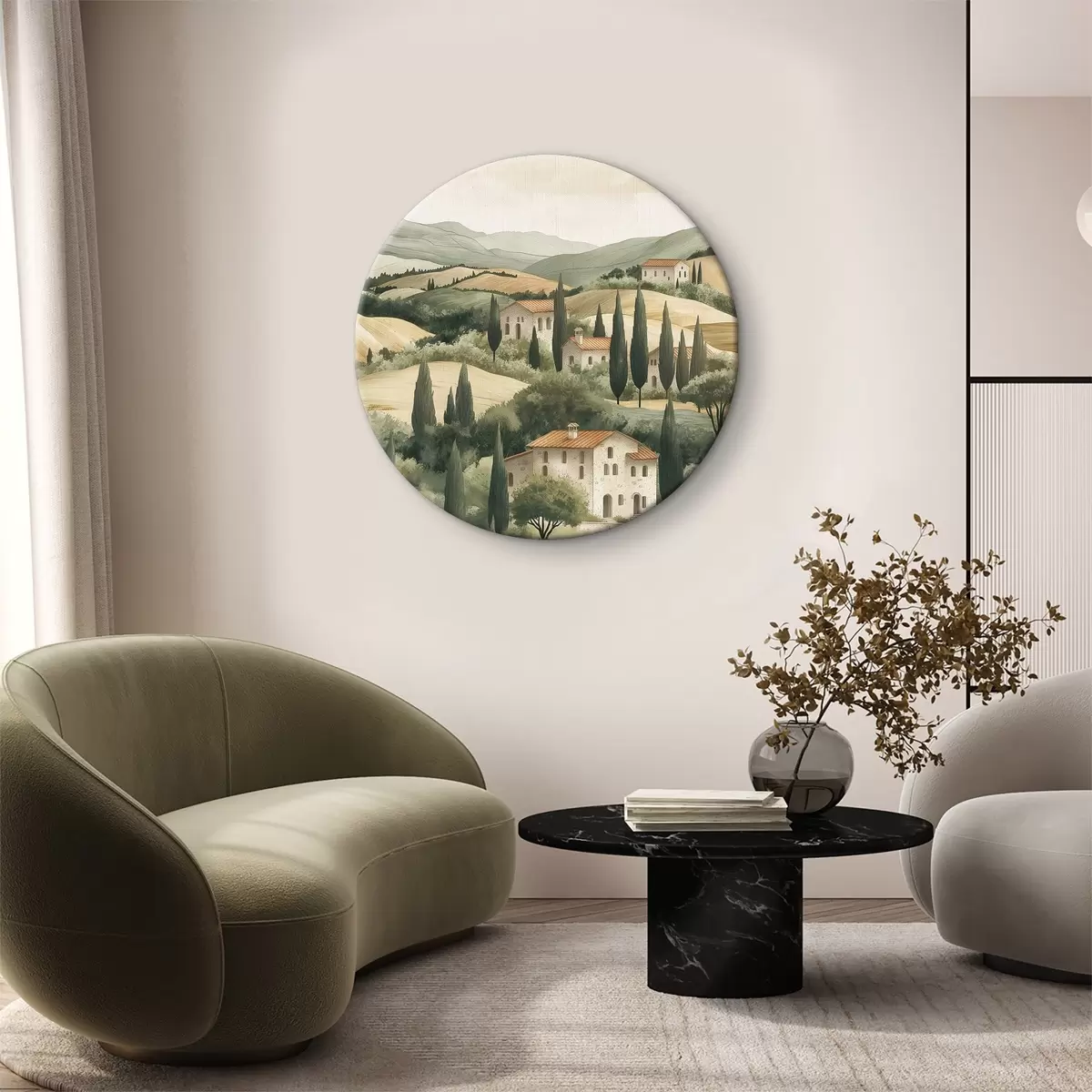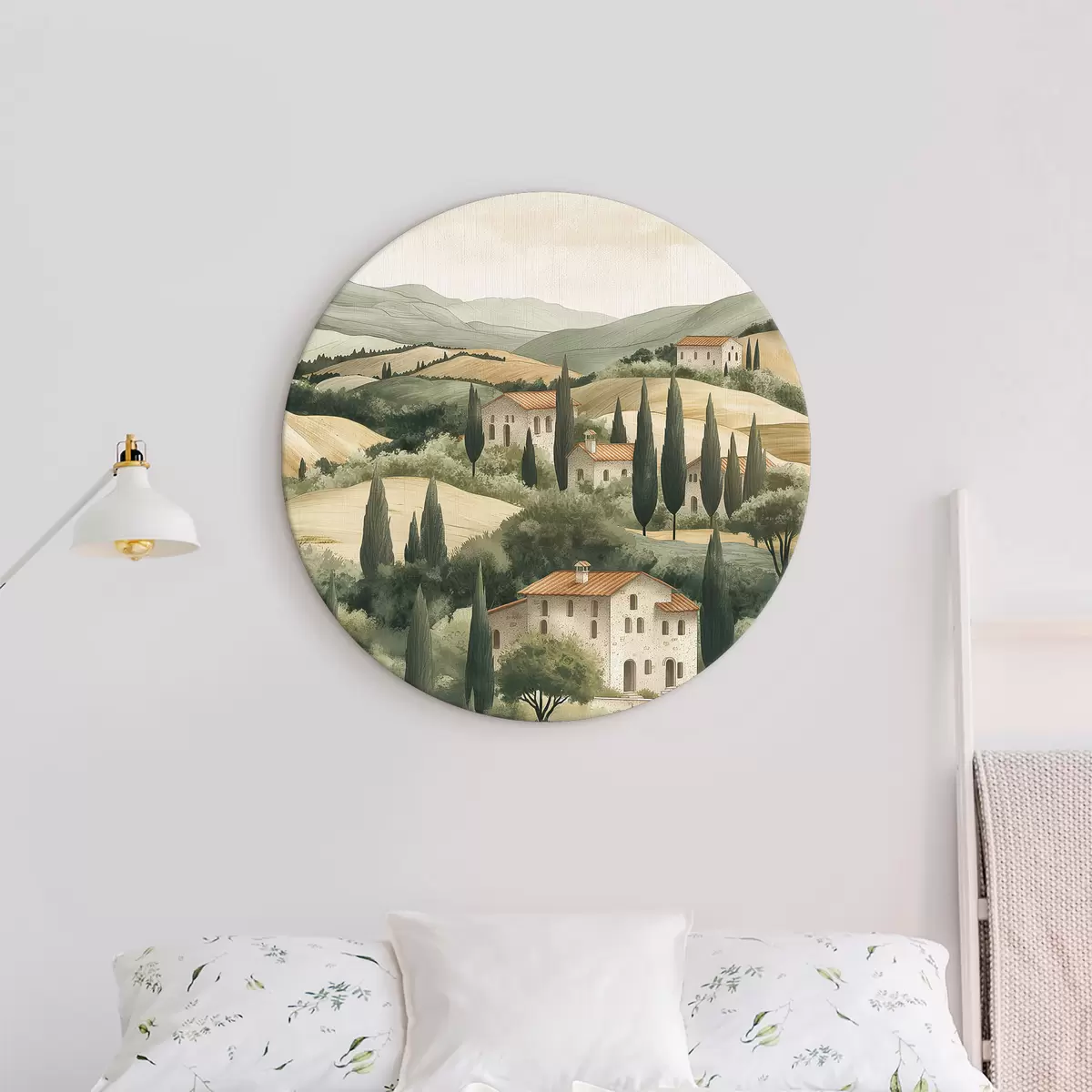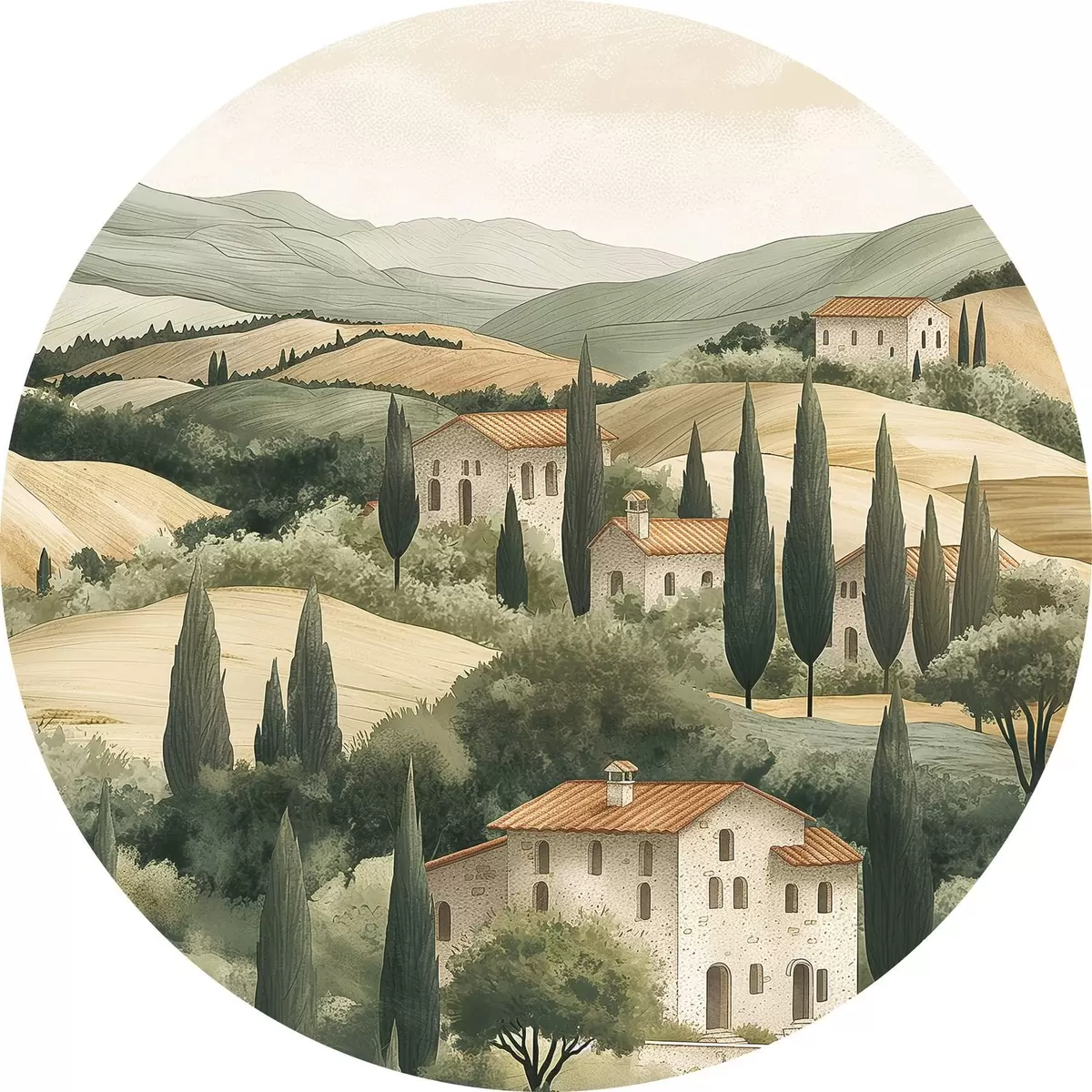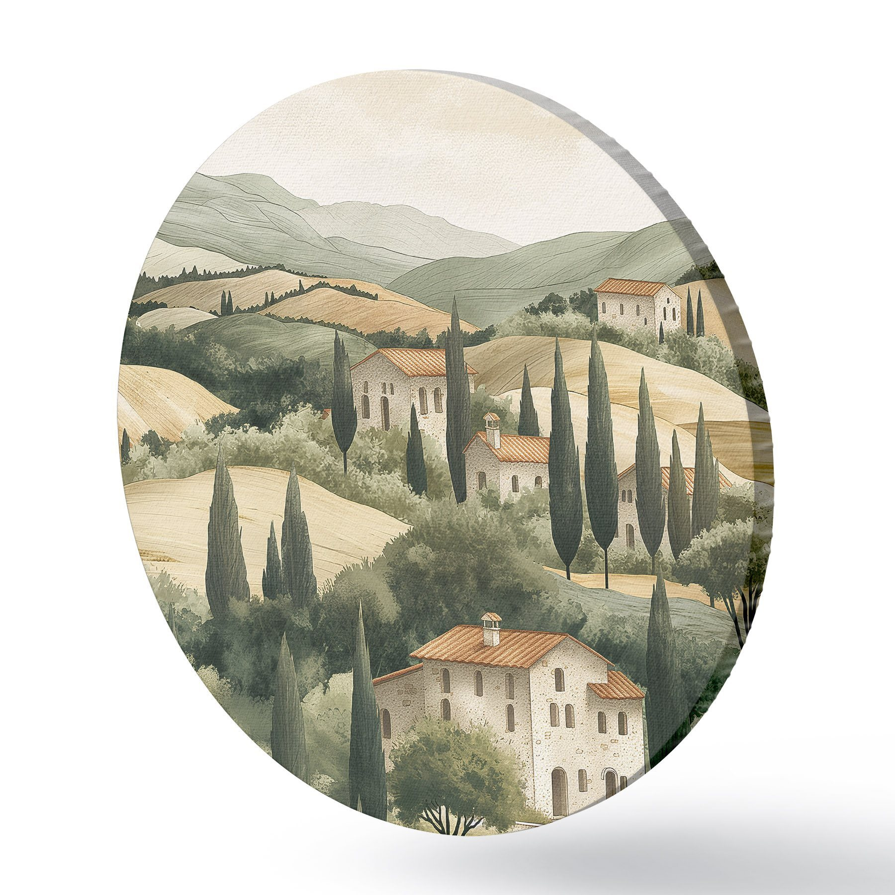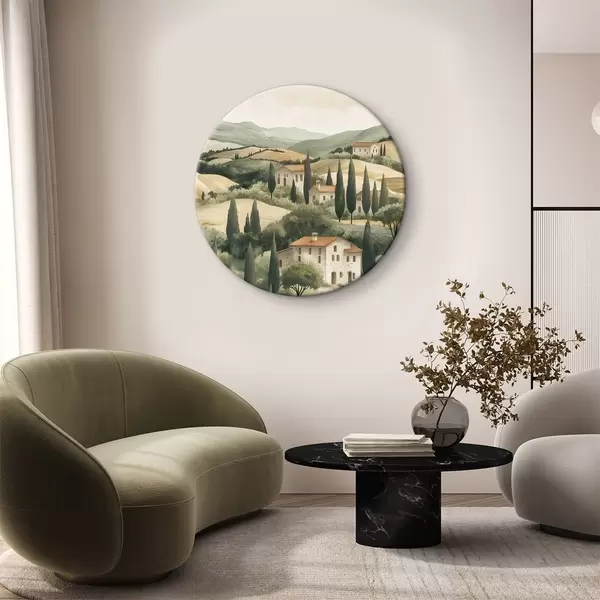 Ronde schilderijen Toscaans landschap met oude huizen, pastelkleuren, heuvels en bomen, rustiek r40082