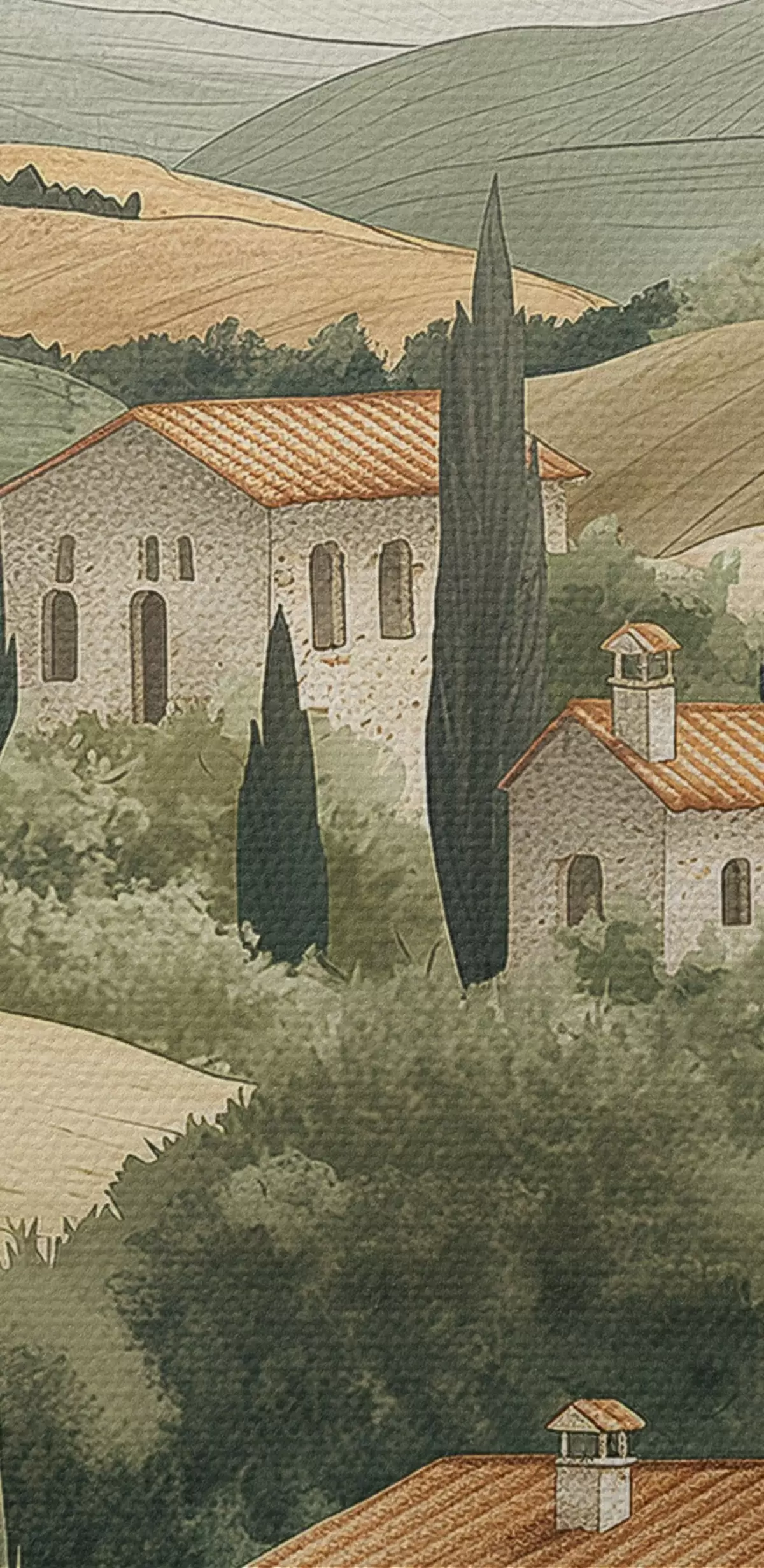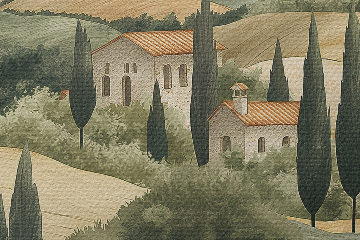 Afbeelding Toscaans landschap met oude huizen, pastelkleuren, heuvels en bomen, rustiek Nr r40082