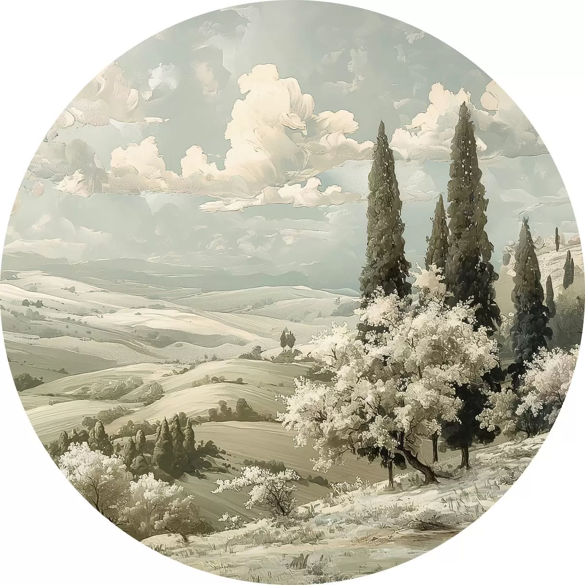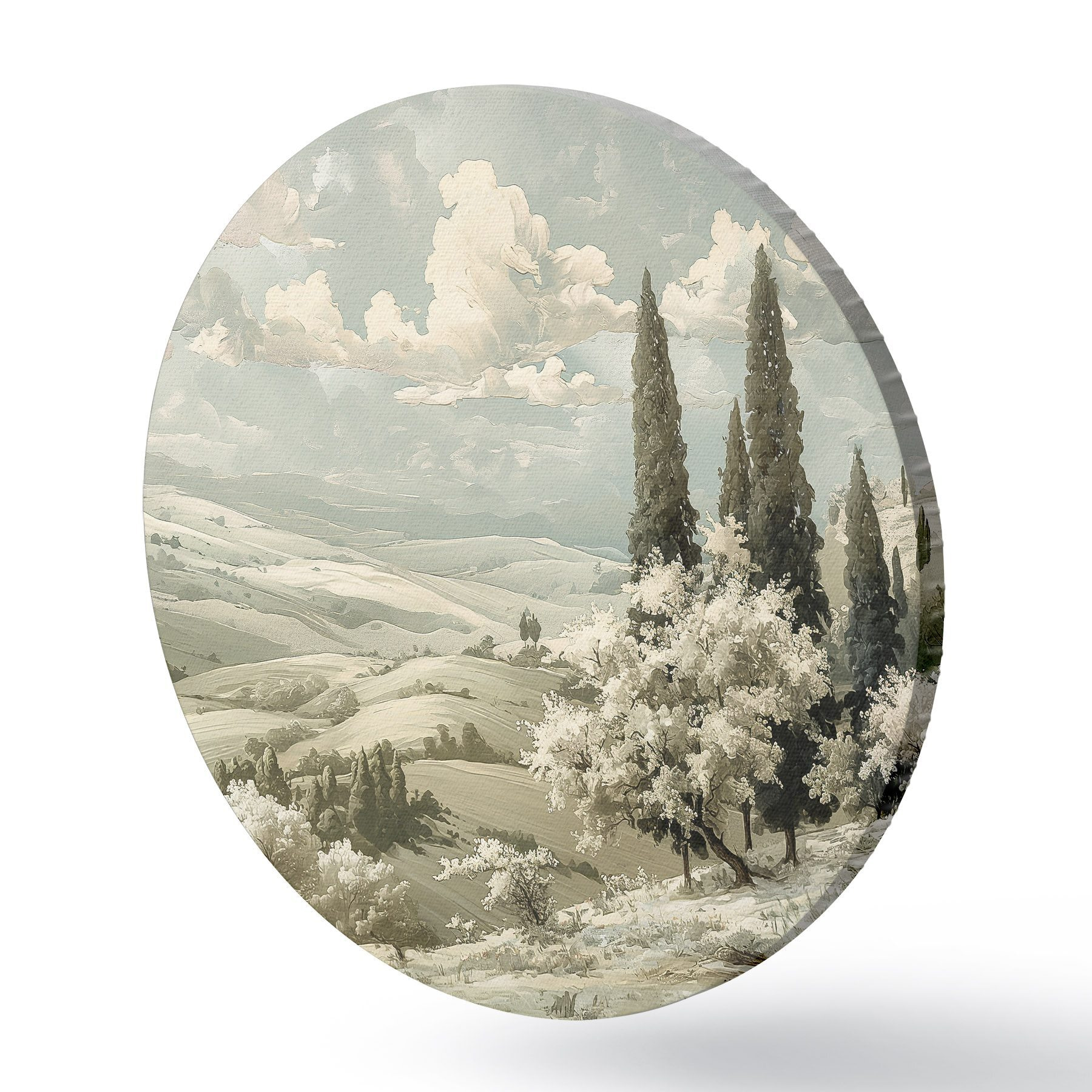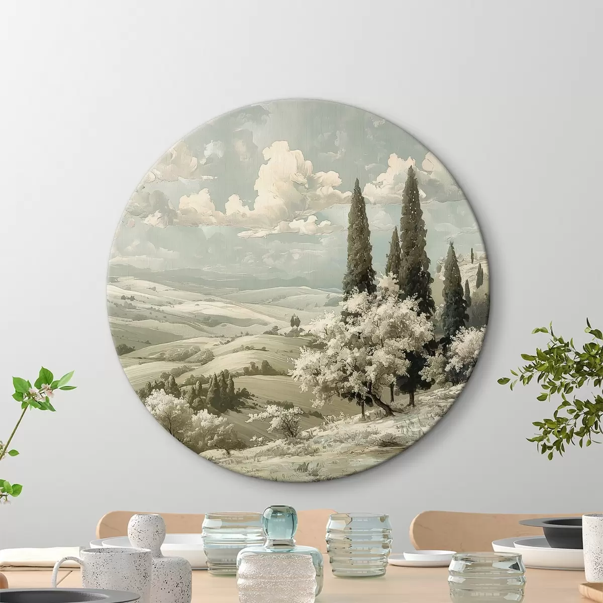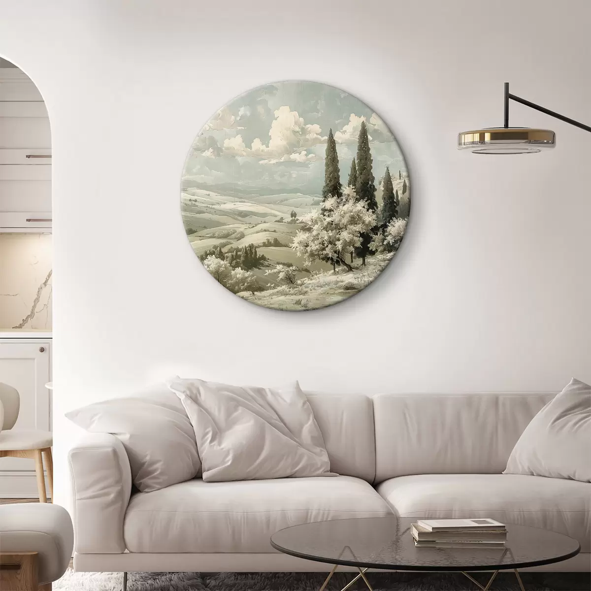 Ronde schilderijen Zomerlandschap, vintage stijl, pastelkleuren, acryl tekening, kasteel r40084