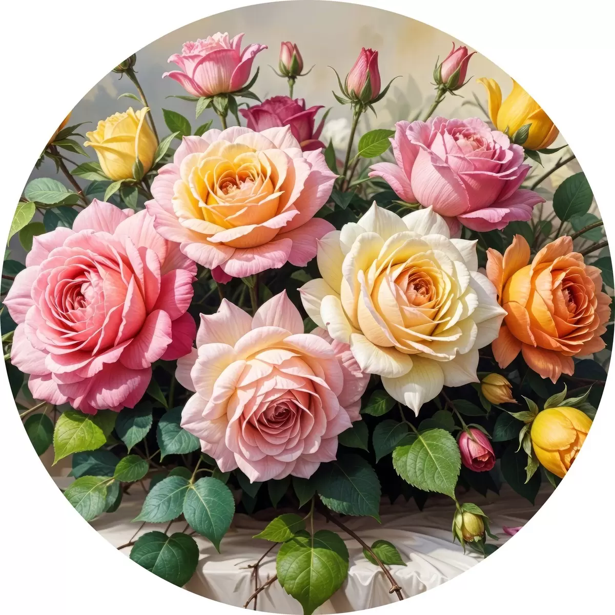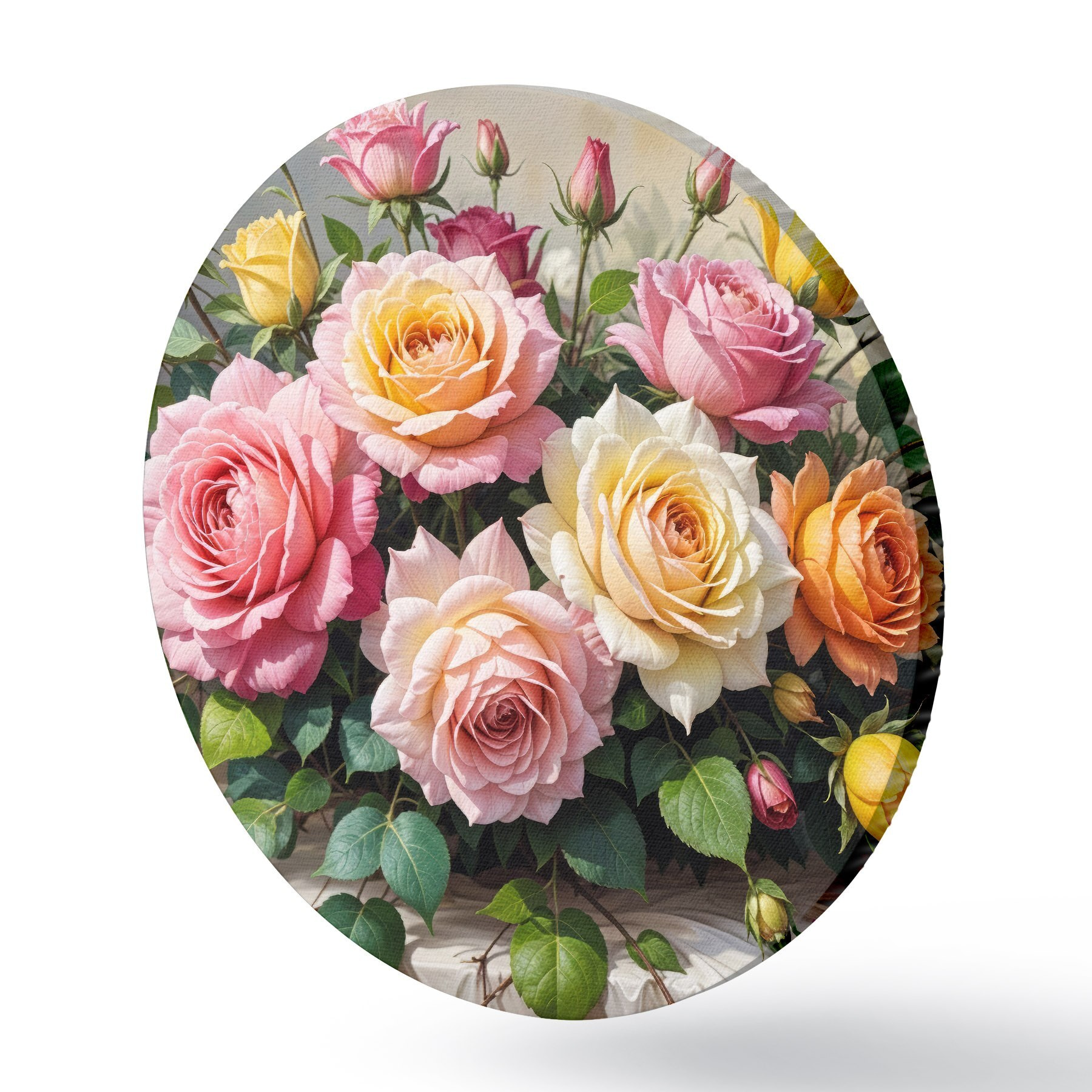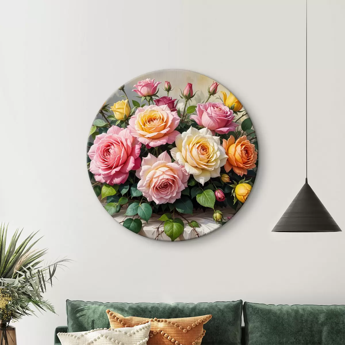 Ronde schilderijen Een boeket kleurrijke rozen in verschillende tinten roze, geel en oranje, gerangschikt met groene bladeren r40149