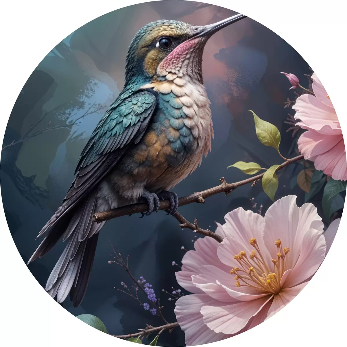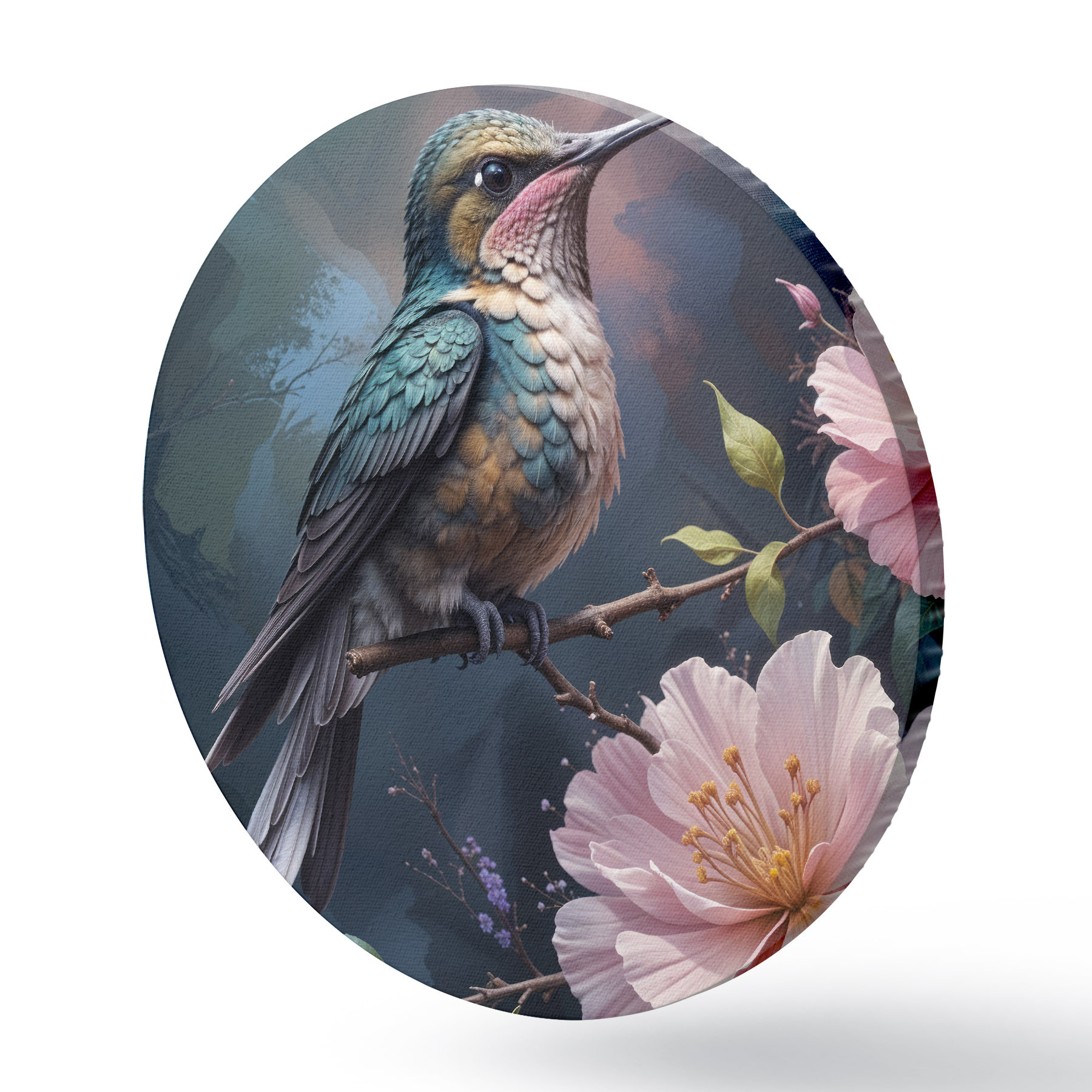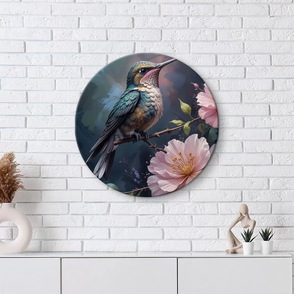 Ronde schilderijen Een kleurrijke kolibrie zit op een tak met op de achtergrond levendige roze bloemen r40155