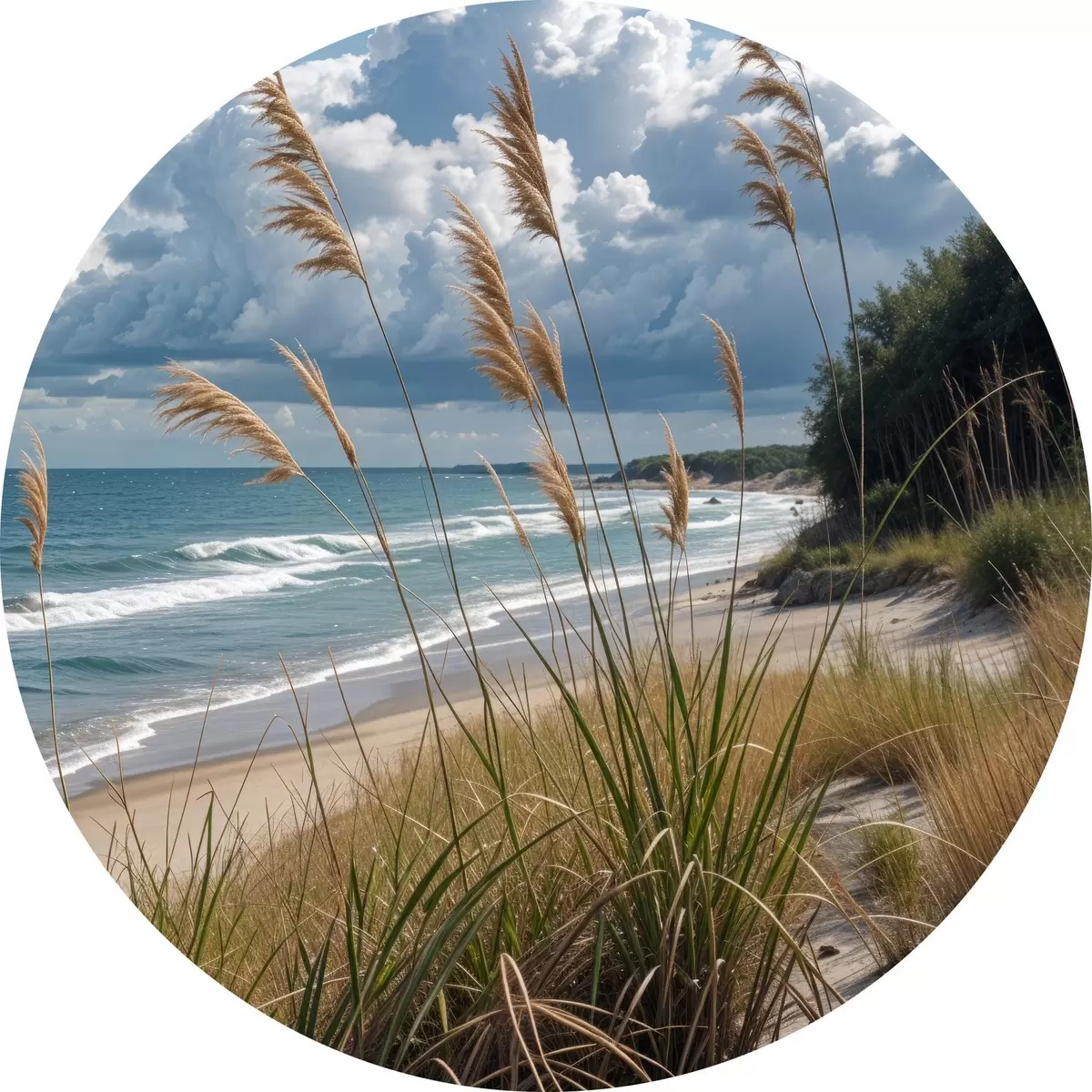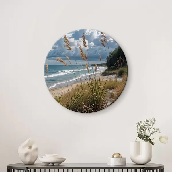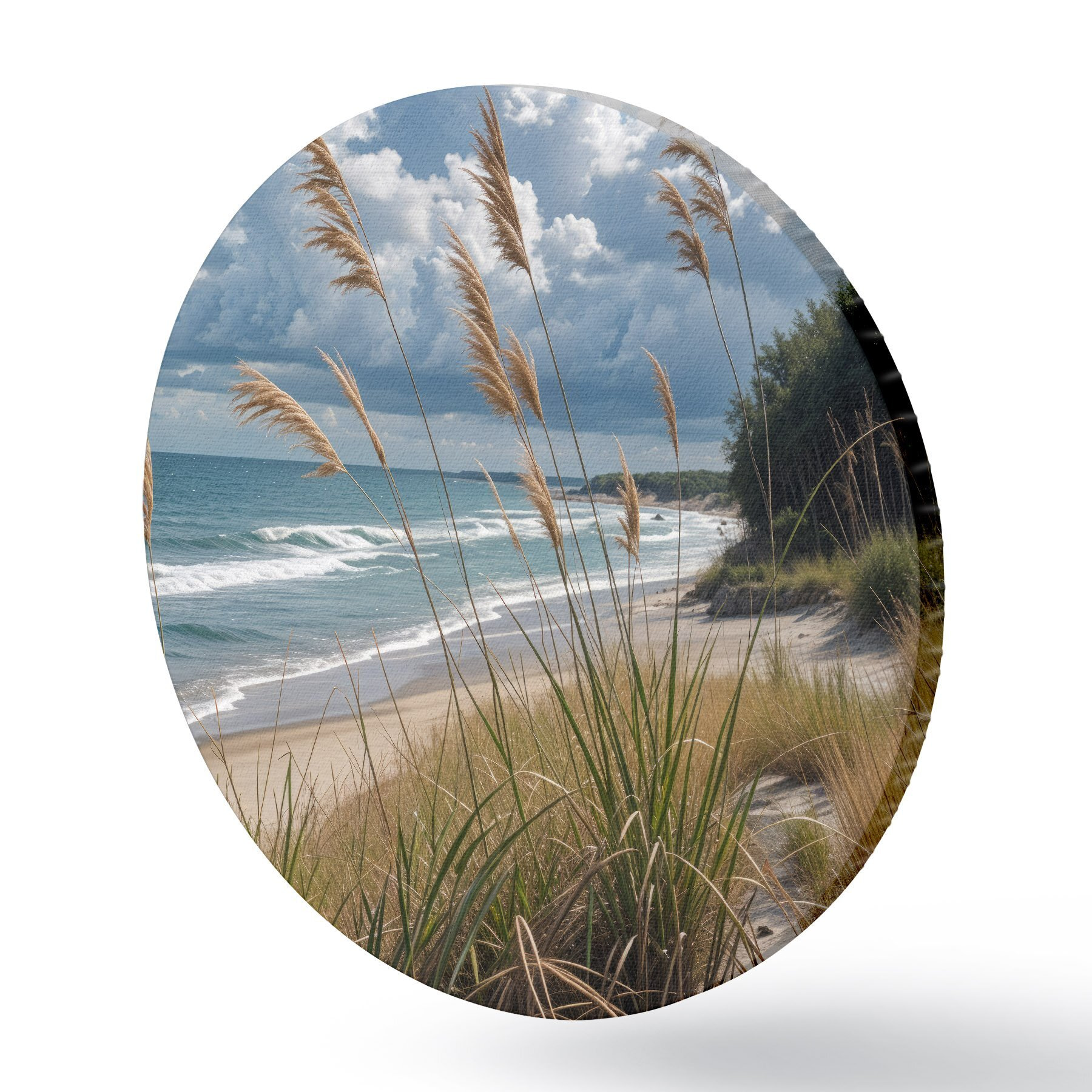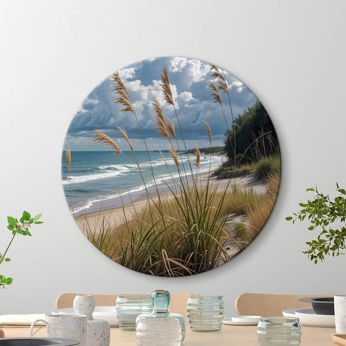Ronde schilderijen Een schilderachtig strand met hoog gras dat in de wind wuift, met uitzicht op de oceaan met beukende golven en een bewolkte lucht r40161