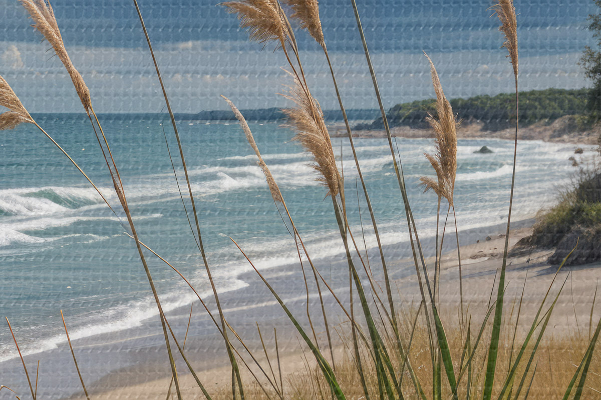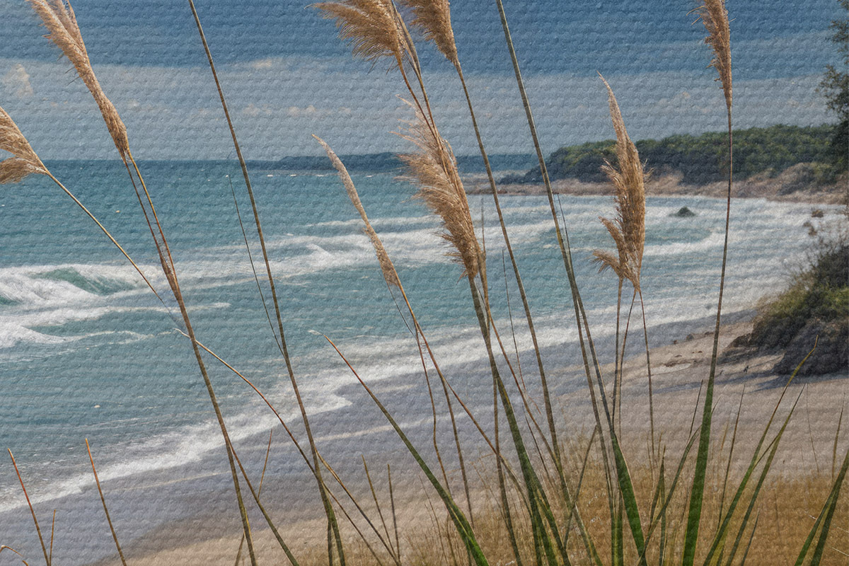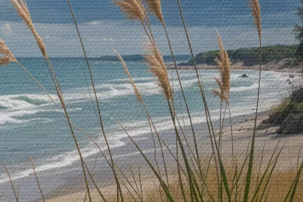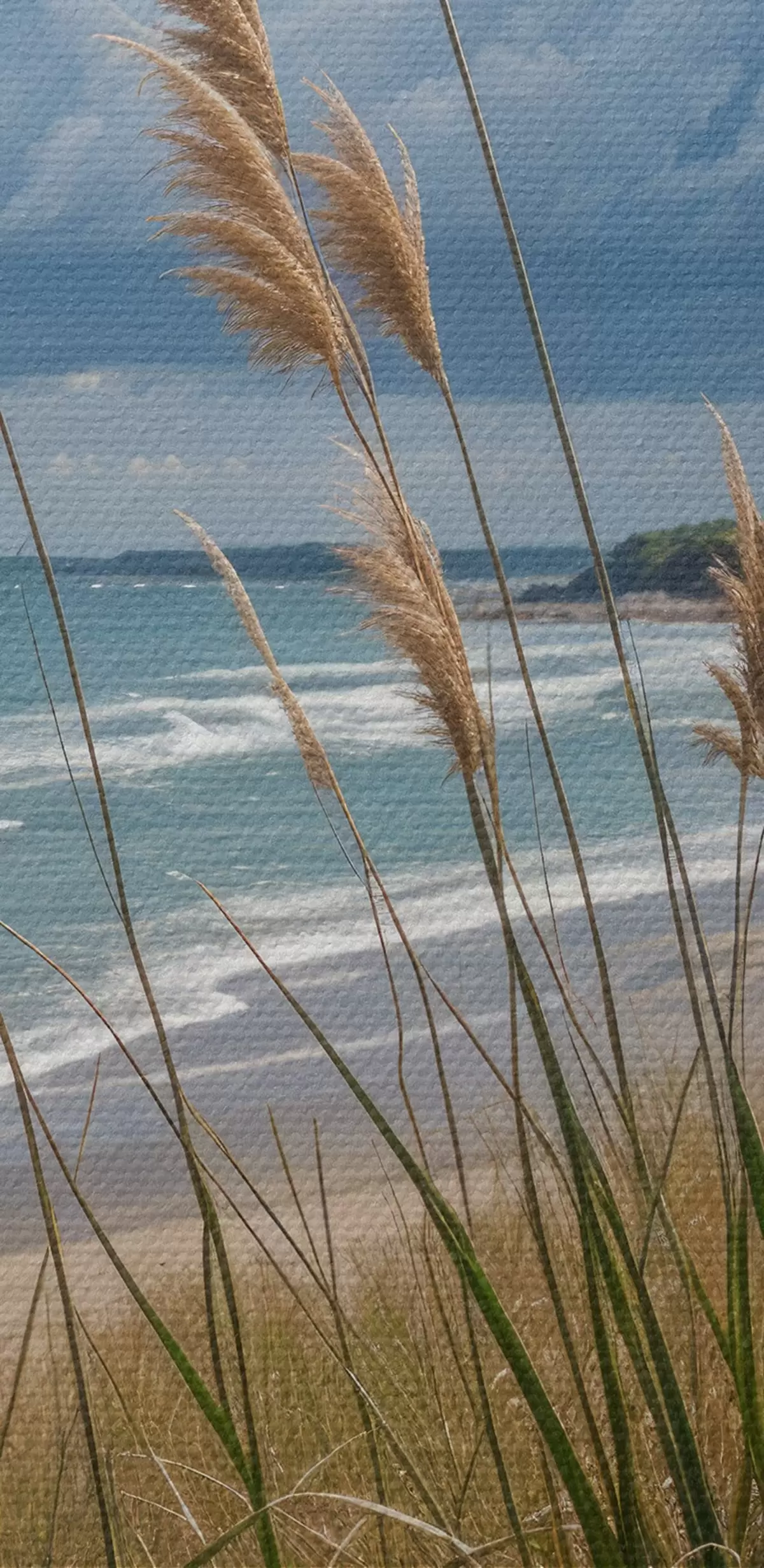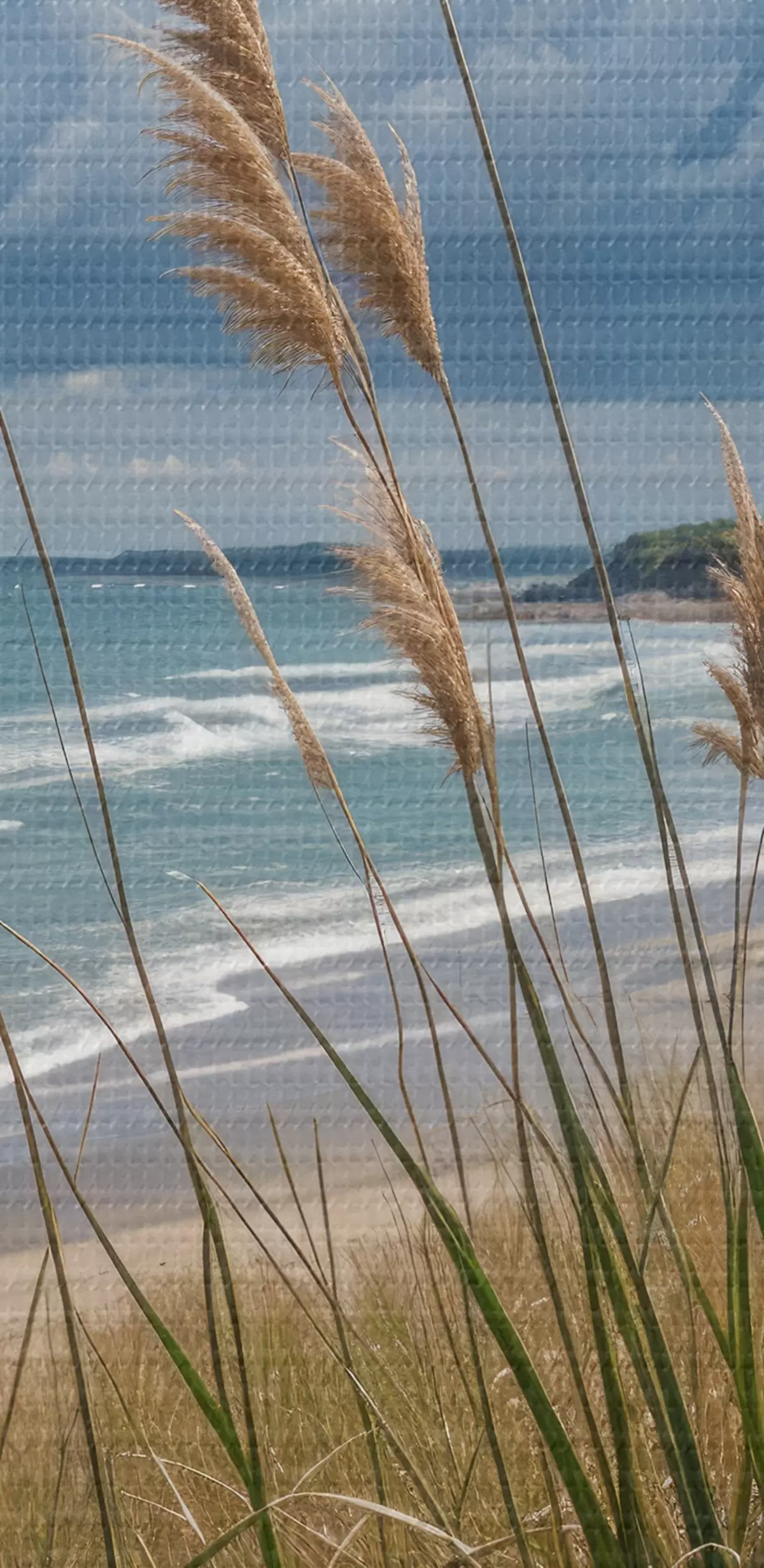 Afbeelding Een schilderachtig strand met hoog gras dat in de wind wuift, met uitzicht op de oceaan met beukende golven en een bewolkte lucht Nr r40161