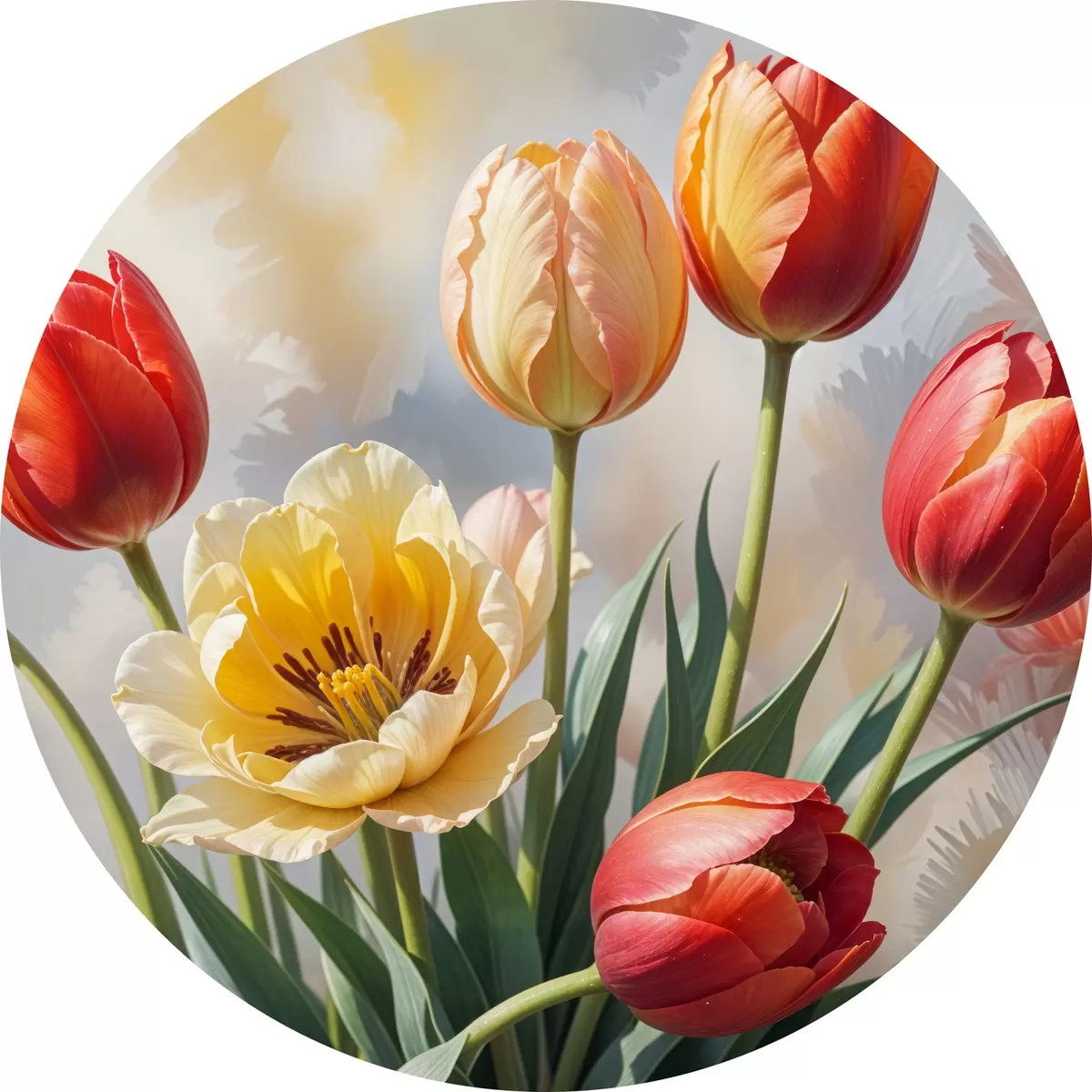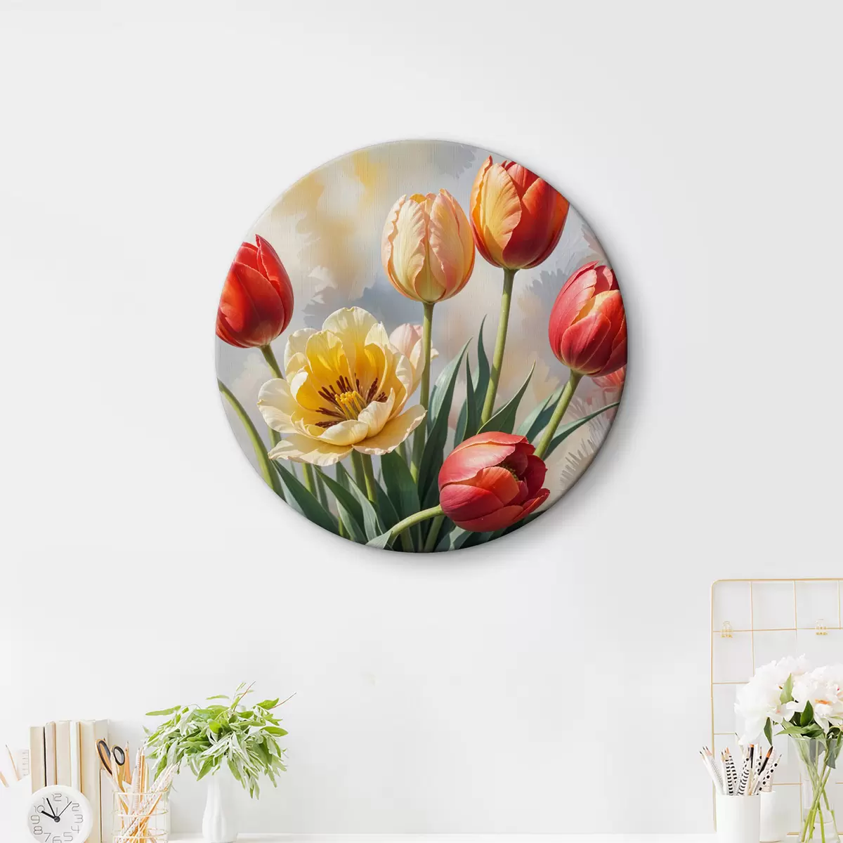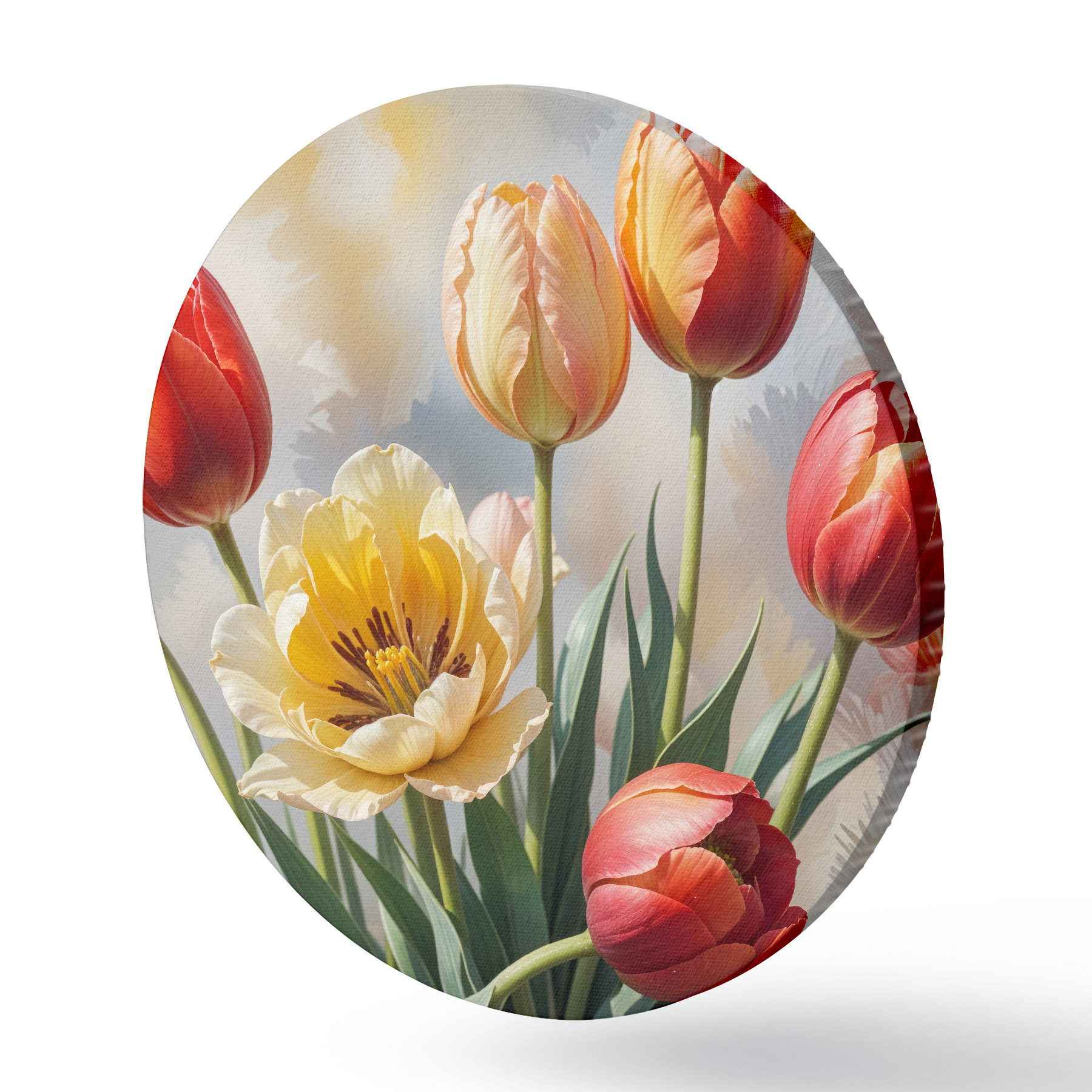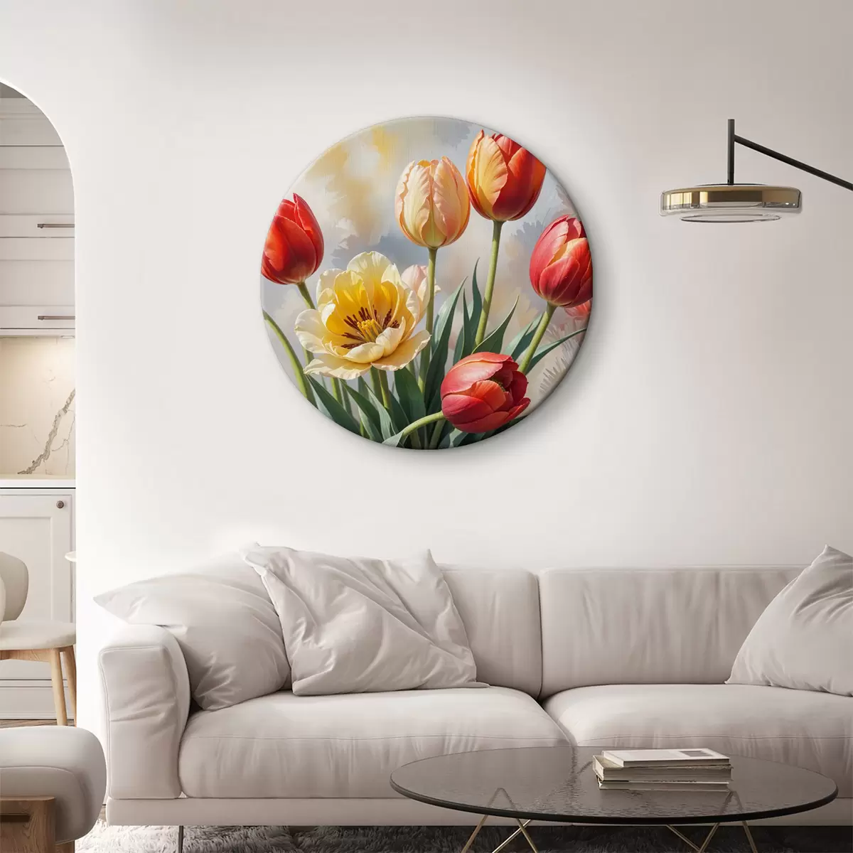 Ronde schilderijen Kleurrijke tulpen in verschillende tinten rood, oranje en geel tegen een lichte achtergrond r40167