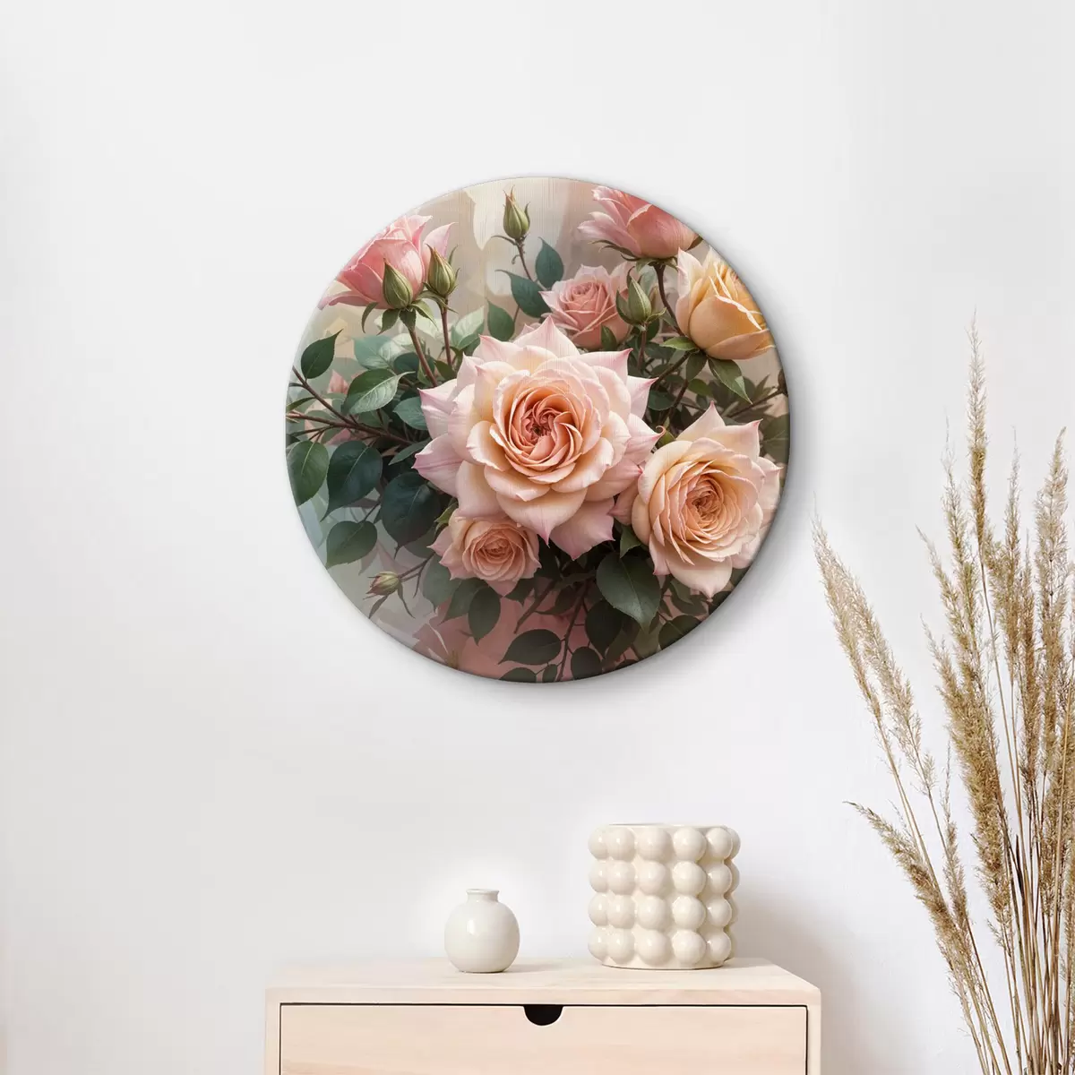 Ronde schilderijen Een boeket van prachtige roze rozen met groene bladeren tegen een zachte, wazige achtergrond r40168