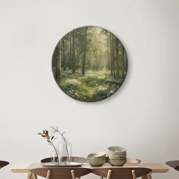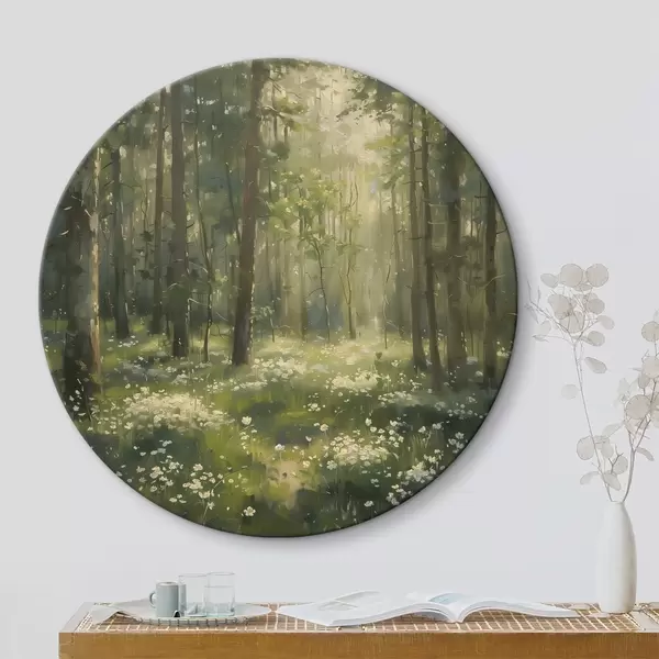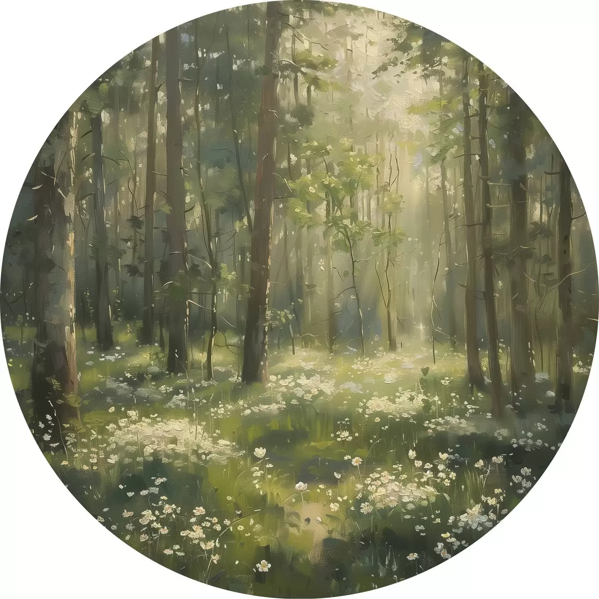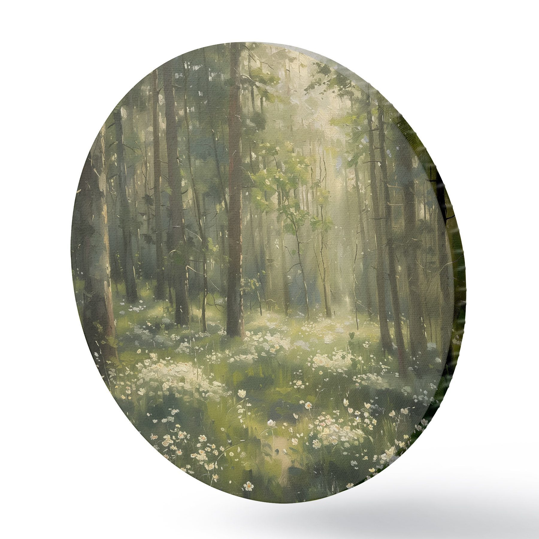 Ronde schilderijen Bos met zonlicht in de bomen, kamillebloemen, groen gras, acryltekening r40226