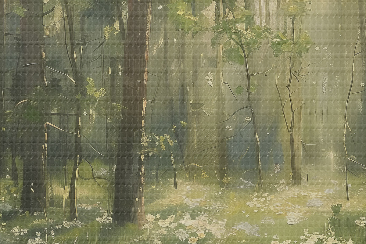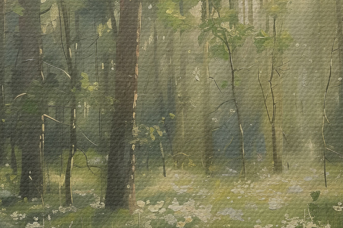 Afbeelding Bos met zonlicht in de bomen, kamillebloemen, groen gras, acryltekening Nr r40226