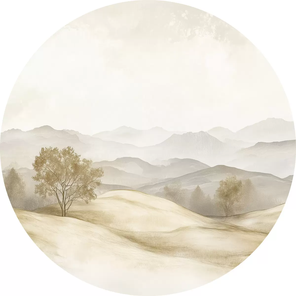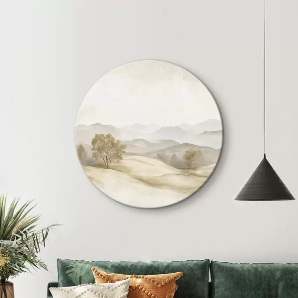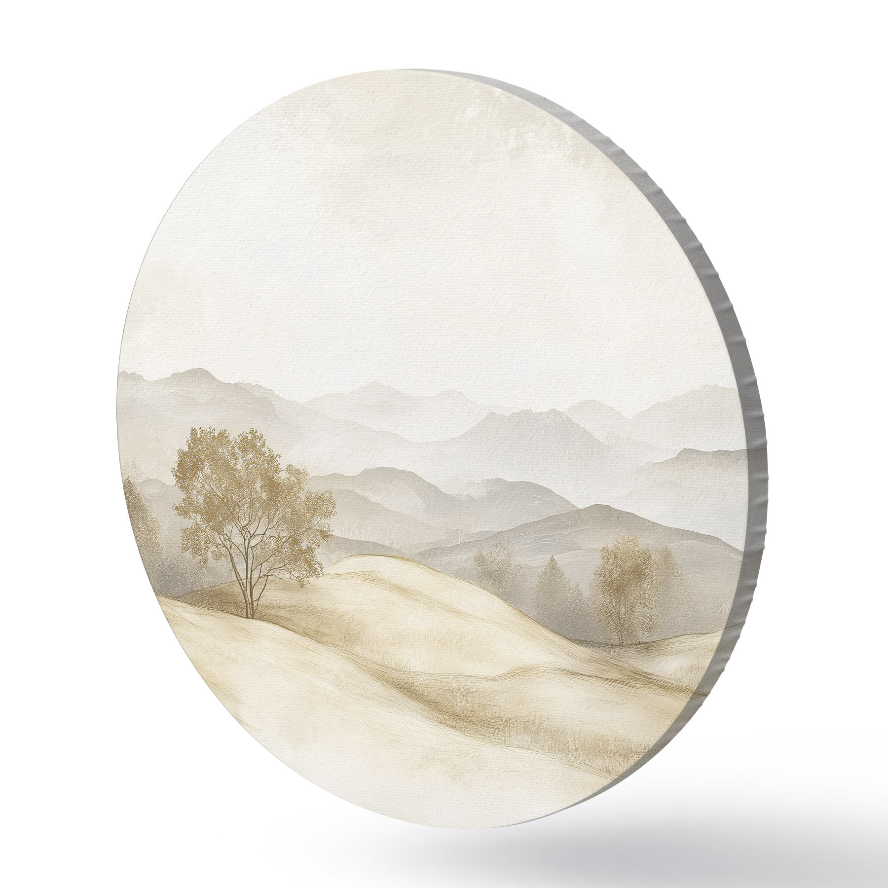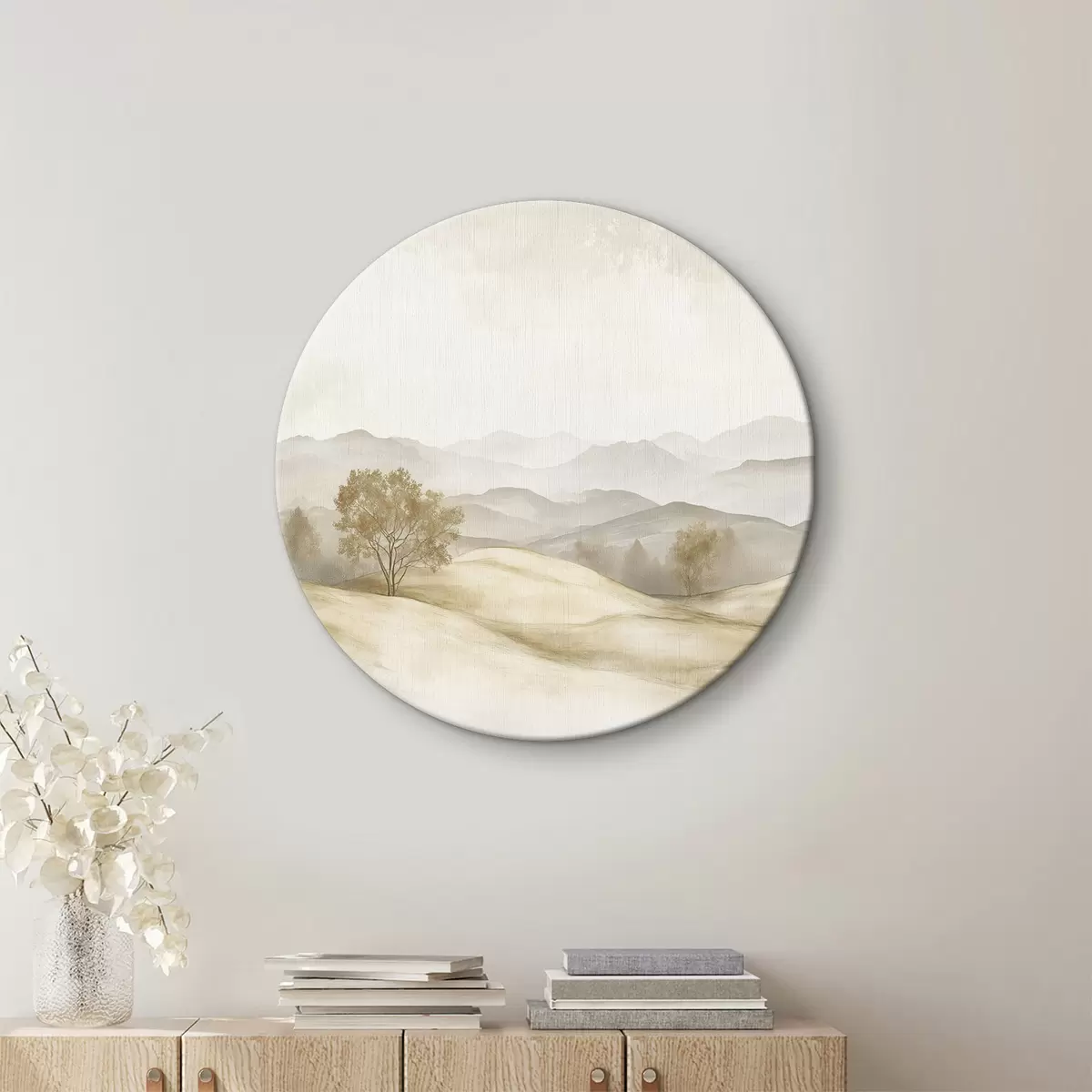 Ronde schilderijen Natuurlandschap in beige kleurenpalet, weide, bomen, aquareltekening r40231