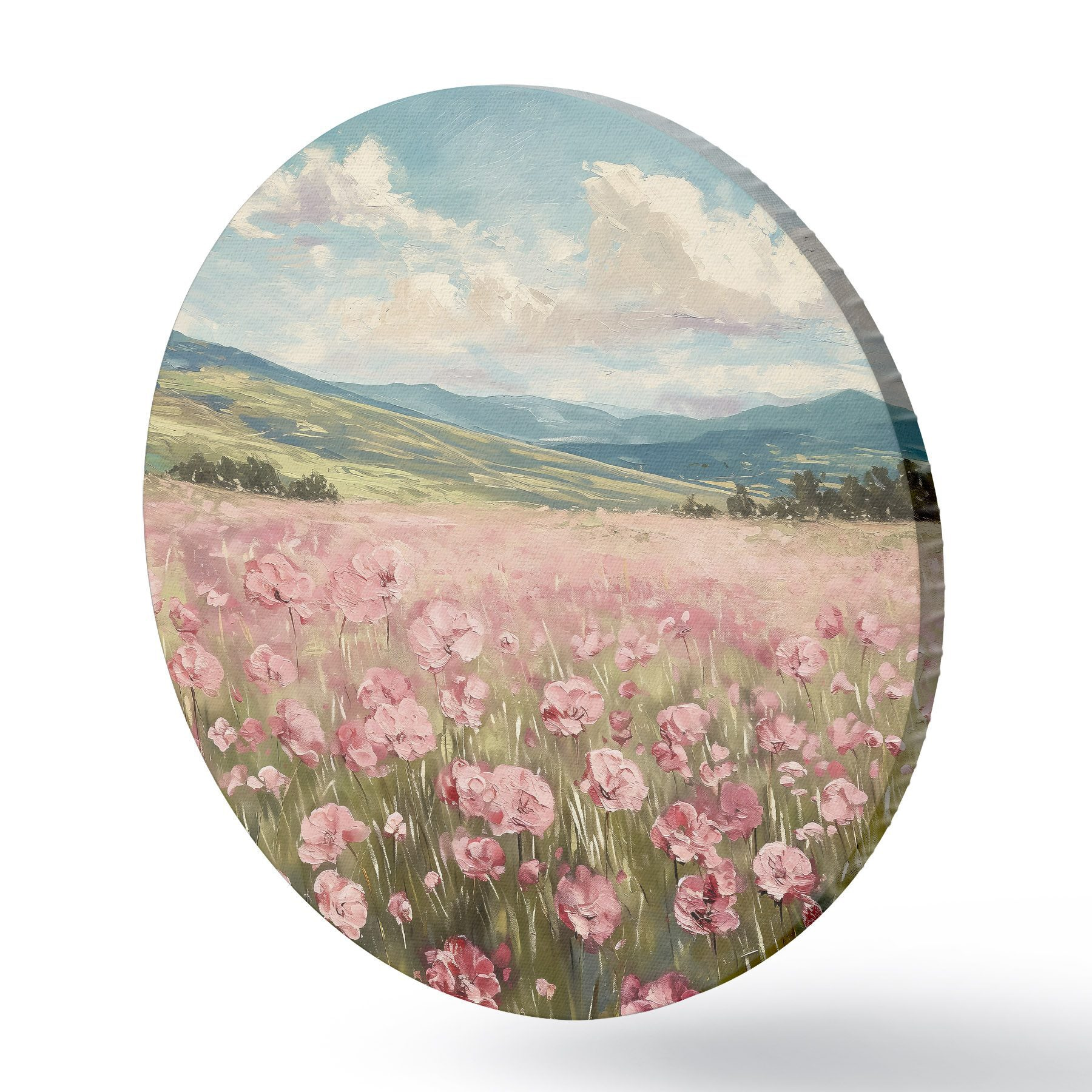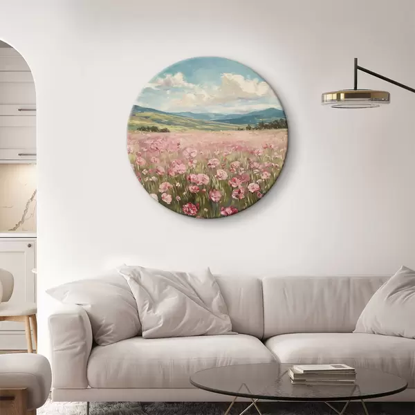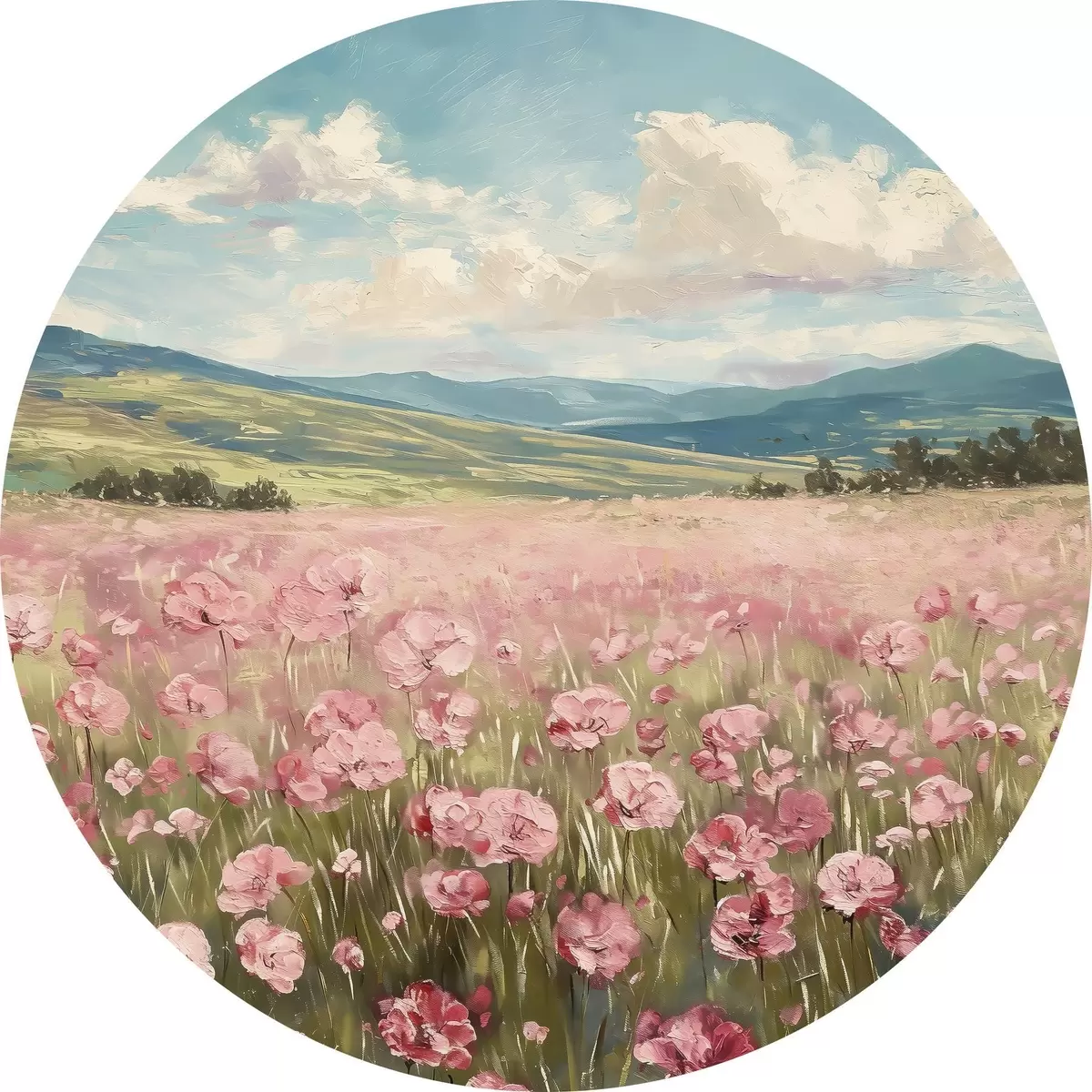 Ronde schilderijen Weide met roze bloemen, bergen, natuurlandschap, blauwe lucht met wolken, acryl r40232